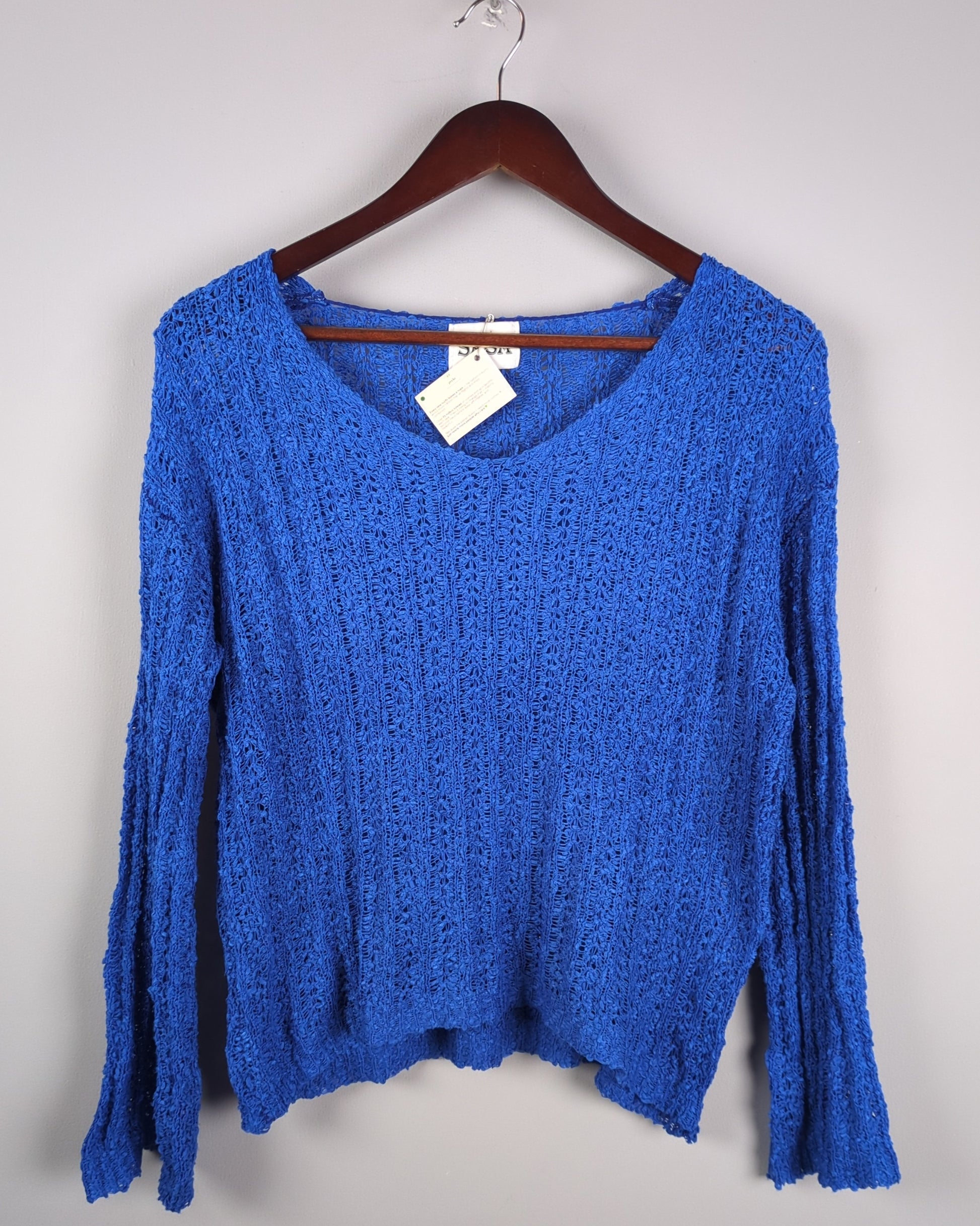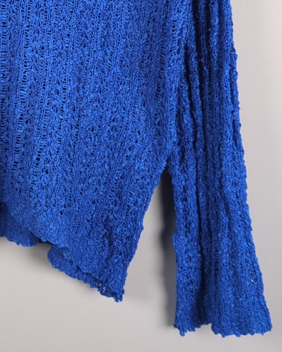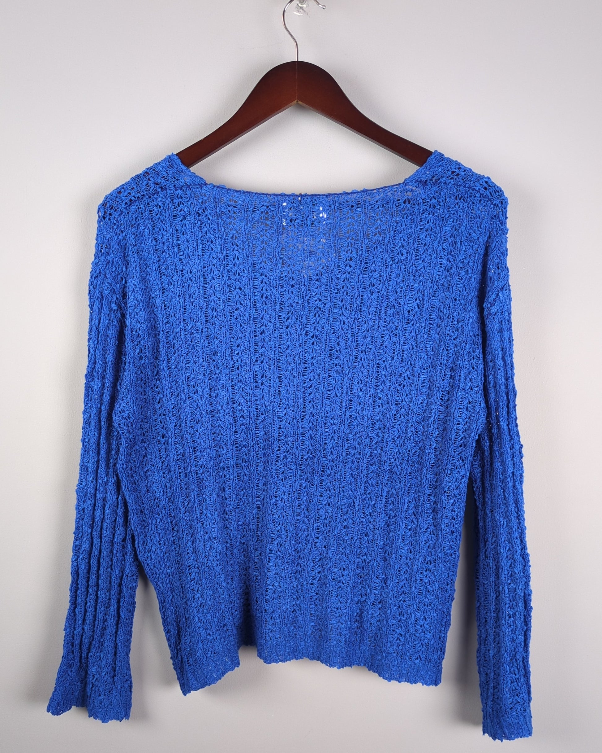 A bright blue long-sleeved top featuring a relaxed open-knit texture and a flattering V-neckline.