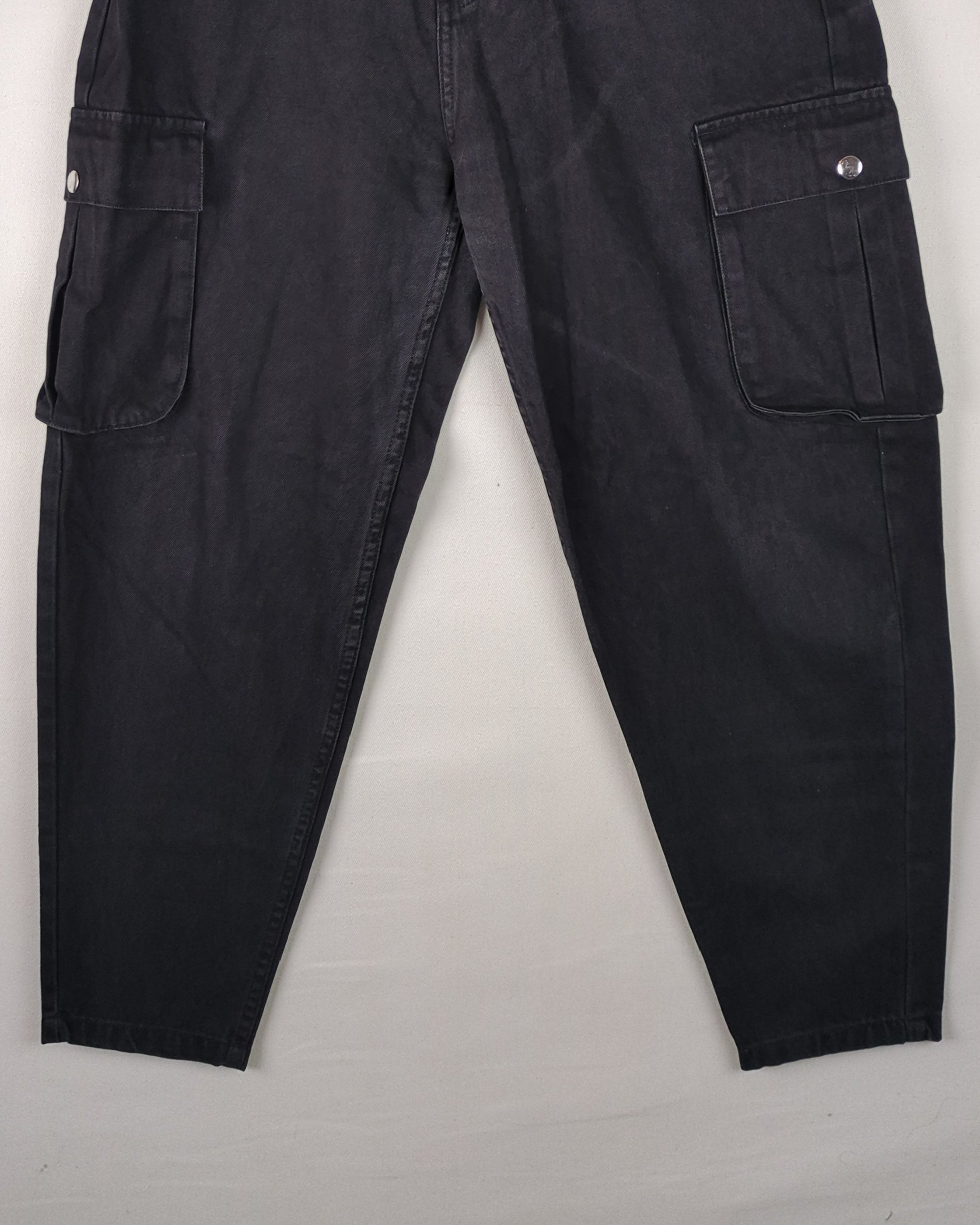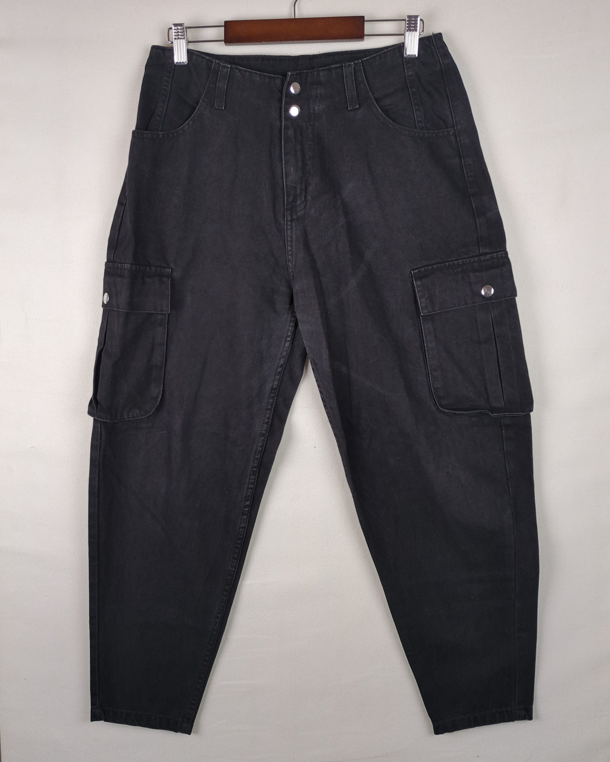 Edgy black denim cargo pants featuring a high-waisted fit and functional utility pockets.