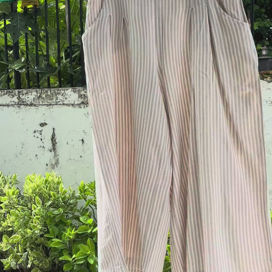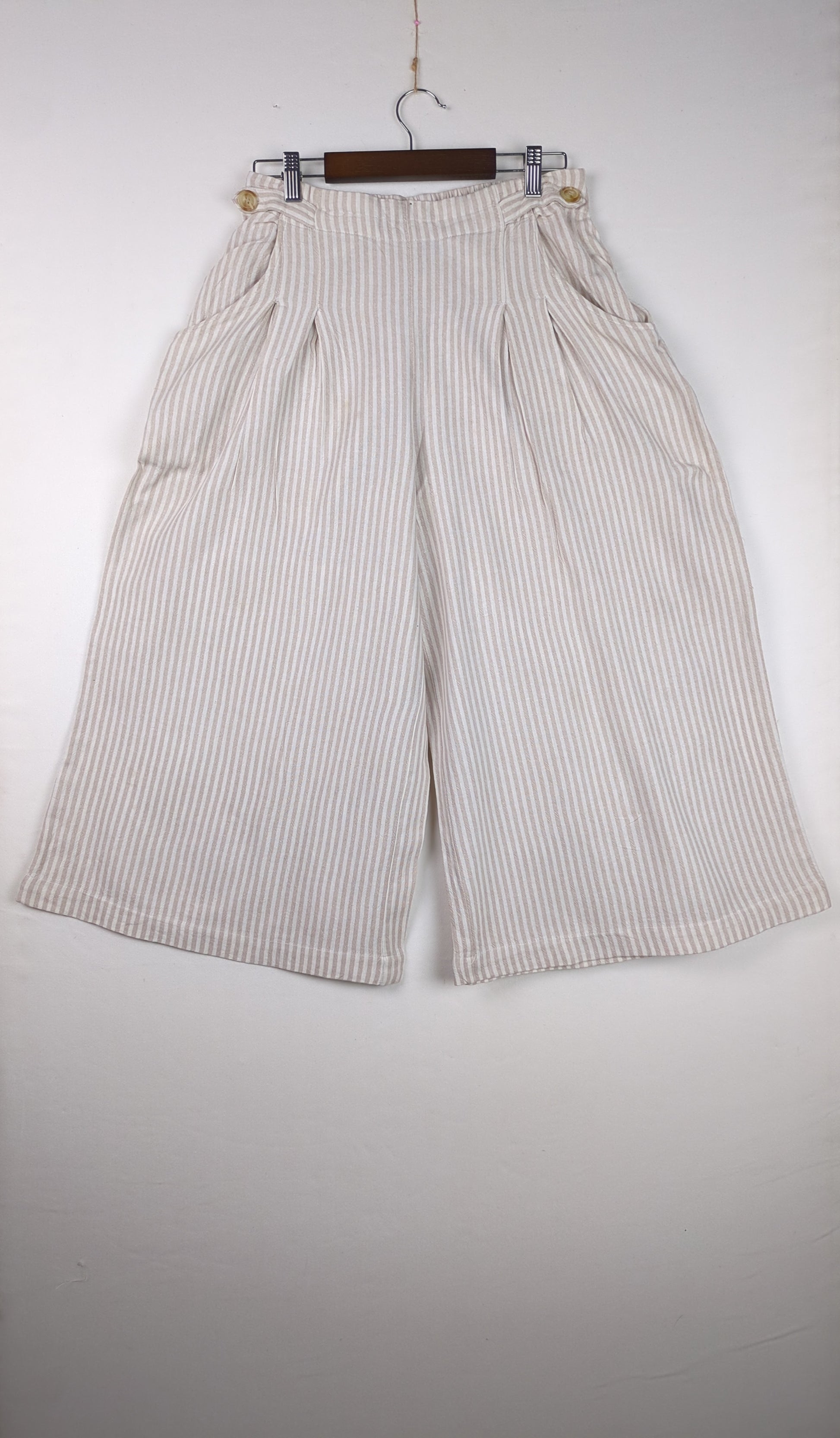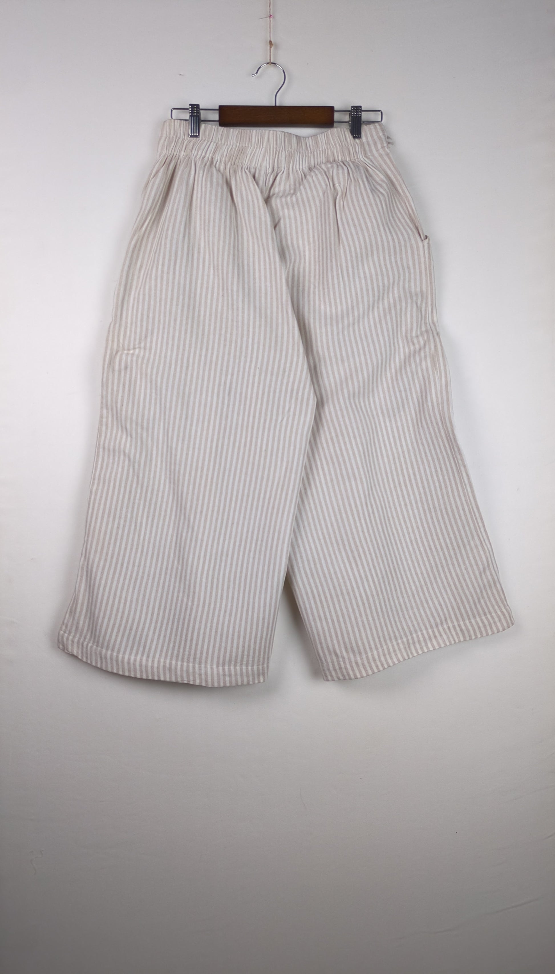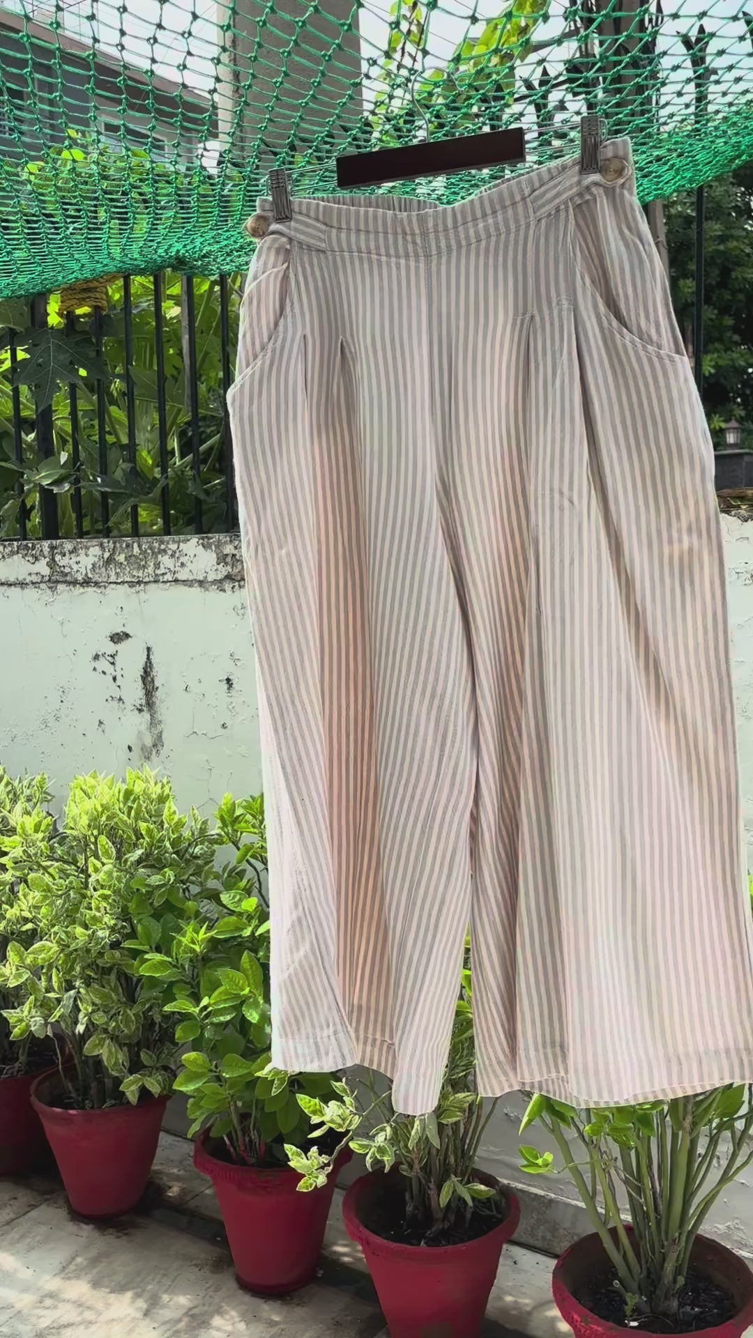 These beige and white striped wide leg pants feature two buttons on the waistband.
