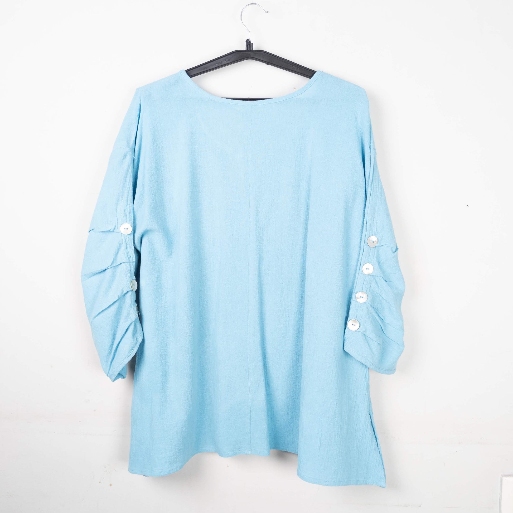 This is a relaxed fit blue blouse with a v-neck and button detailing.