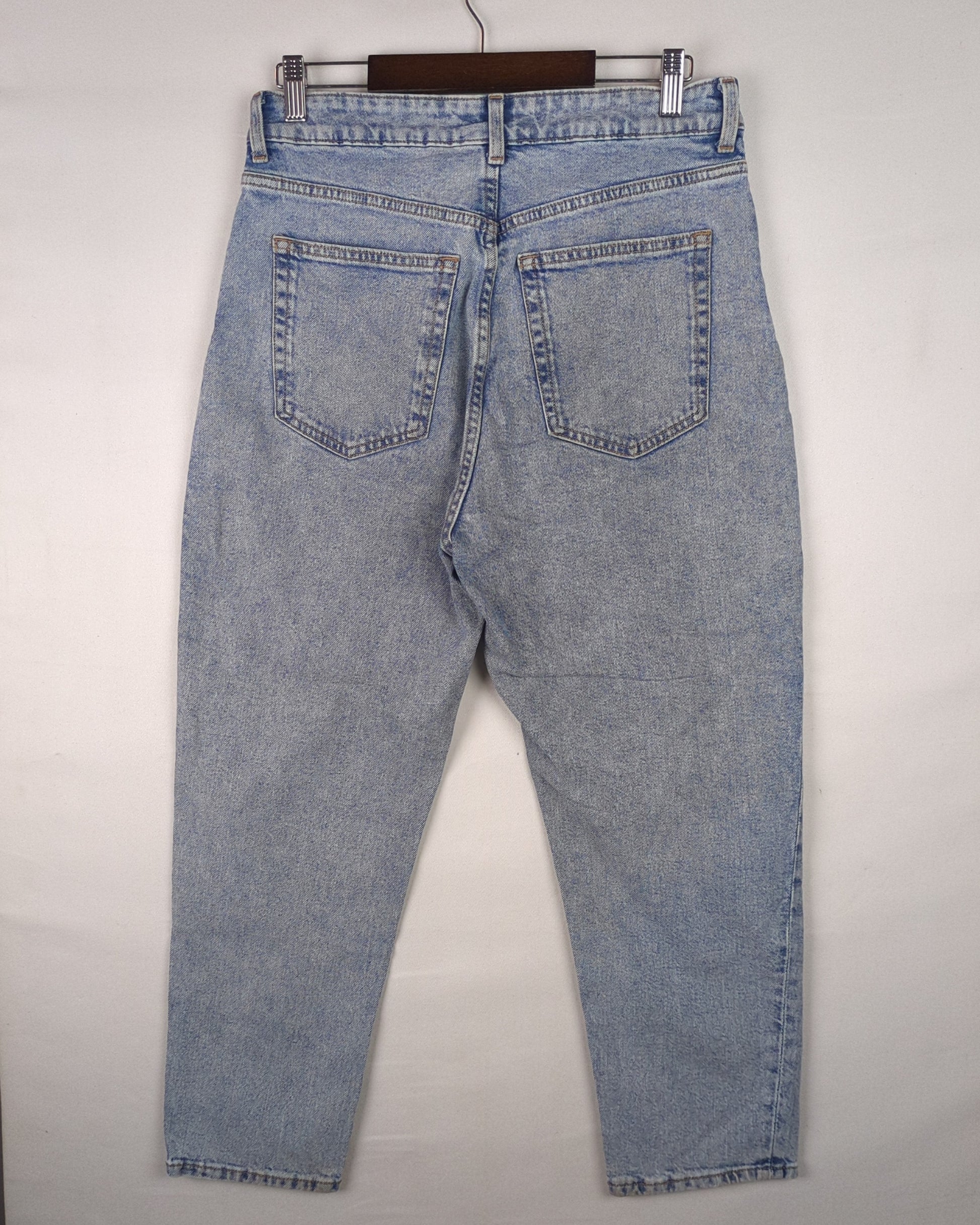 Classic light-wash mom jeans with a relaxed tapered fit and high-rise waist for vintage appeal.