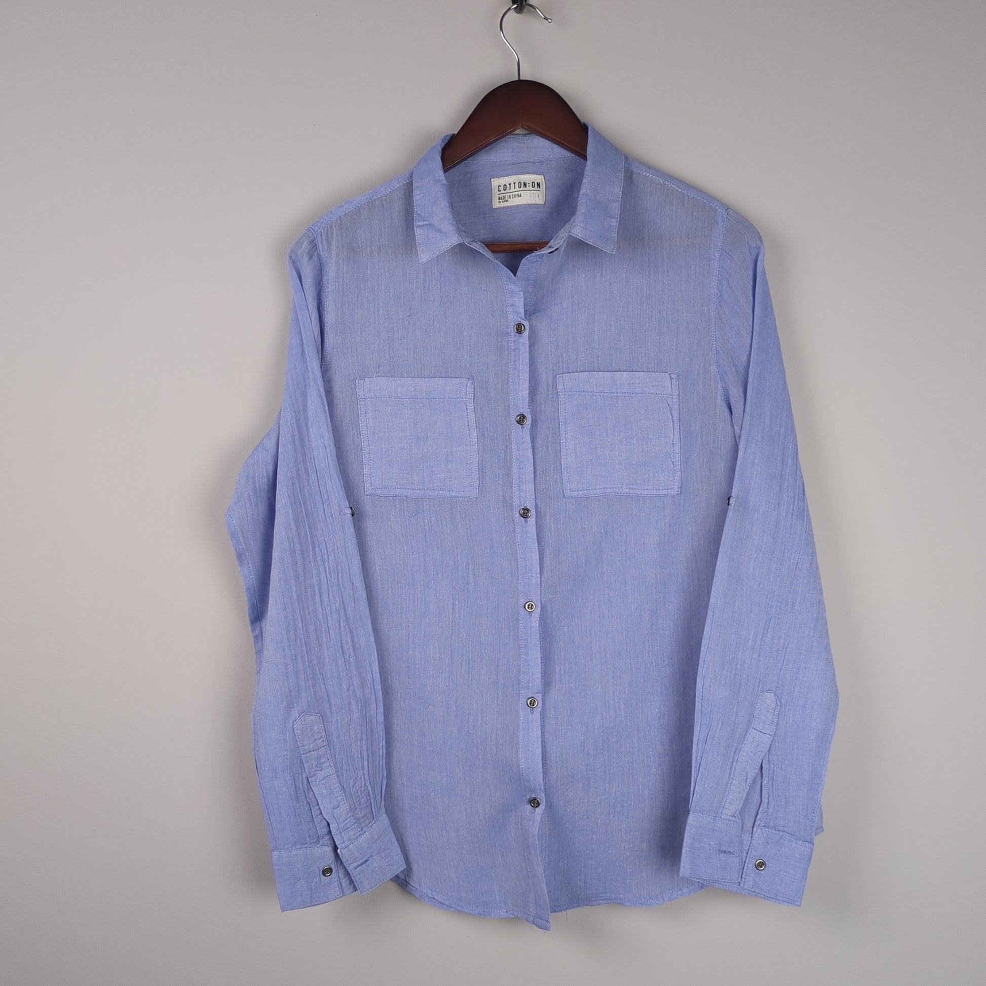 This light blue button down shirt is perfect for a casual summer day.