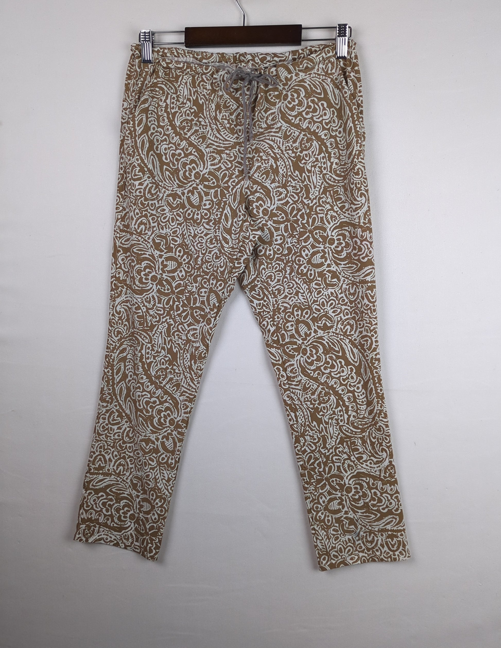 These brown paisley print pants feature an elastic waistband and a relaxed fit.