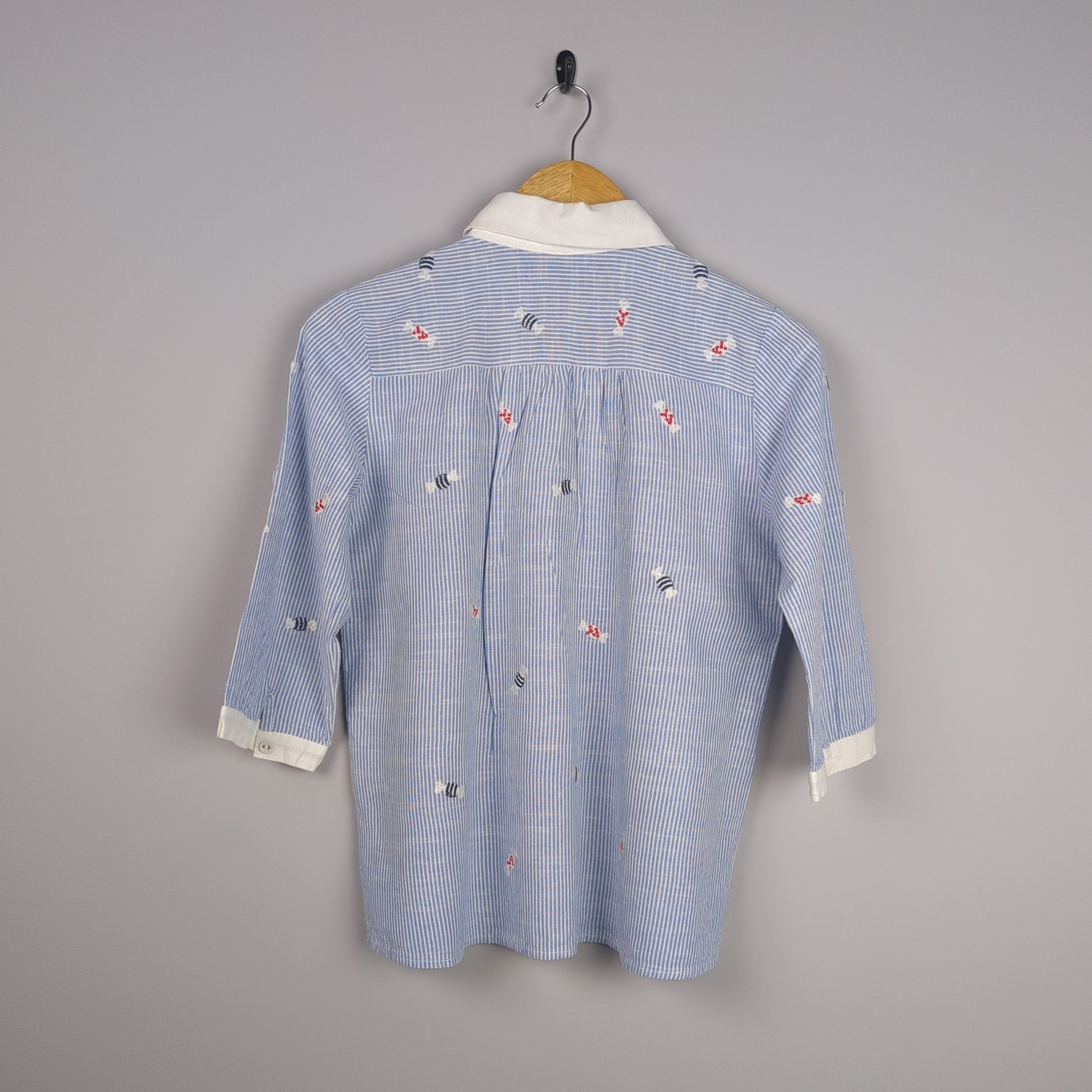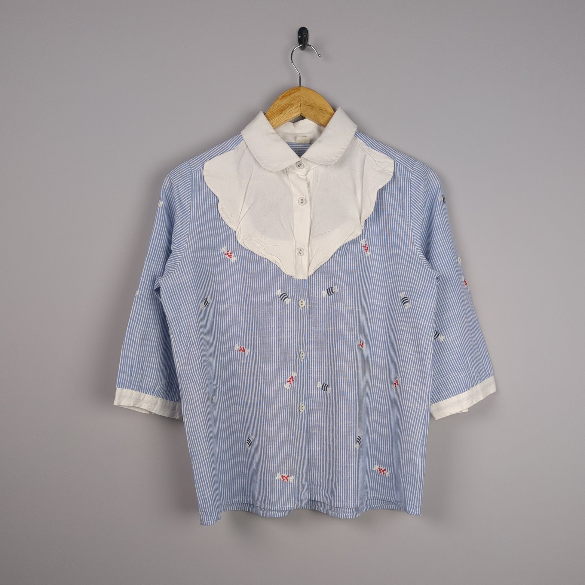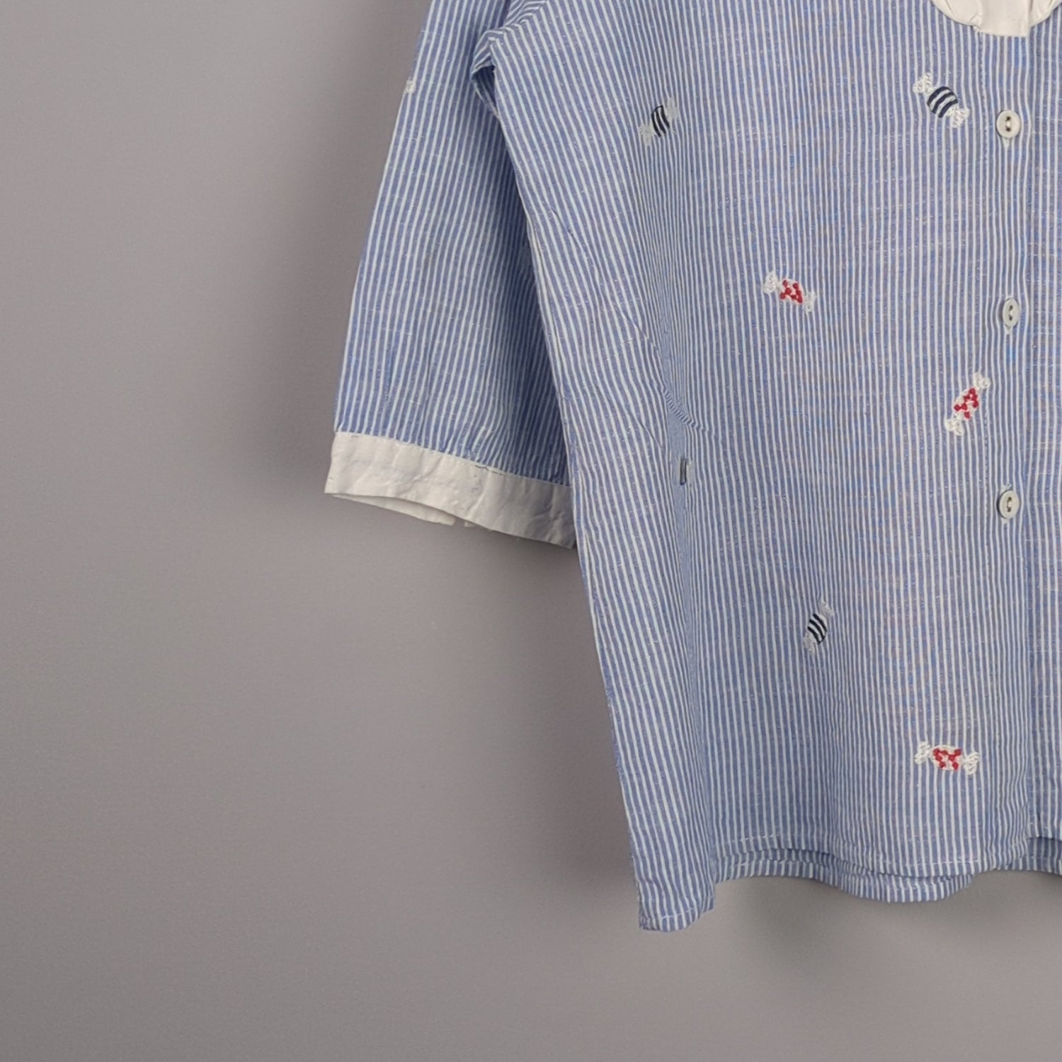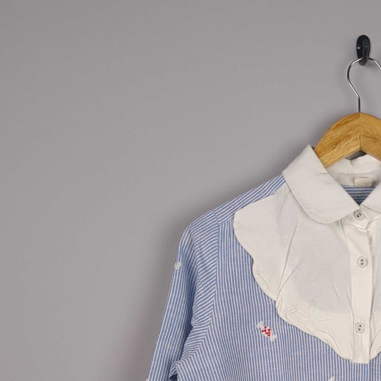 This light blue, vertically striped shirt features a white bib-like front and small candy-shaped embroidery details.
