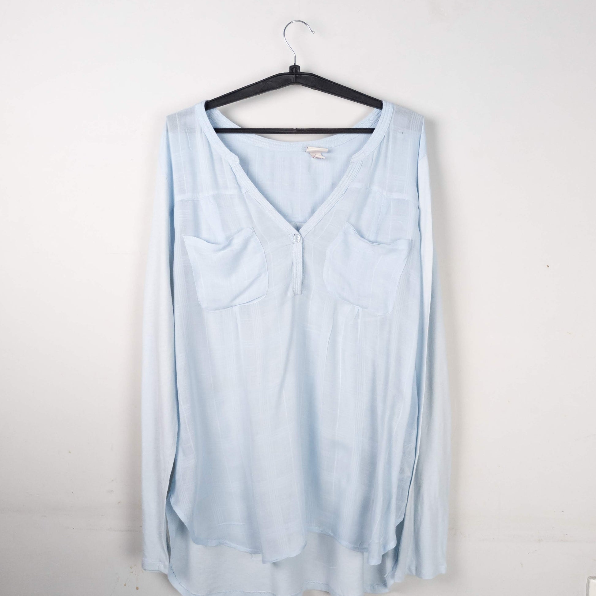 This light blue blouse features long sleeves, a v-neck, two chest pockets and a button.