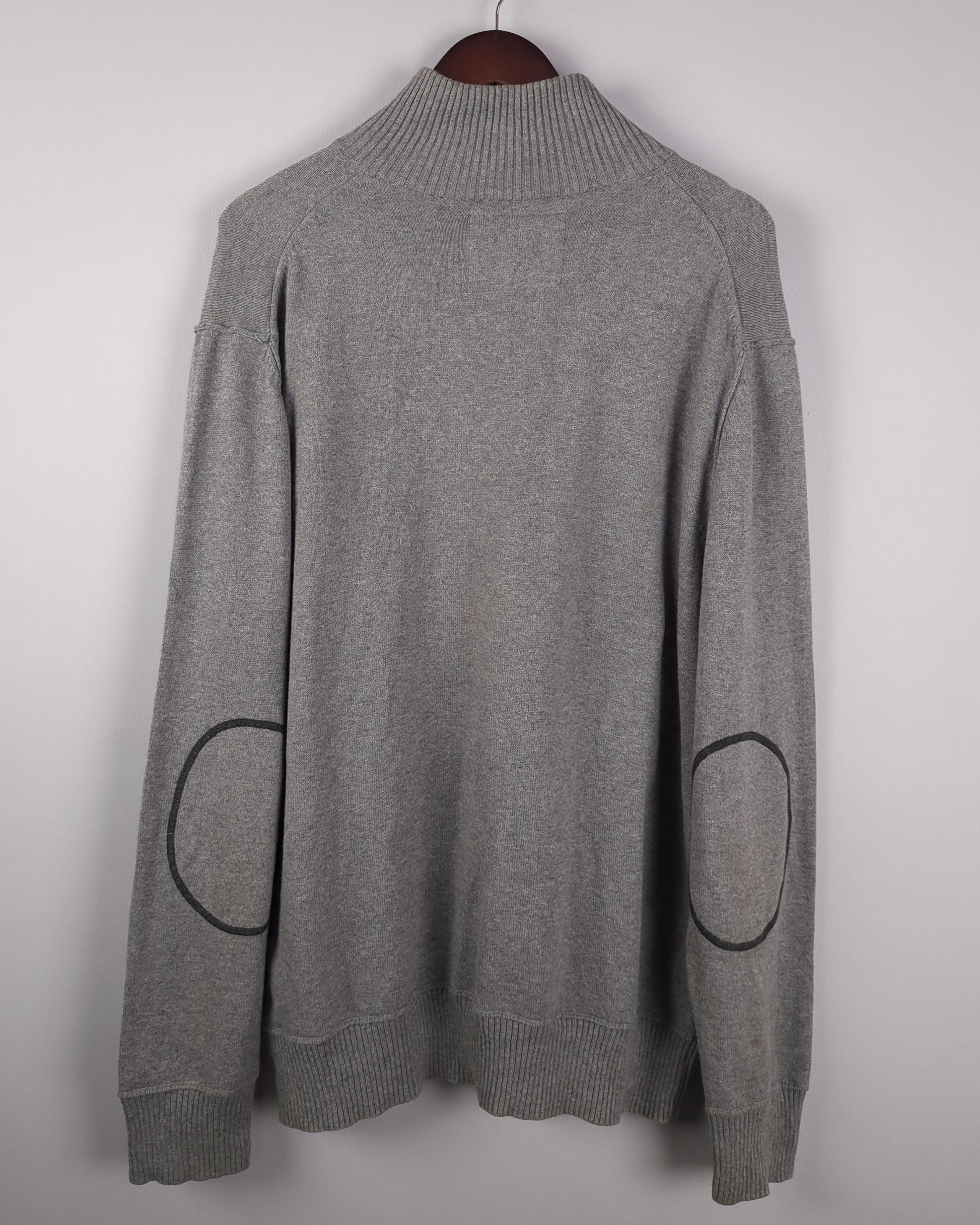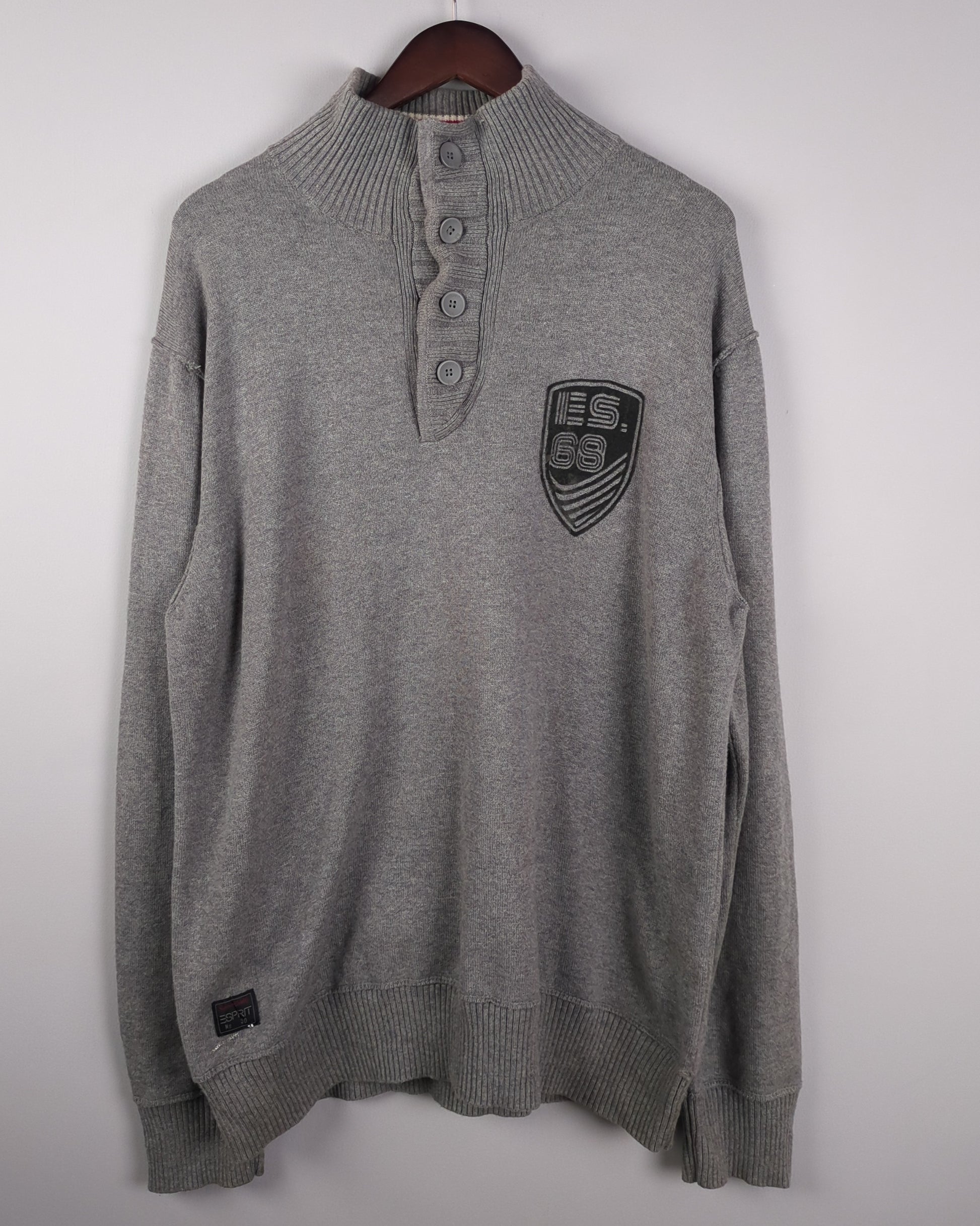 A comfortable gray sweater featuring a button-up mock neck and a decorative chest patch.