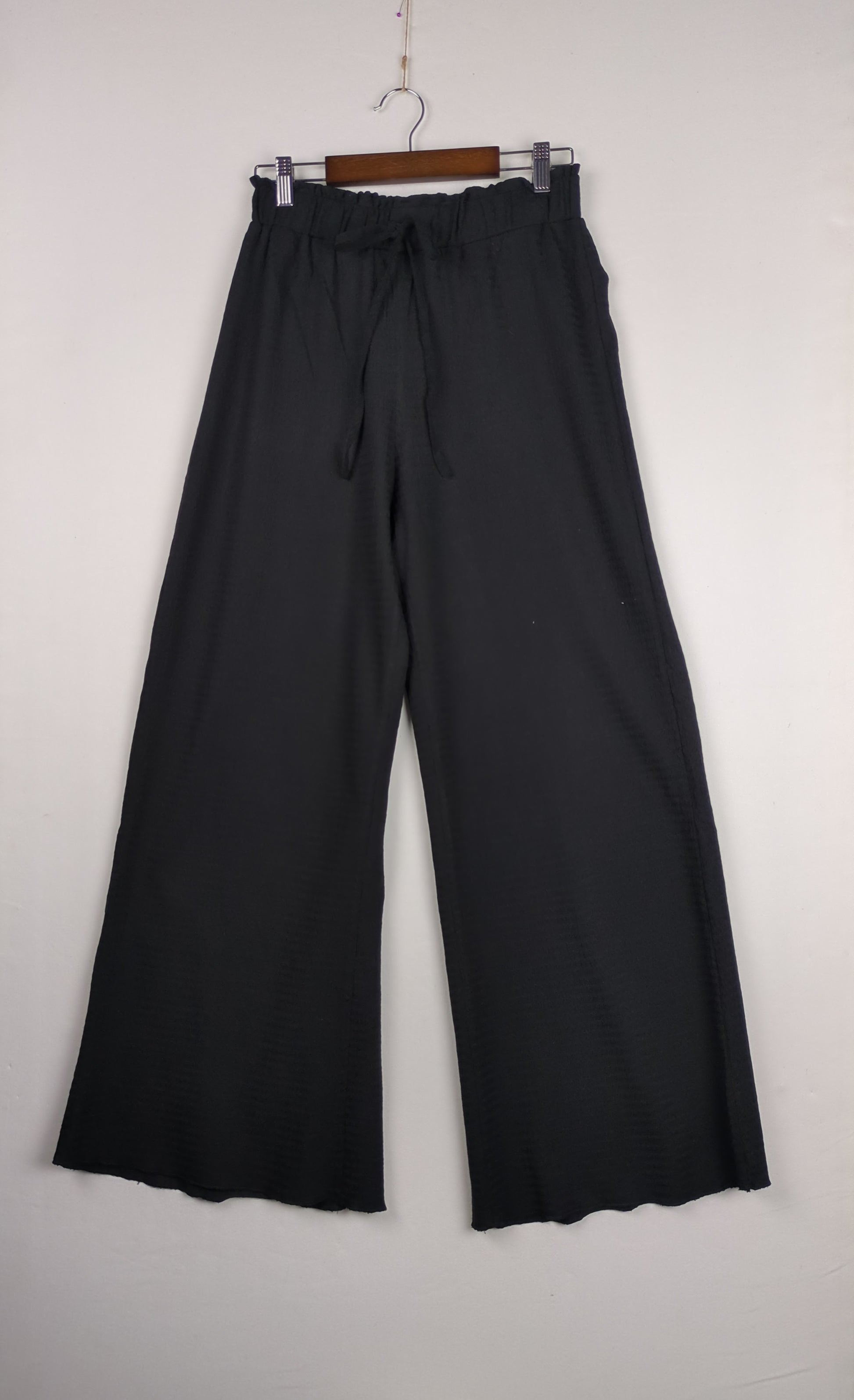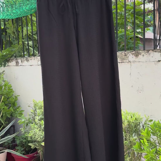 These black wide-leg pants feature a drawstring waist for a relaxed and comfortable fit.