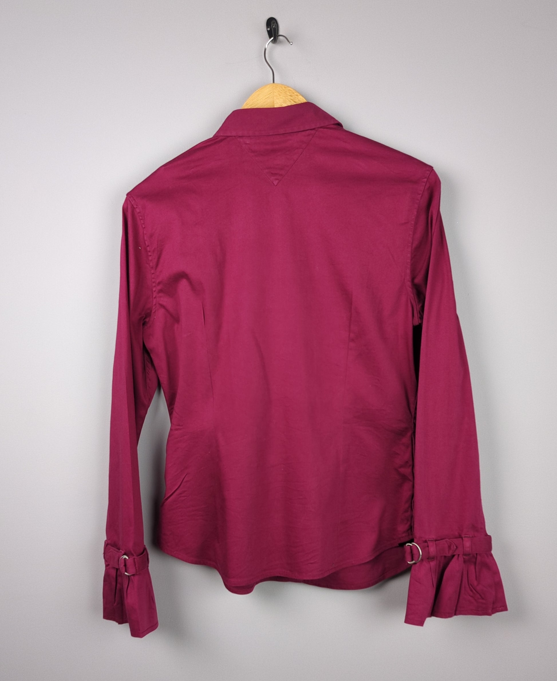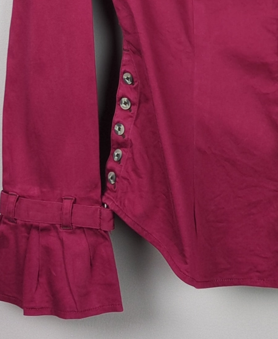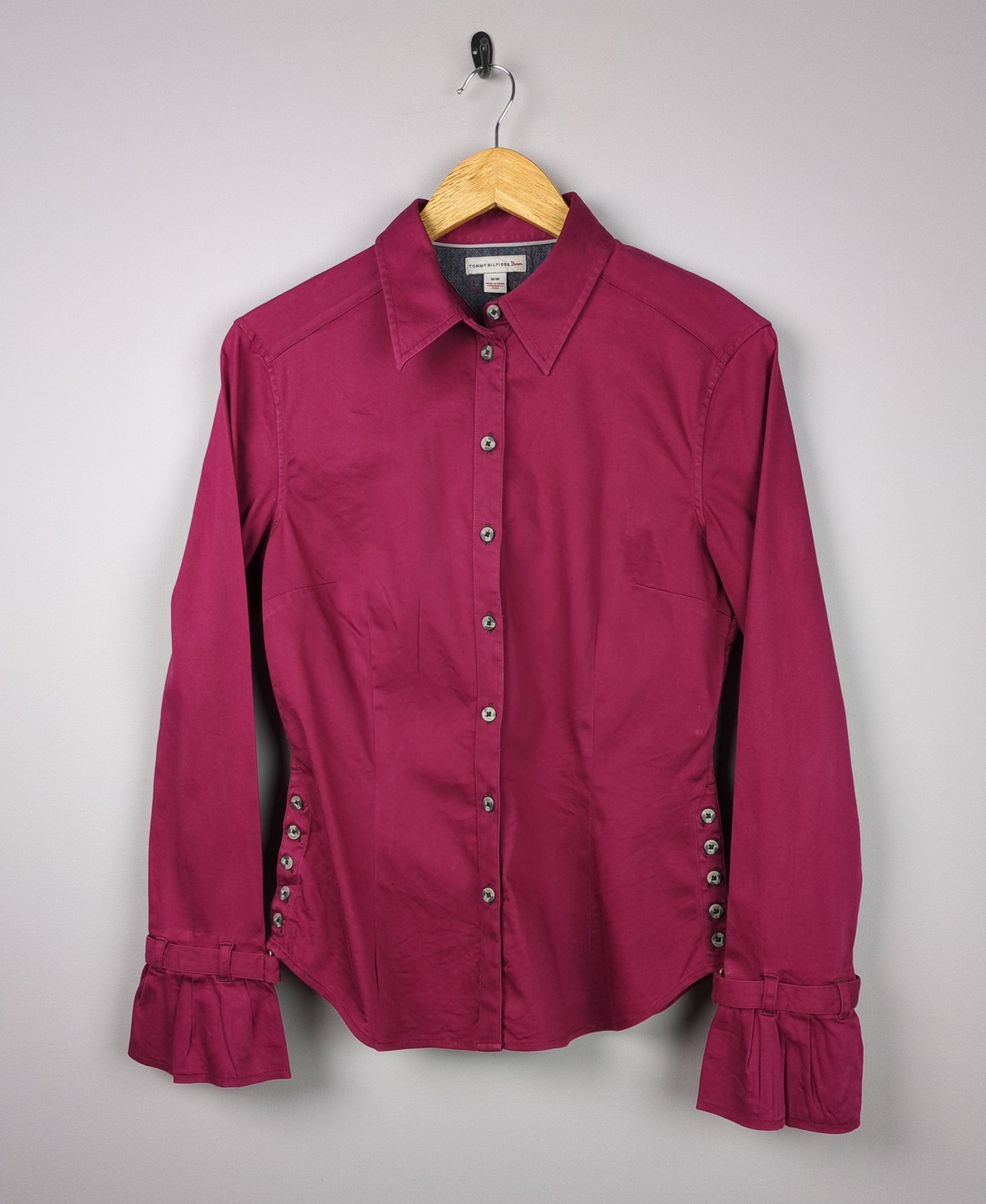 This crimson button-down shirt features long sleeves with unique pleated cuffs and a fitted silhouette.
