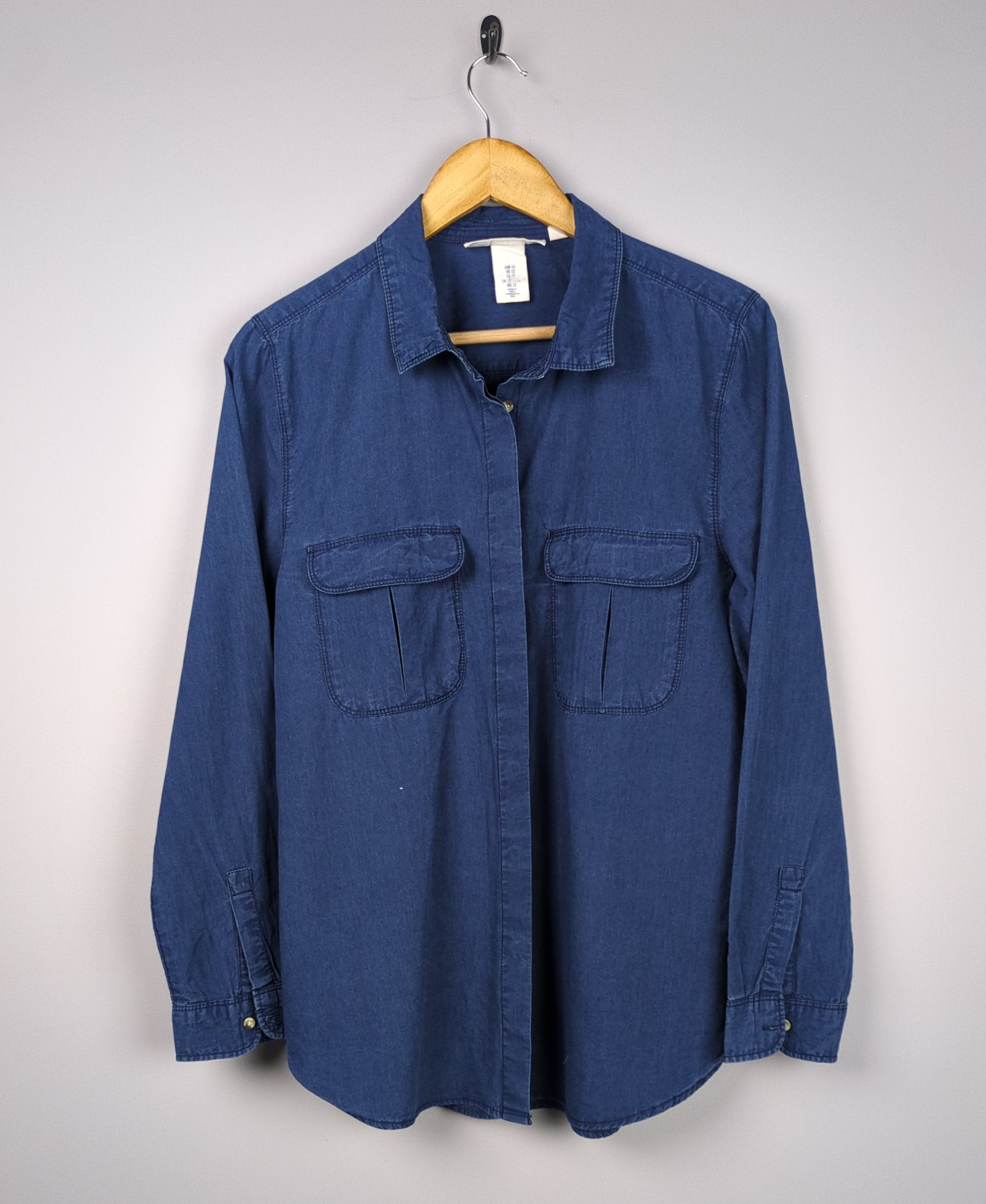 This dark blue denim shirt features two front pockets and a button-down collar.
