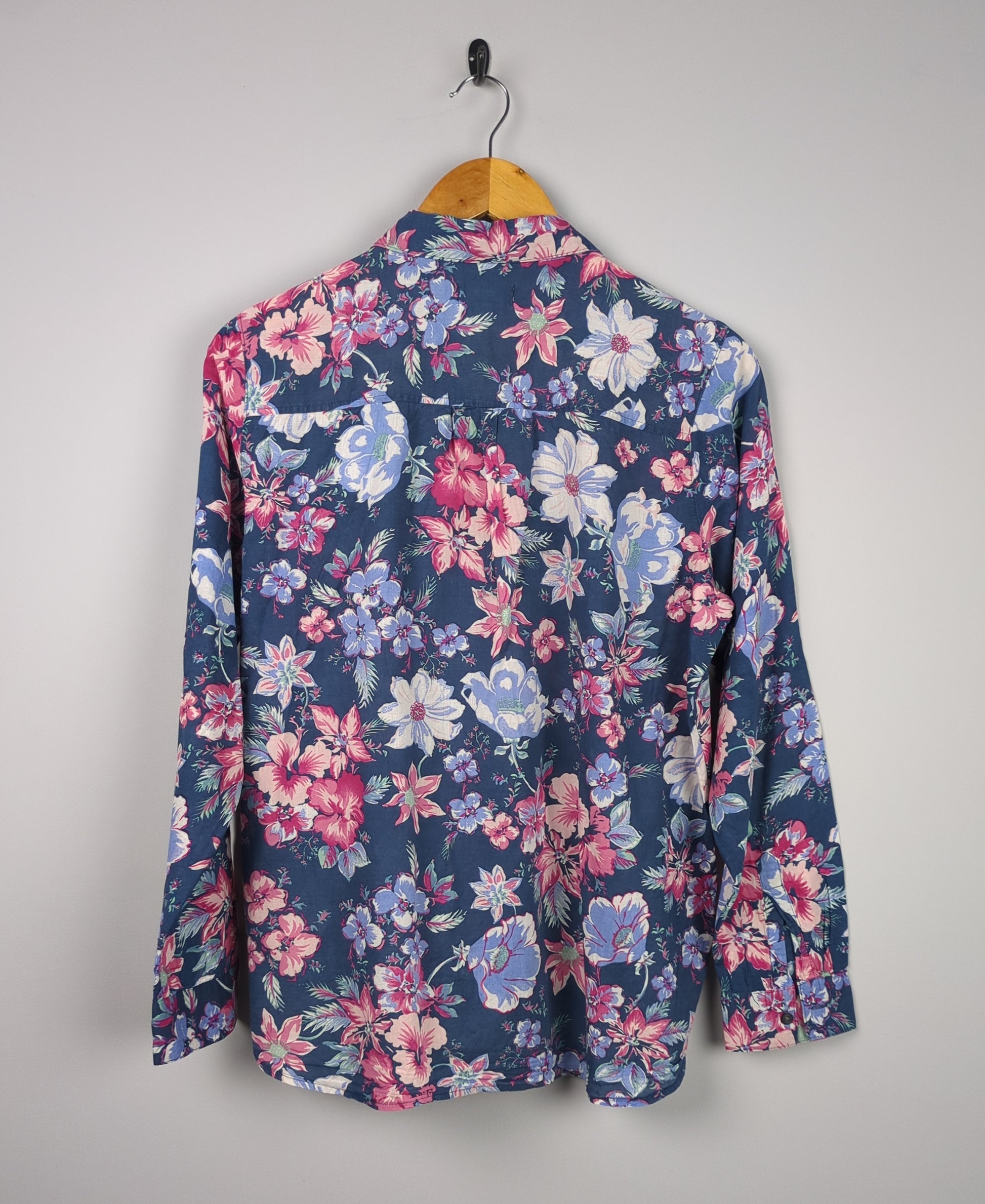 This blue button-down shirt features a vibrant floral pattern.