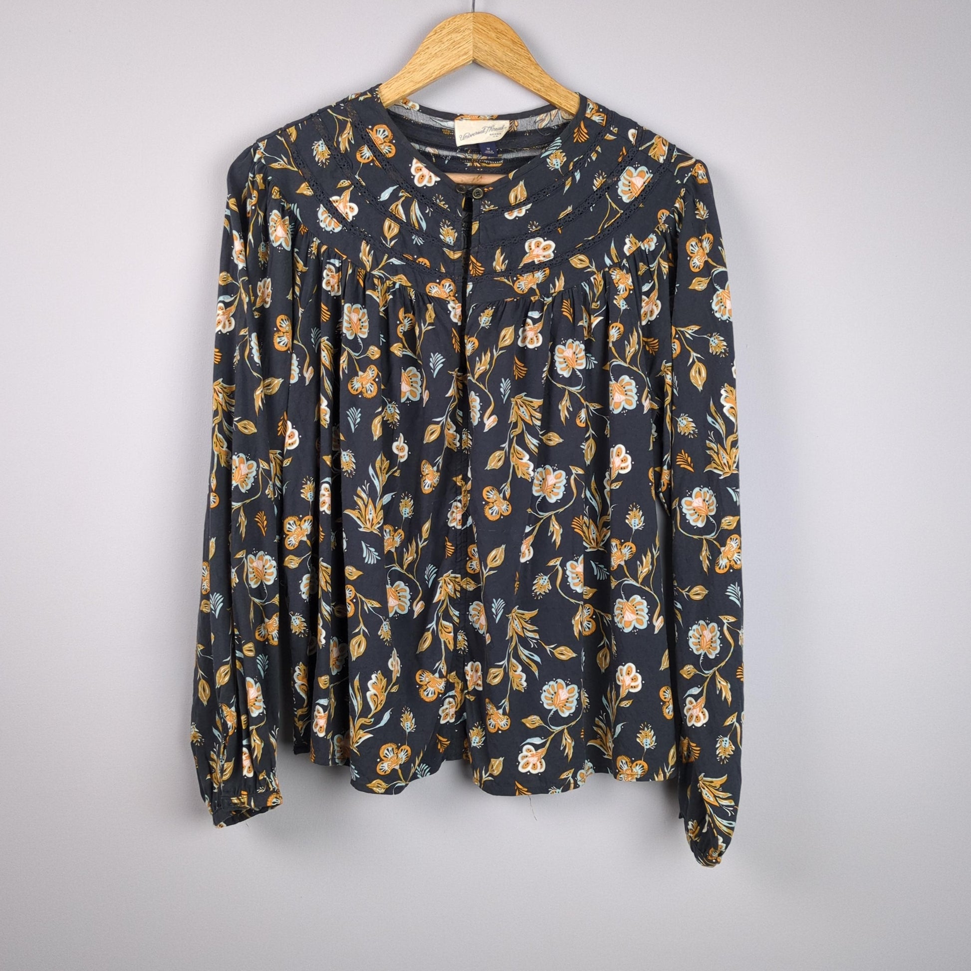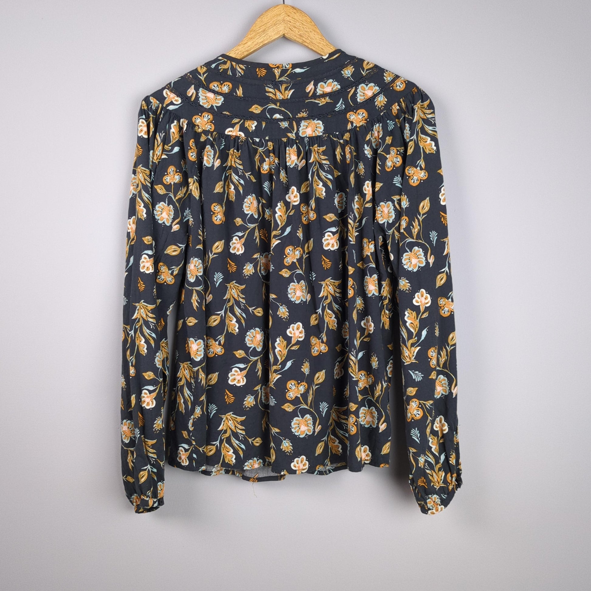 This long sleeve blouse features a charming floral print, perfect for adding a touch of whimsy to your wardrobe.