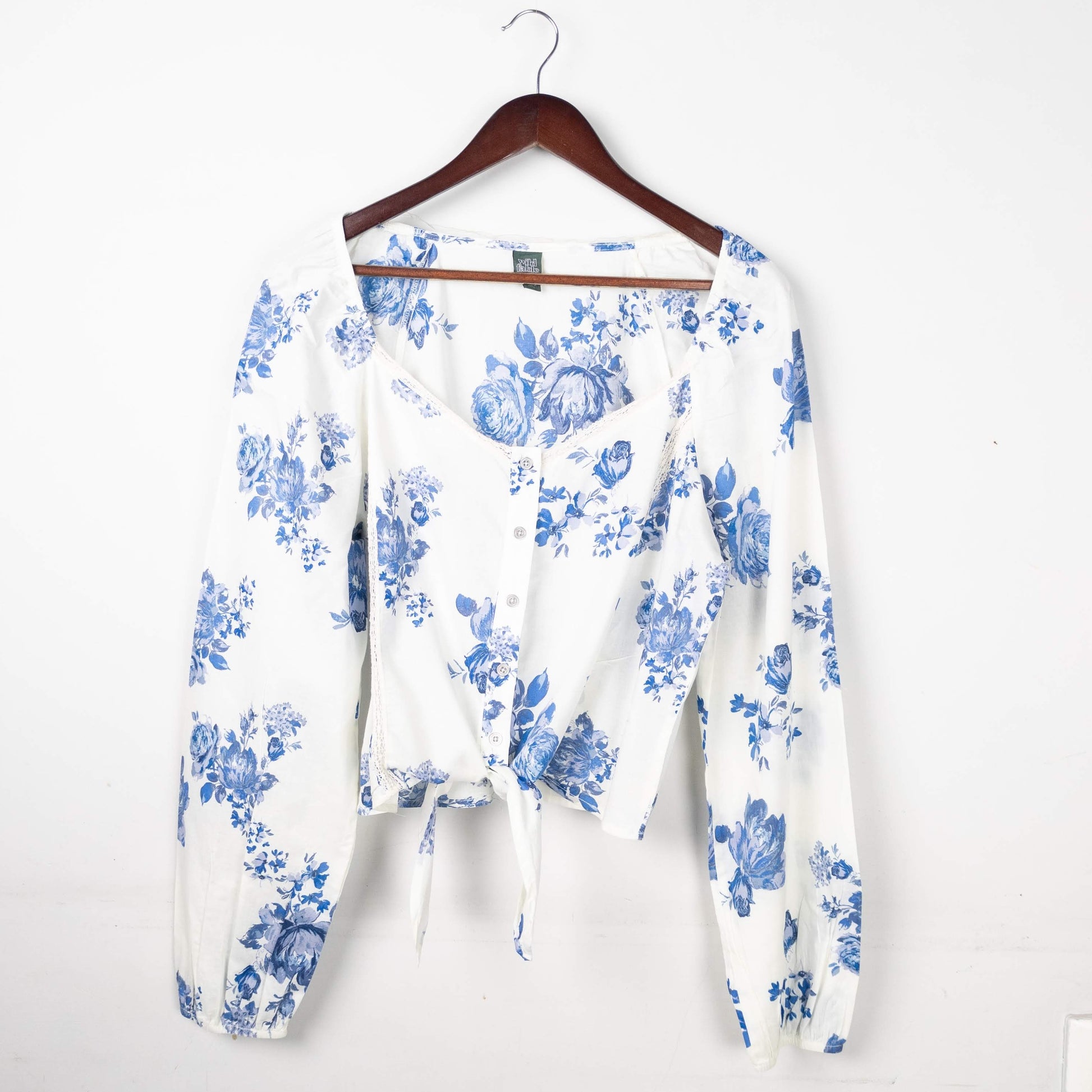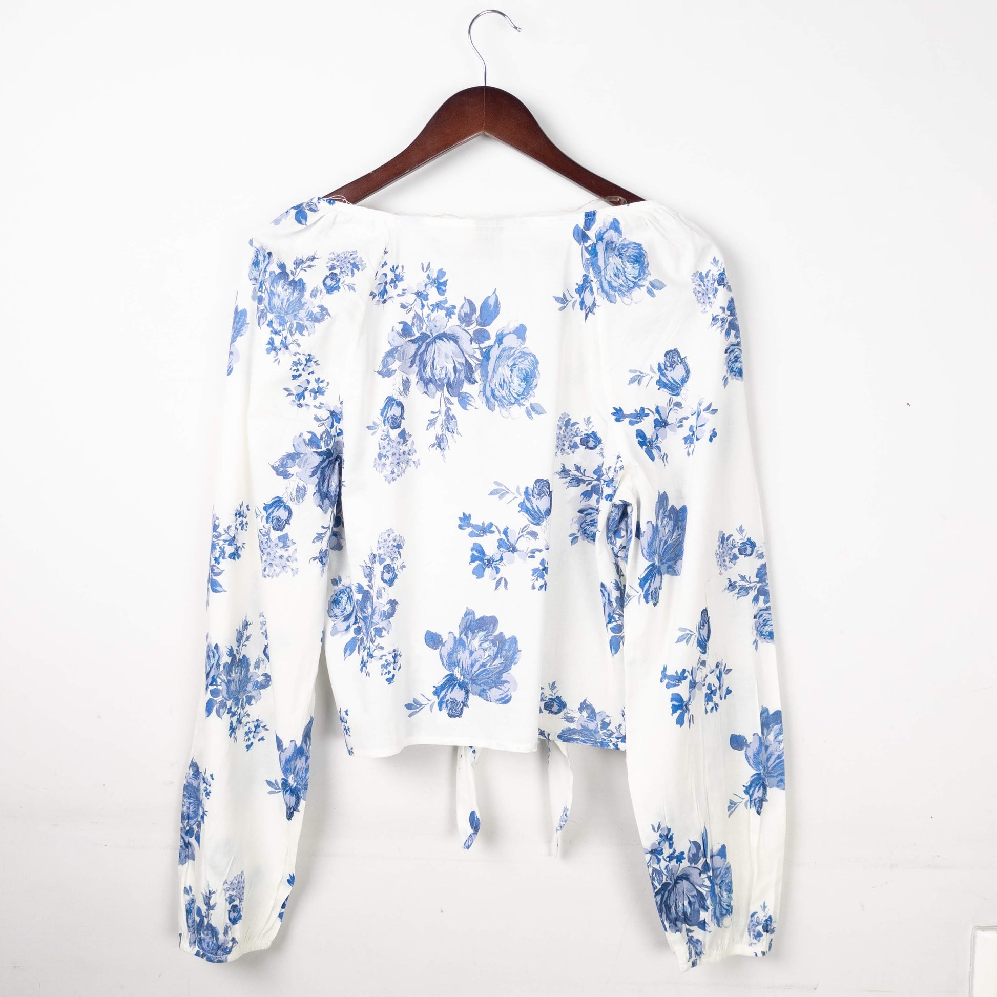 This blouse features a romantic blue floral print on a white base, a tie-front detail, and a button-up front.