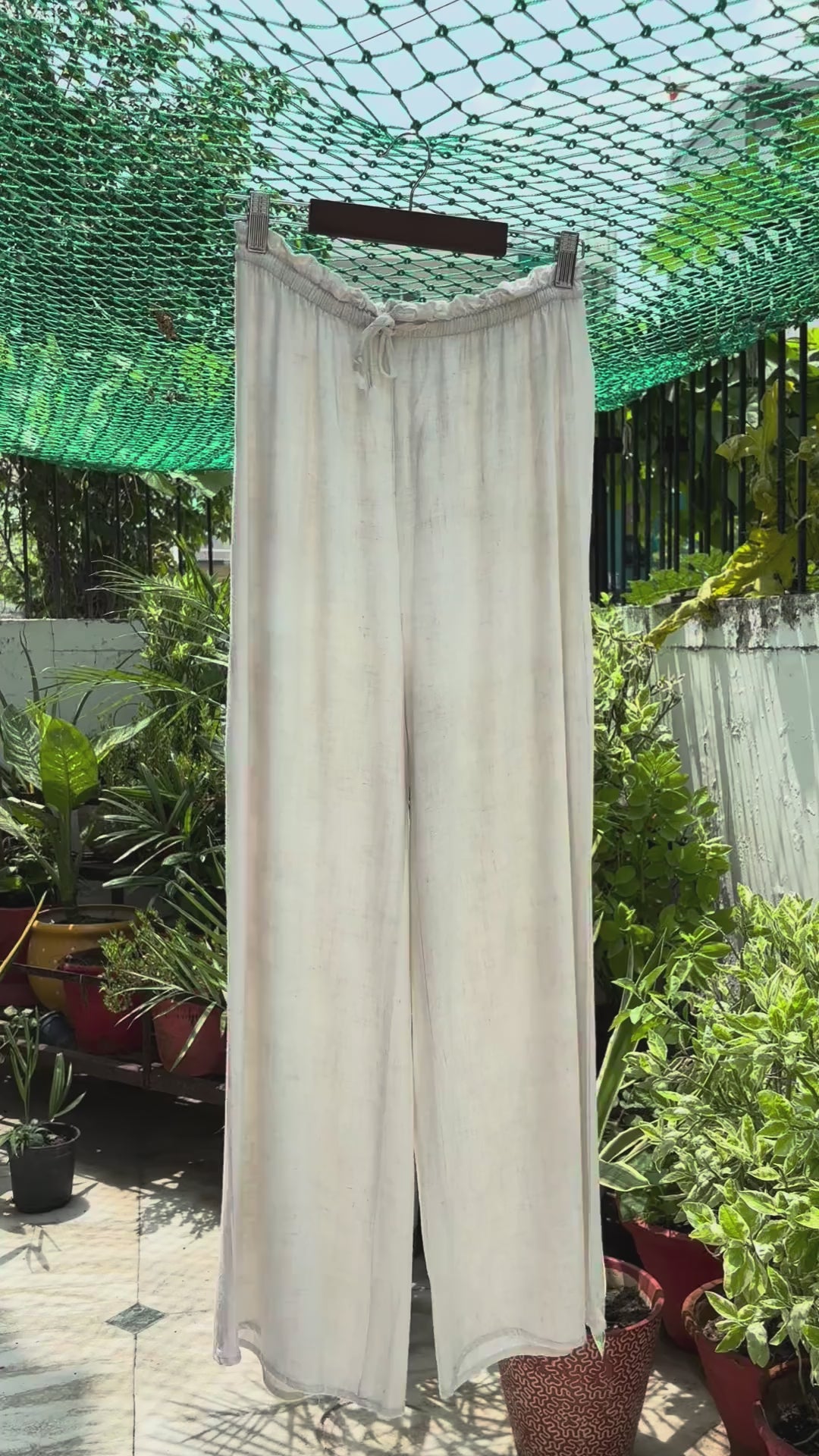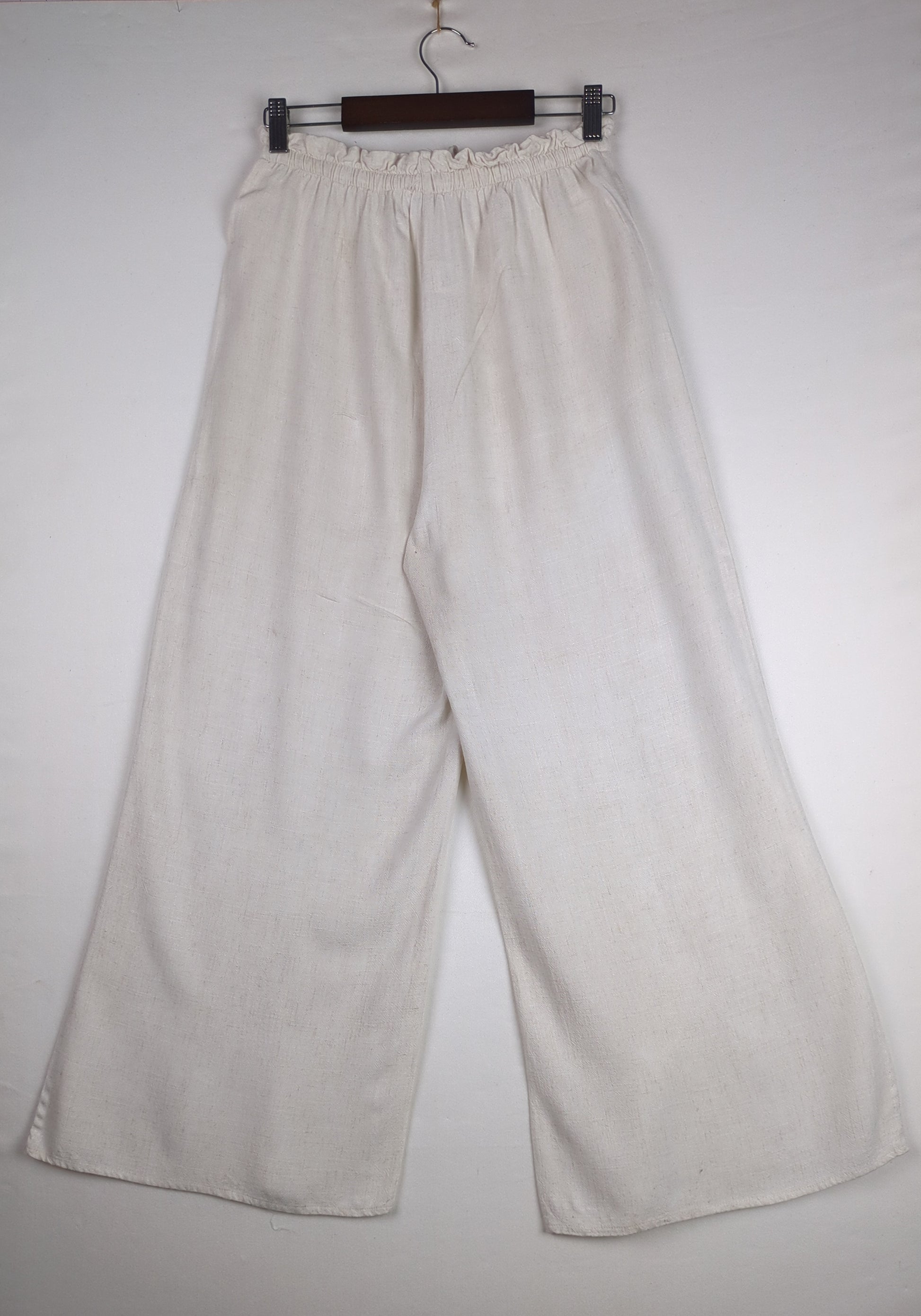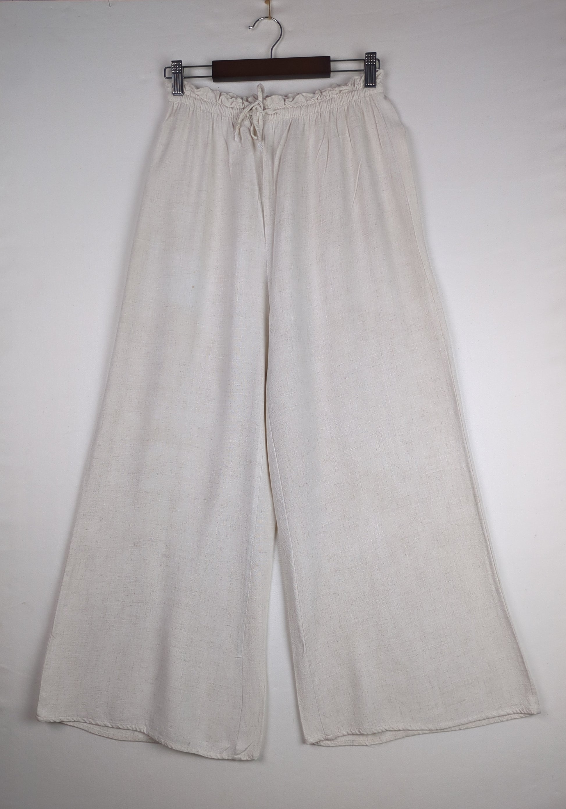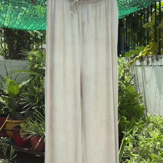 These beige wide-leg pants feature a drawstring elasticated waist for a comfortable and stylish fit.