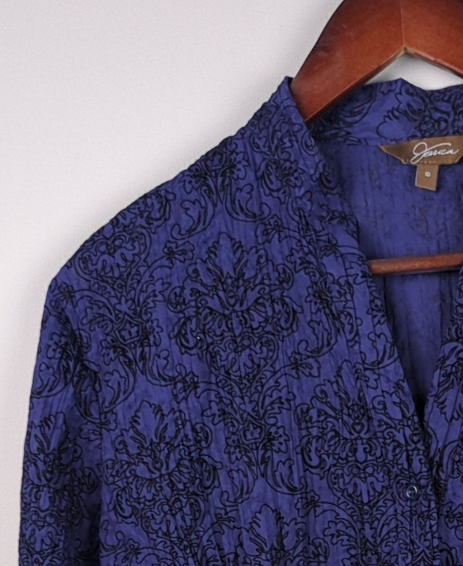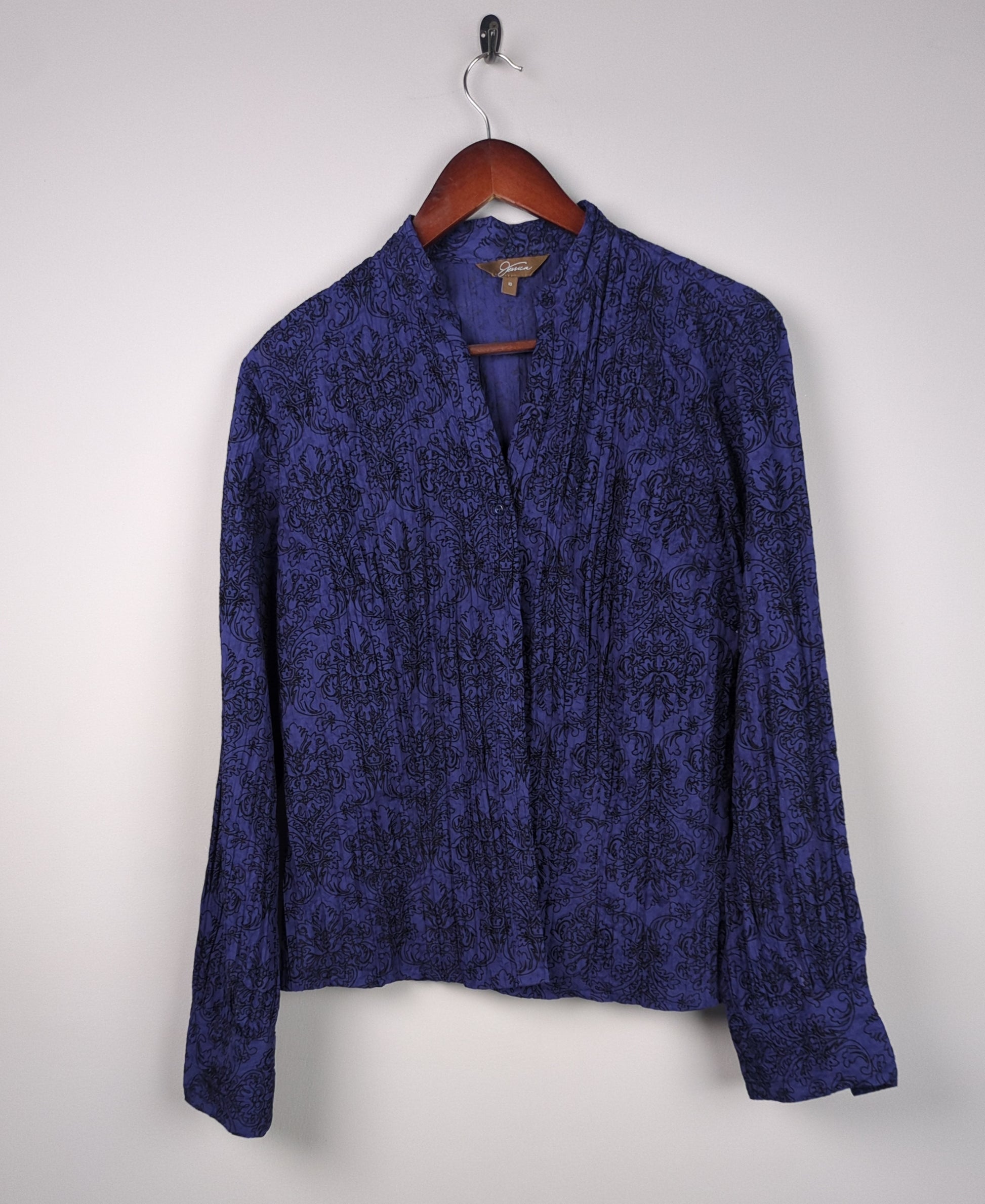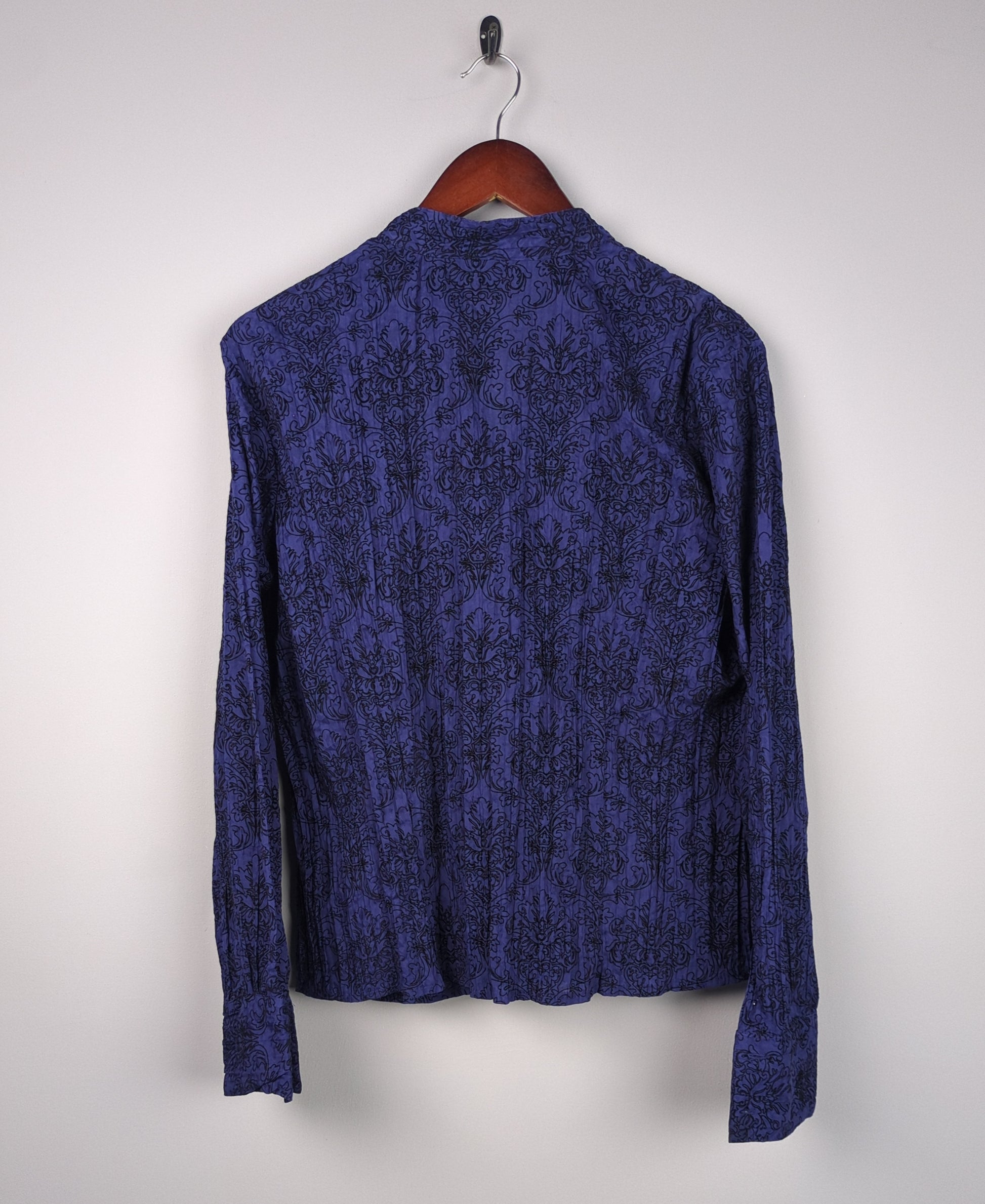 This elegant blouse features a delicate floral pattern throughout, with subtle pleating and a unique v-neck collar.