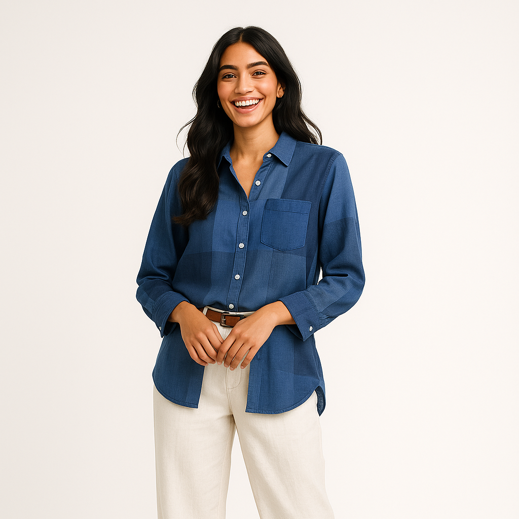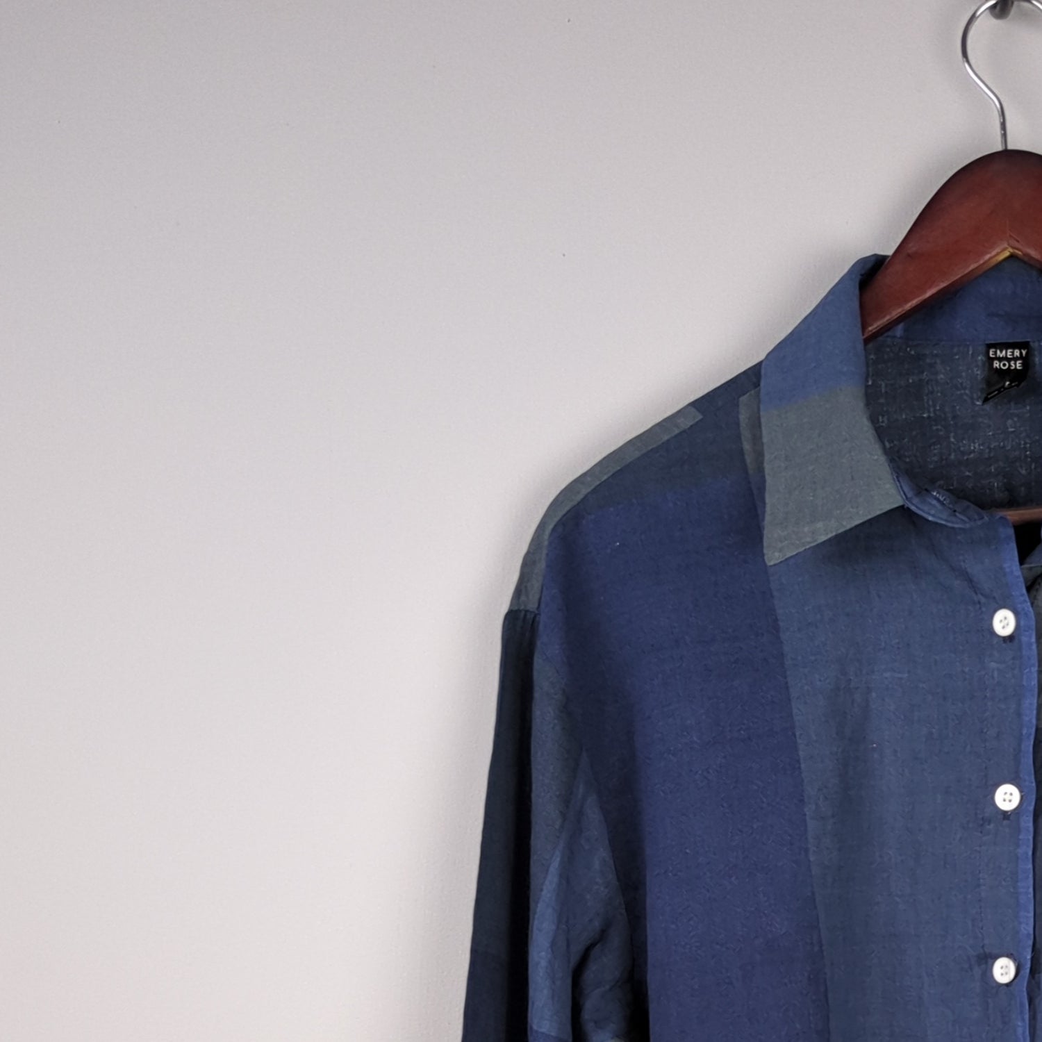This blue and grey patchwork button-down shirt is a unique and stylish addition to any wardrobe.