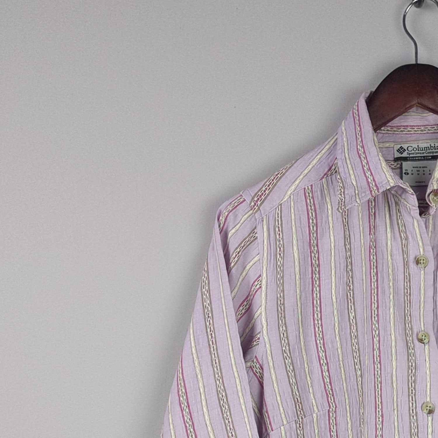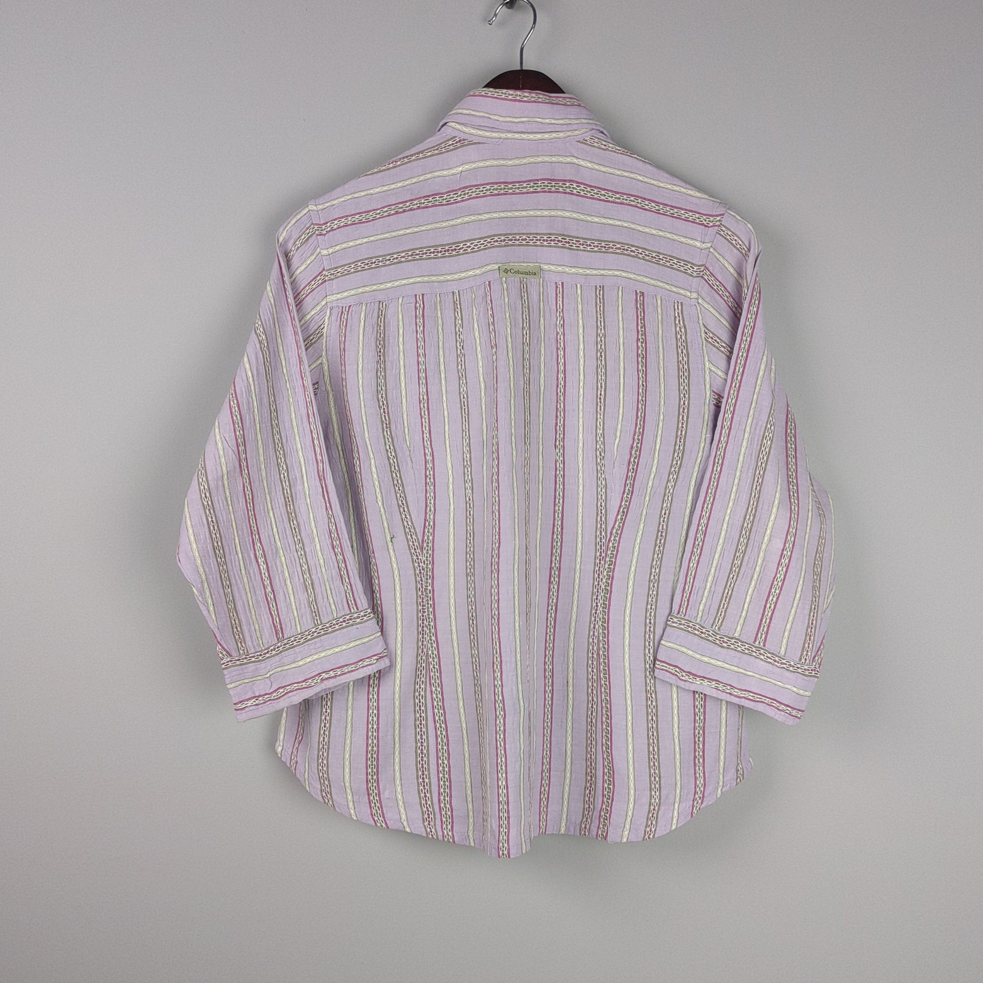 This purple and white striped button down shirt features a textured striped print and 3/4 length sleeves.
