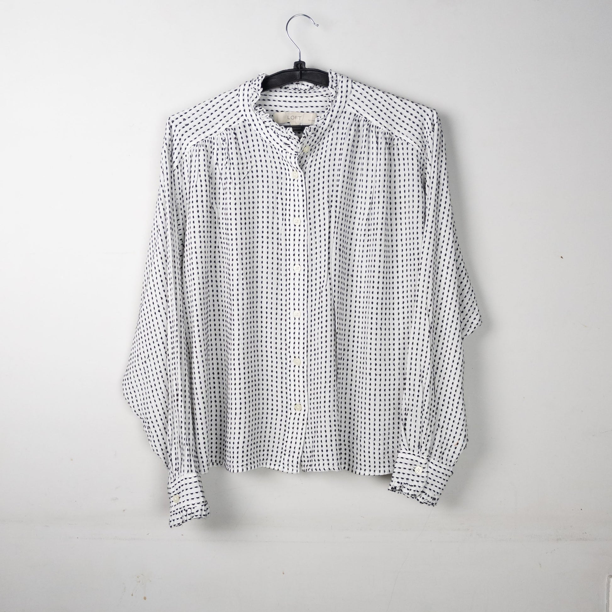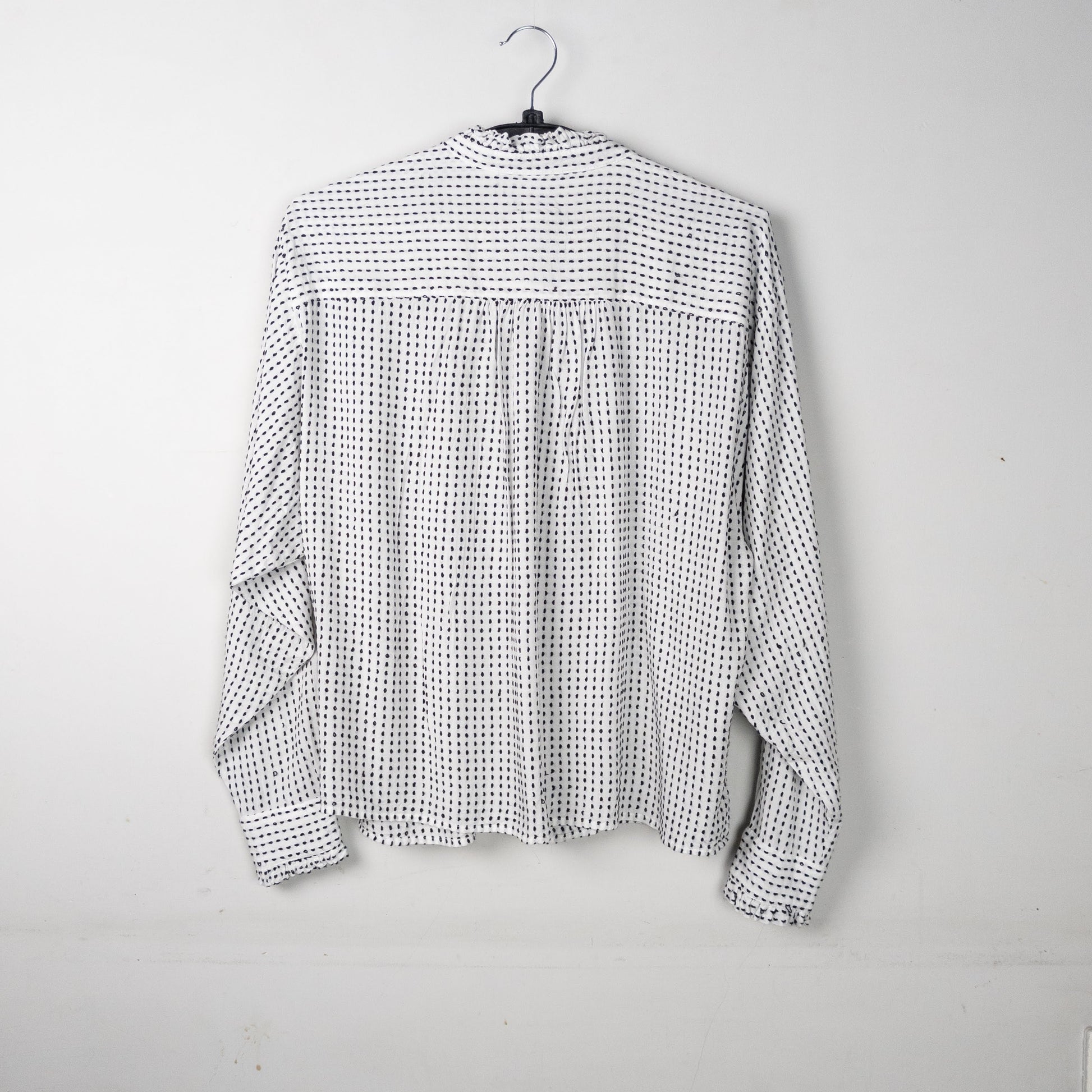 A lightweight and airy button-up shirt with a subtle embroidered dash pattern. This is a piece of art with very delicate thread work, might have some few loose ends, to be handled with care.