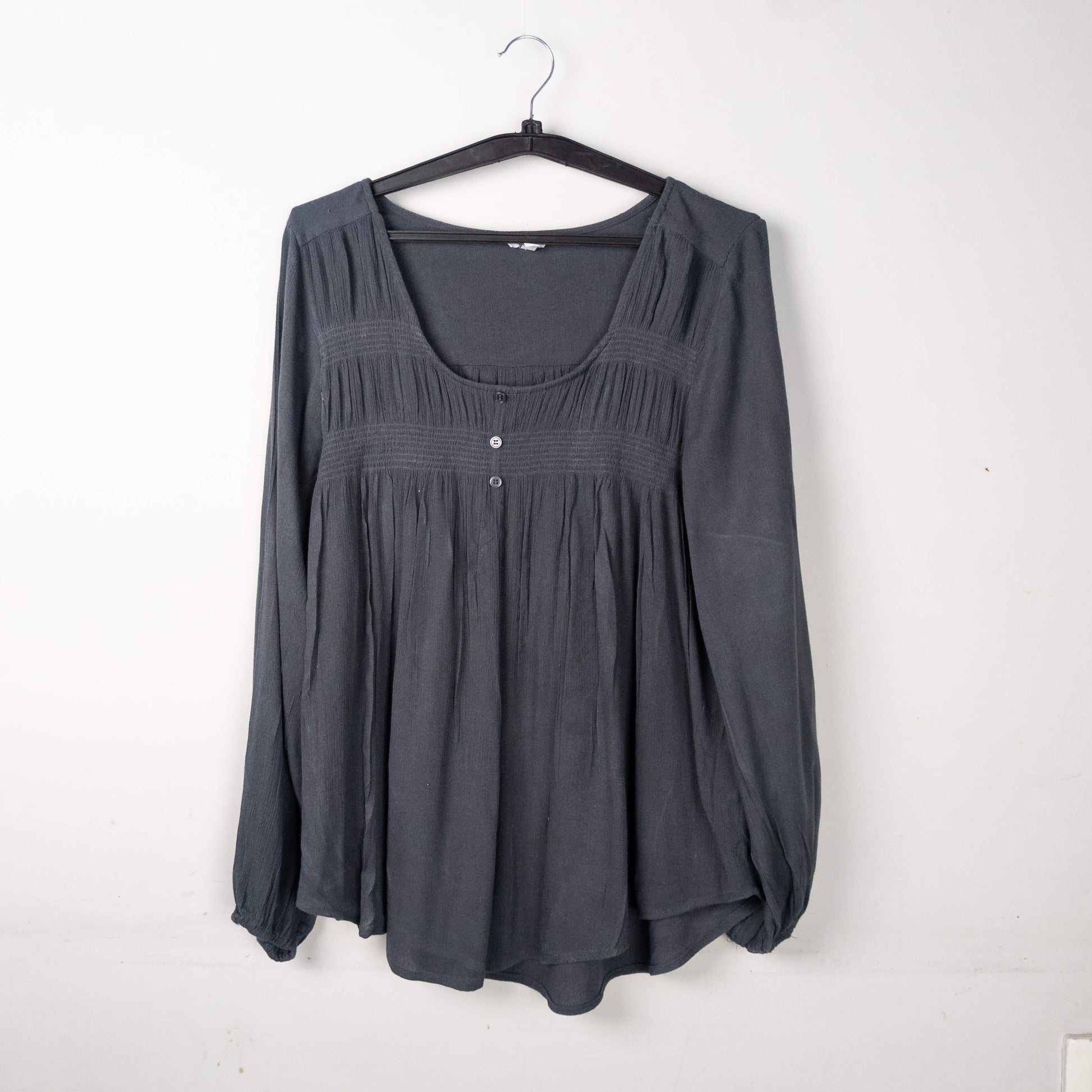 This flowy long sleeve blouse features a scoop neck and a pleated bodice with button details.