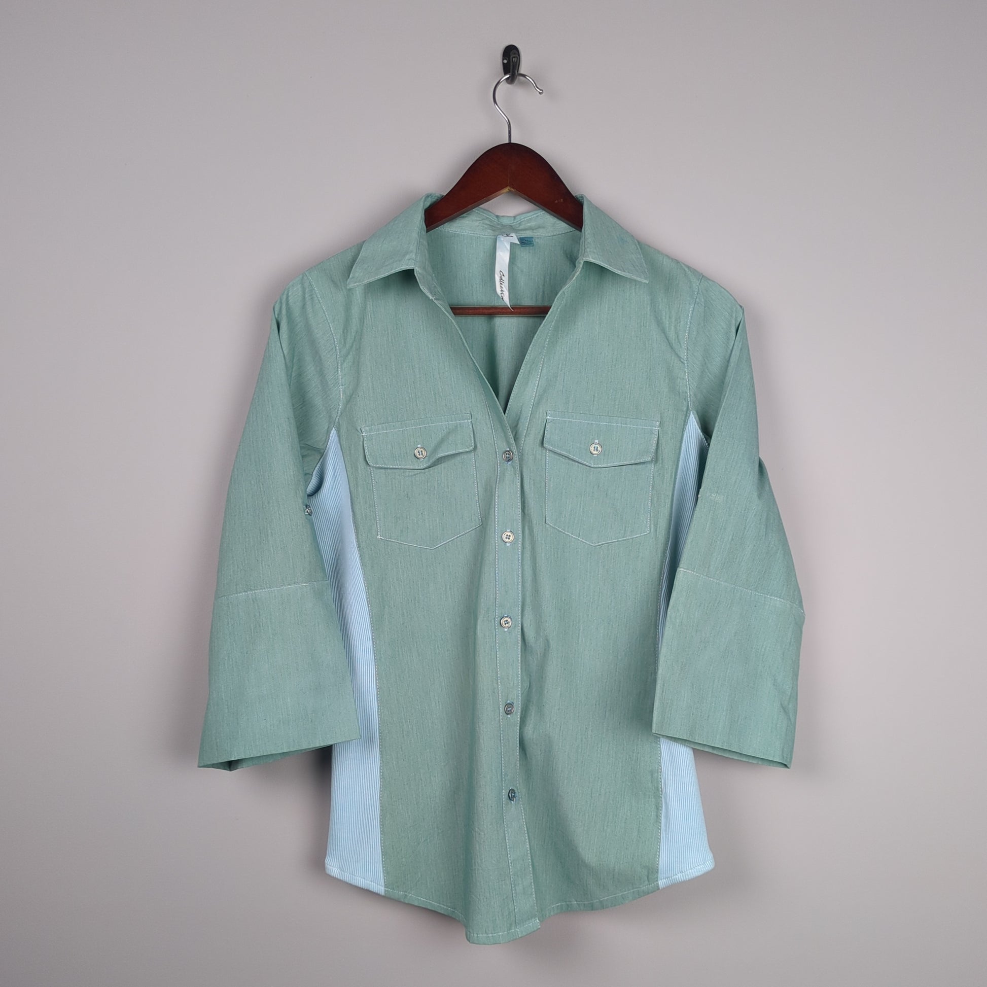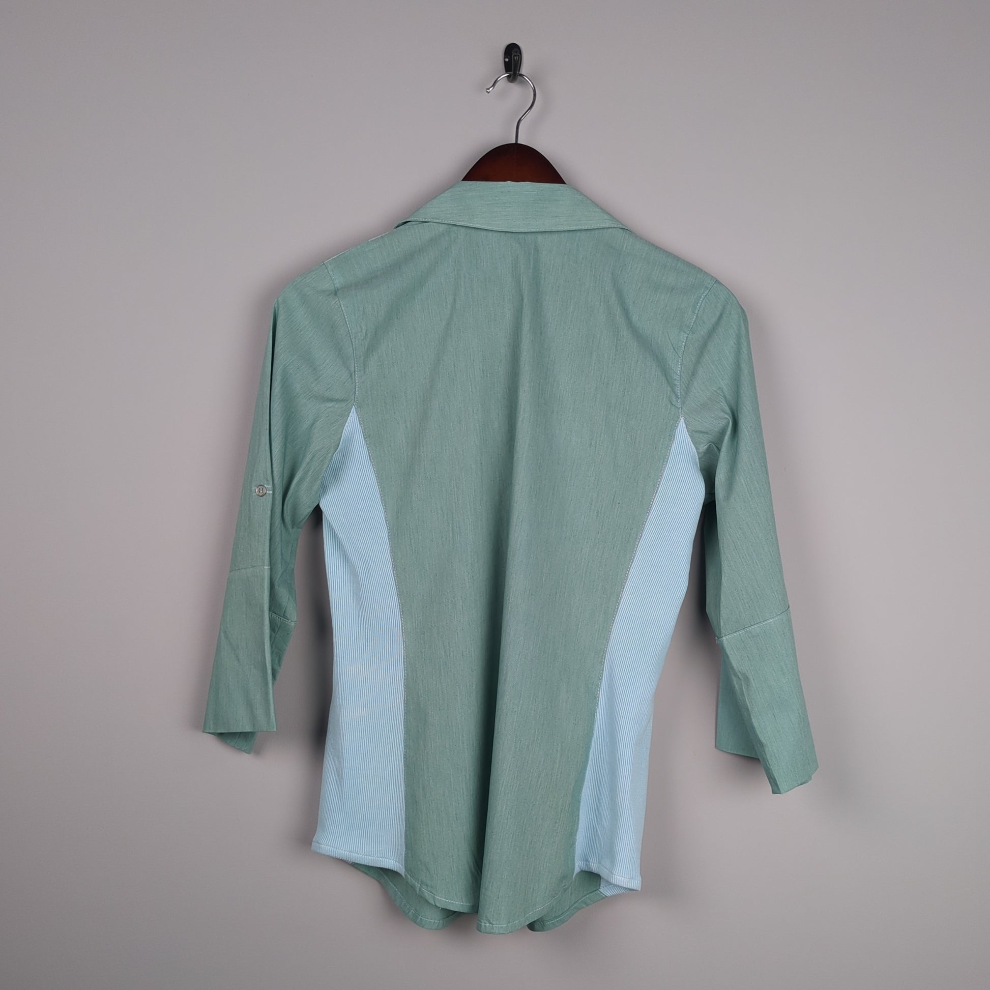 This light green and white striped button down shirt features two front pockets and 3/4 sleeves.