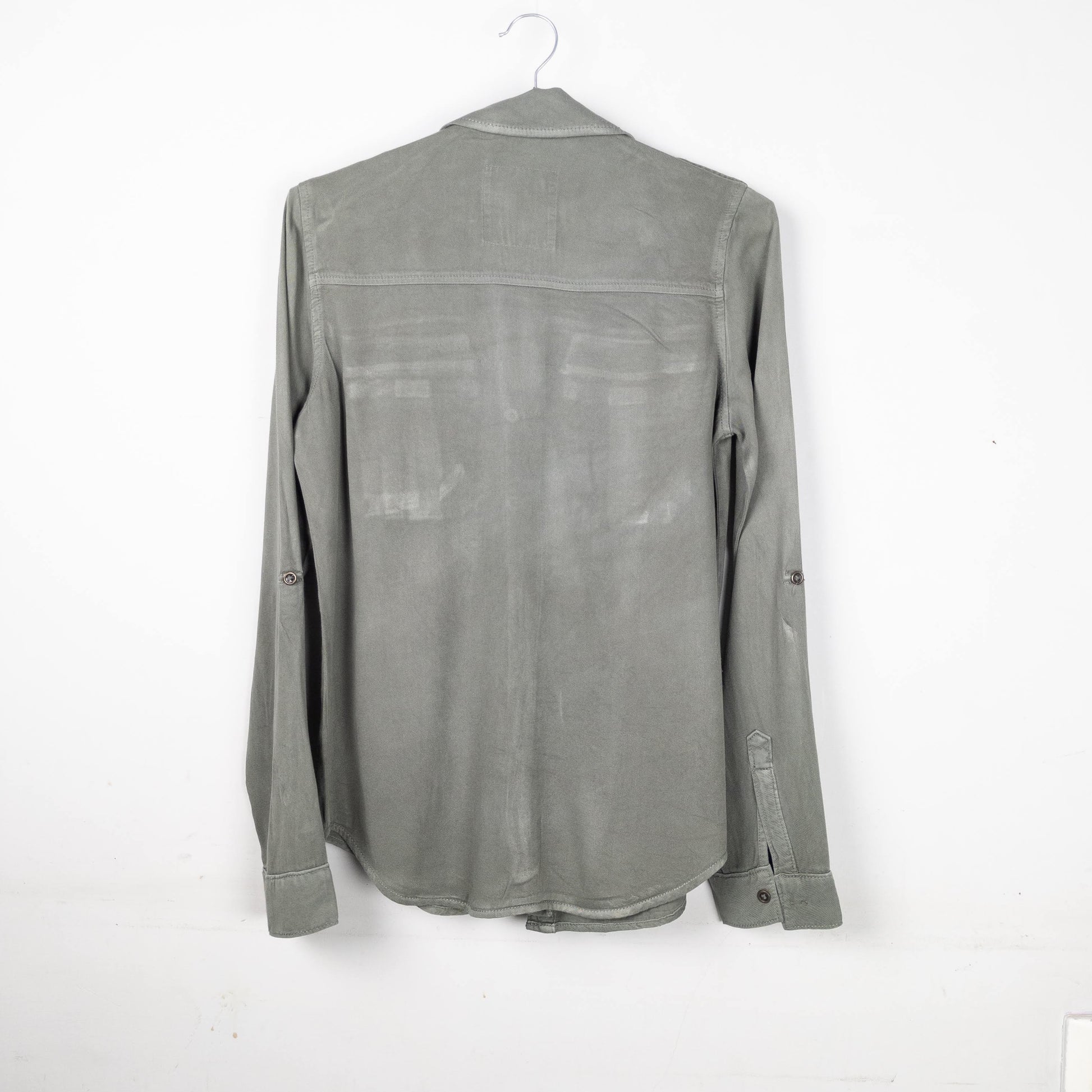 This is a long-sleeved button-down shirt in a solid olive green colour with two chest pockets.