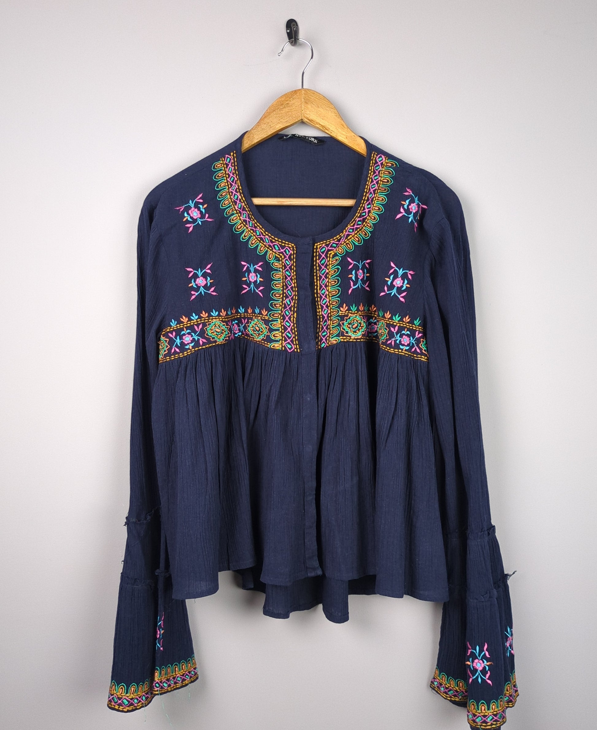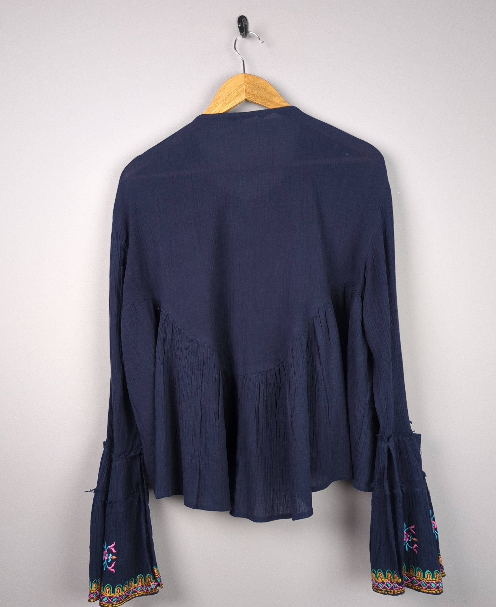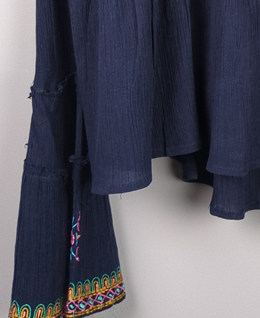 This navy blue blouse features colorful floral embroidery and flared sleeves.