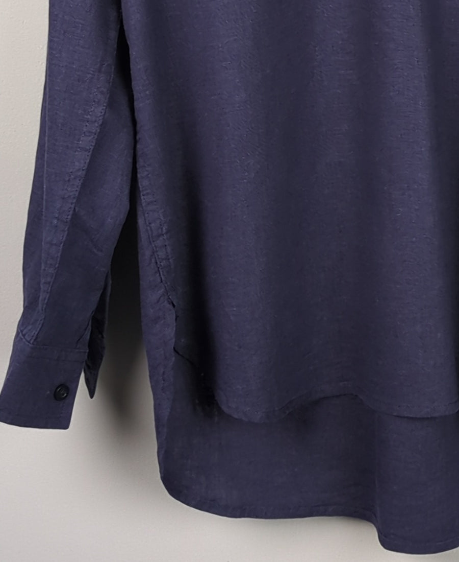 This navy blue utility shirt features a relaxed fit, button-down front, and two chest pockets.