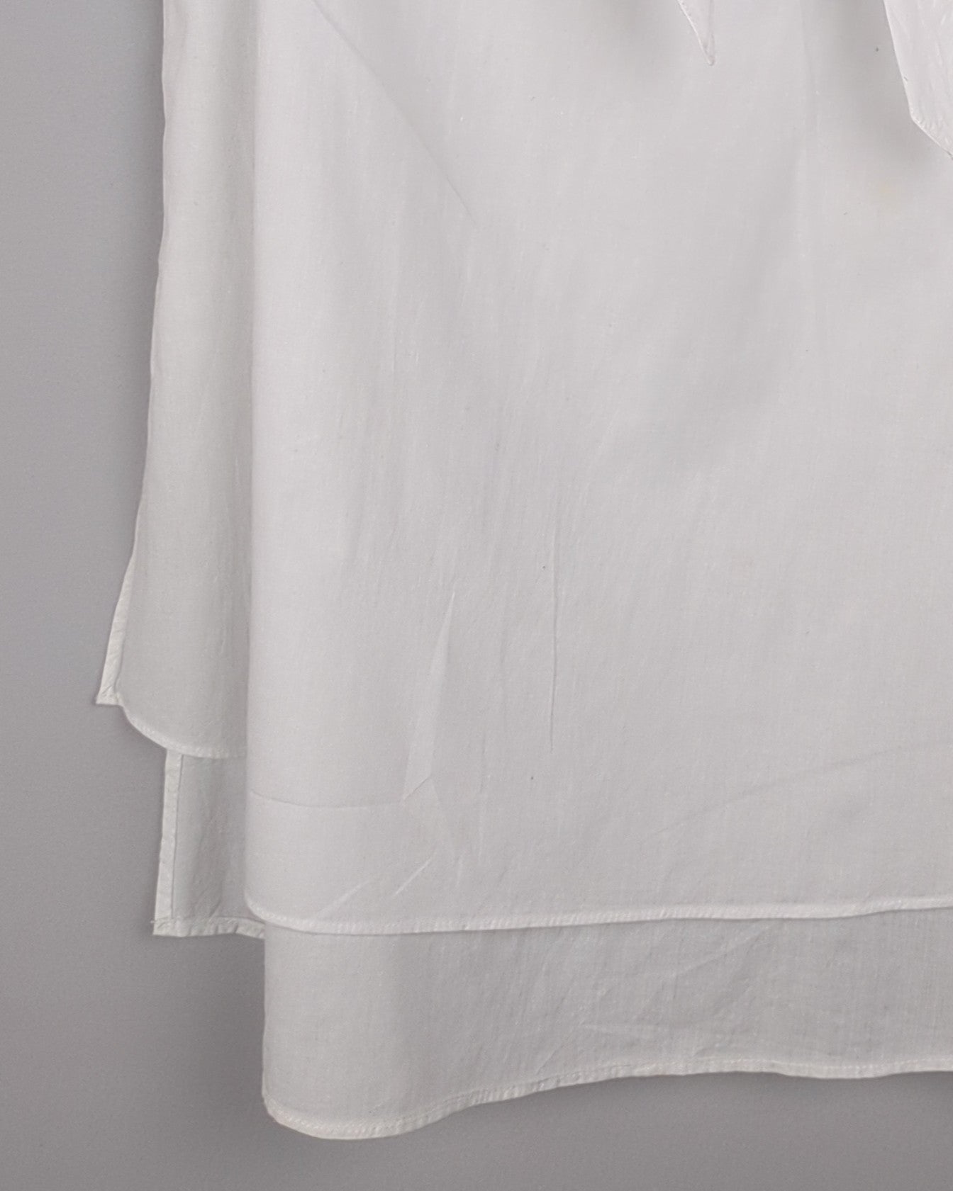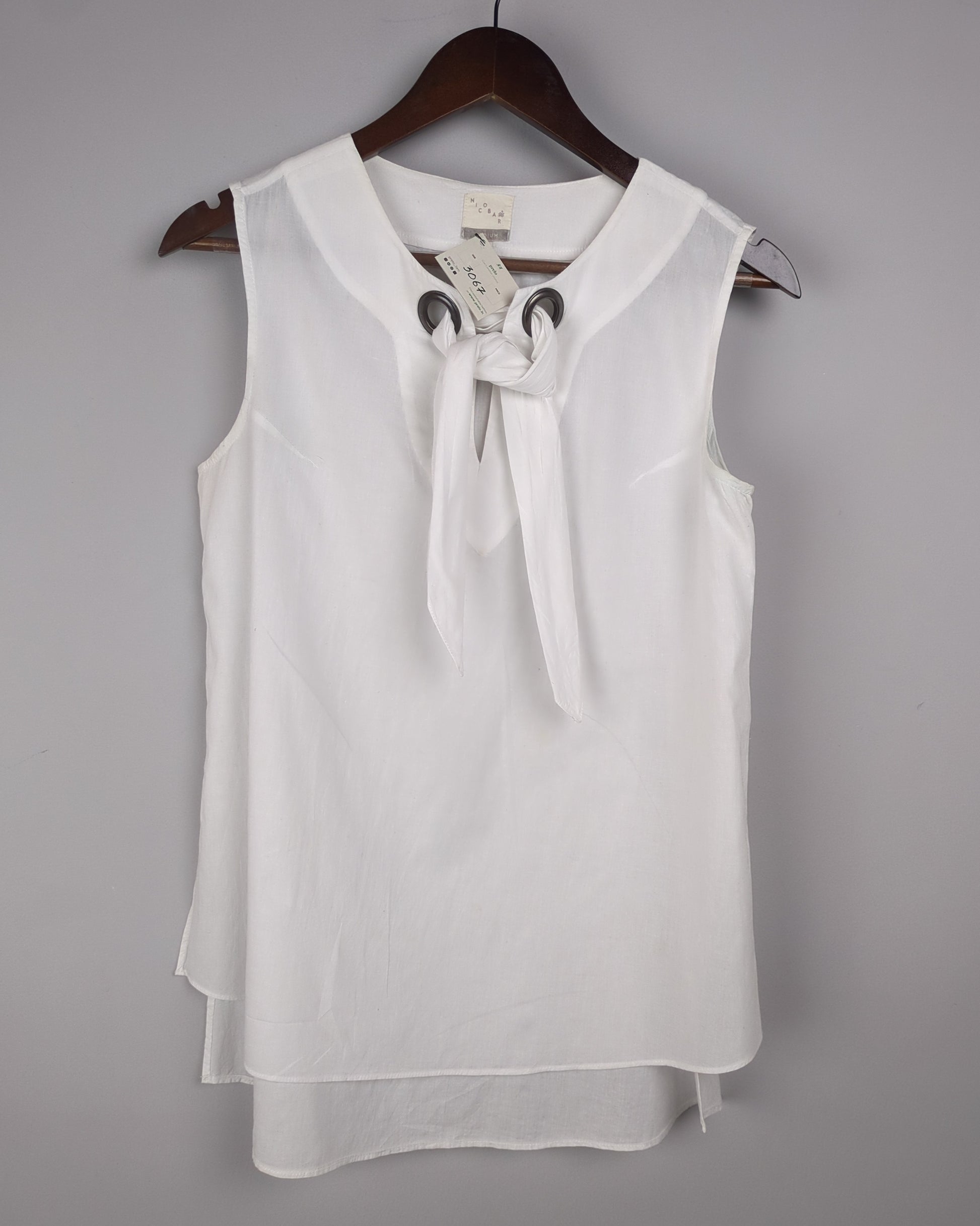 A lightweight sleeveless blouse featuring a decorative tie-front design with metallic grommet detailing at the neckline.