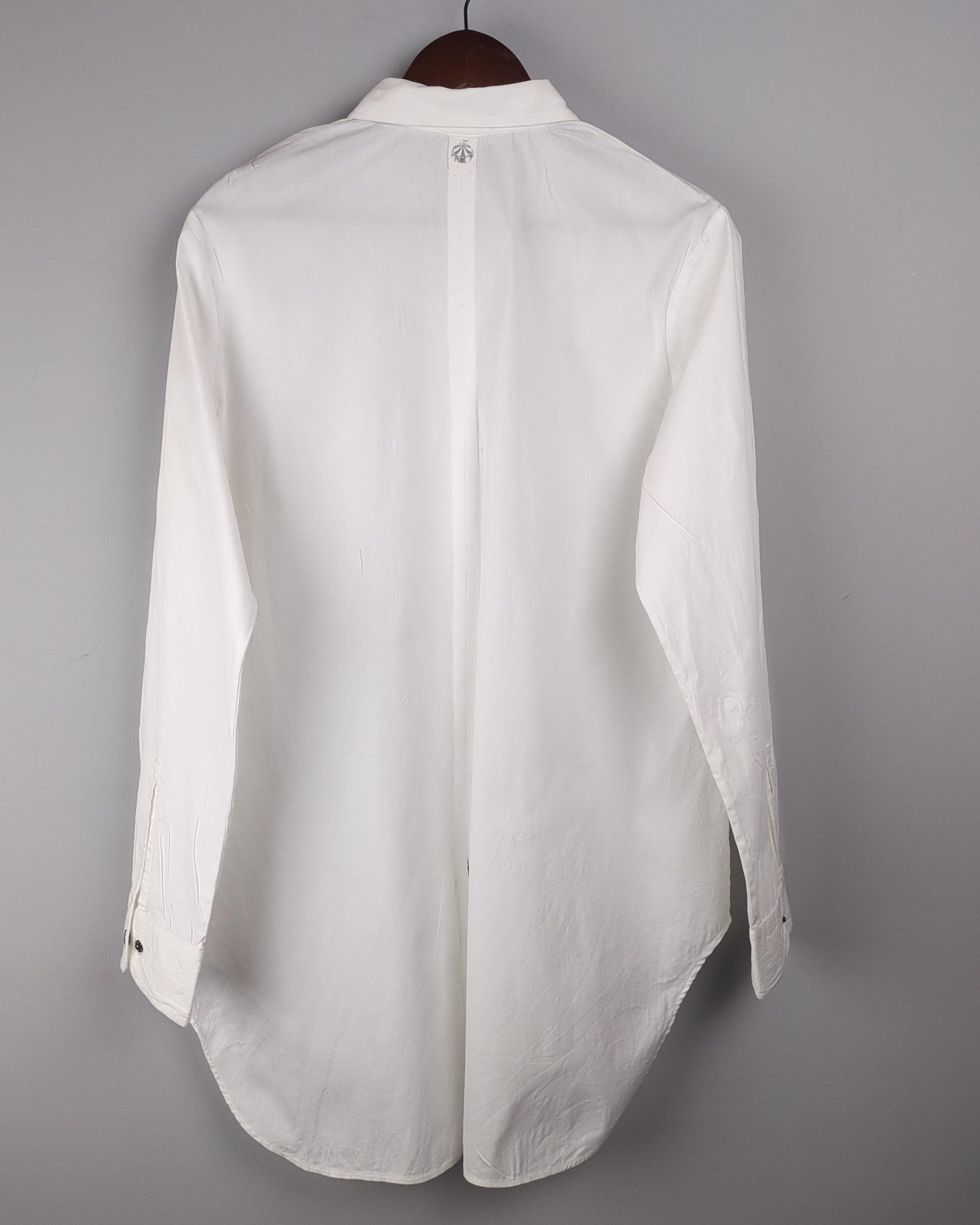 A crisp white button-down shirt featuring long sleeves with roll-up tabs and a single chest pocket.