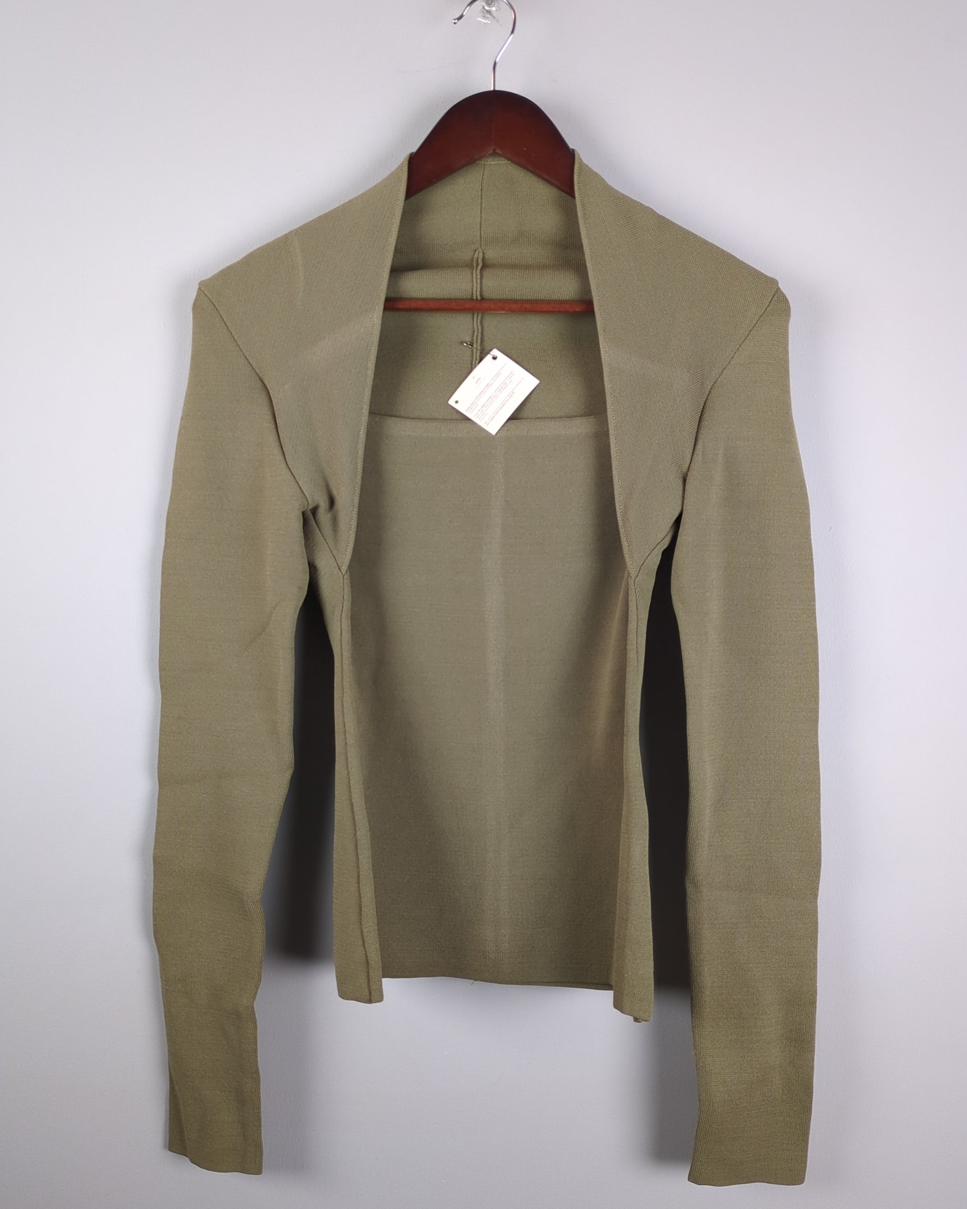 A minimalist olive green knit top featuring a unique layered neckline and a slim-fitting silhouette.