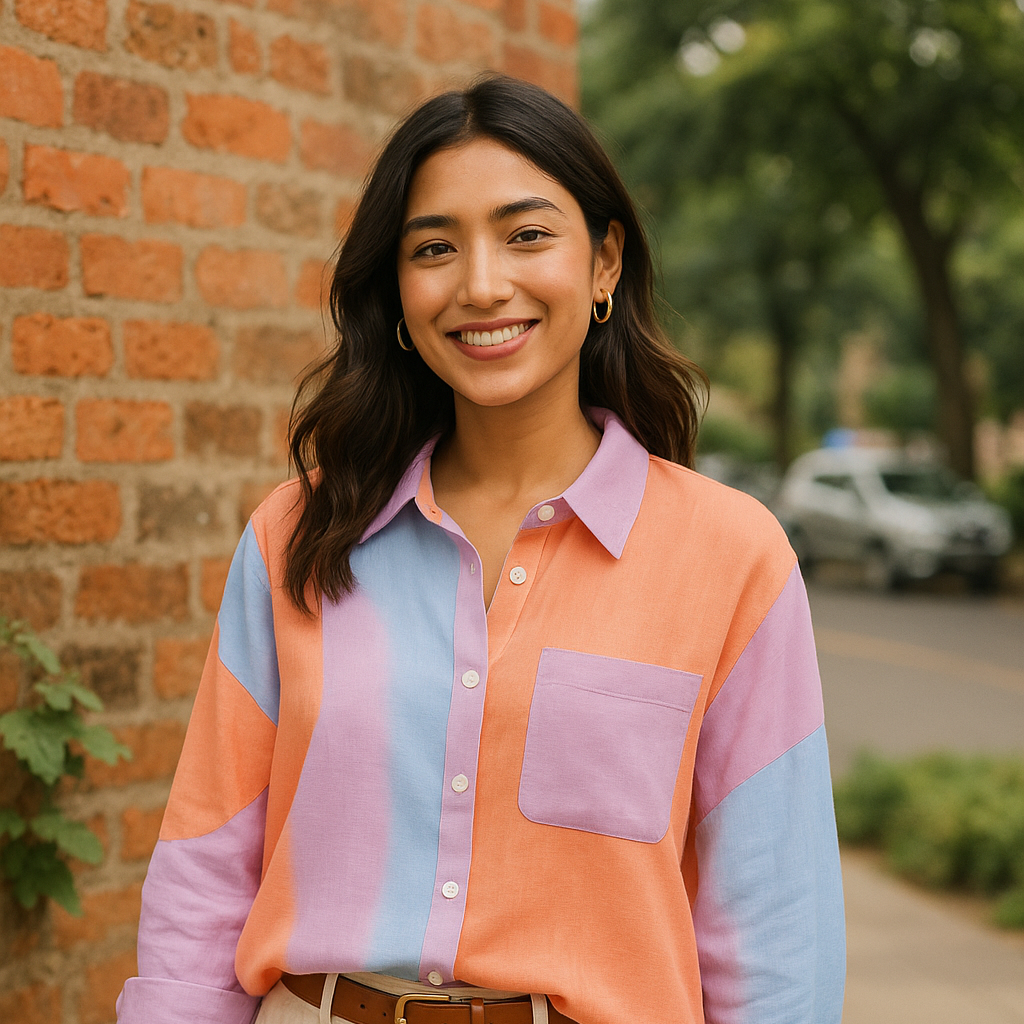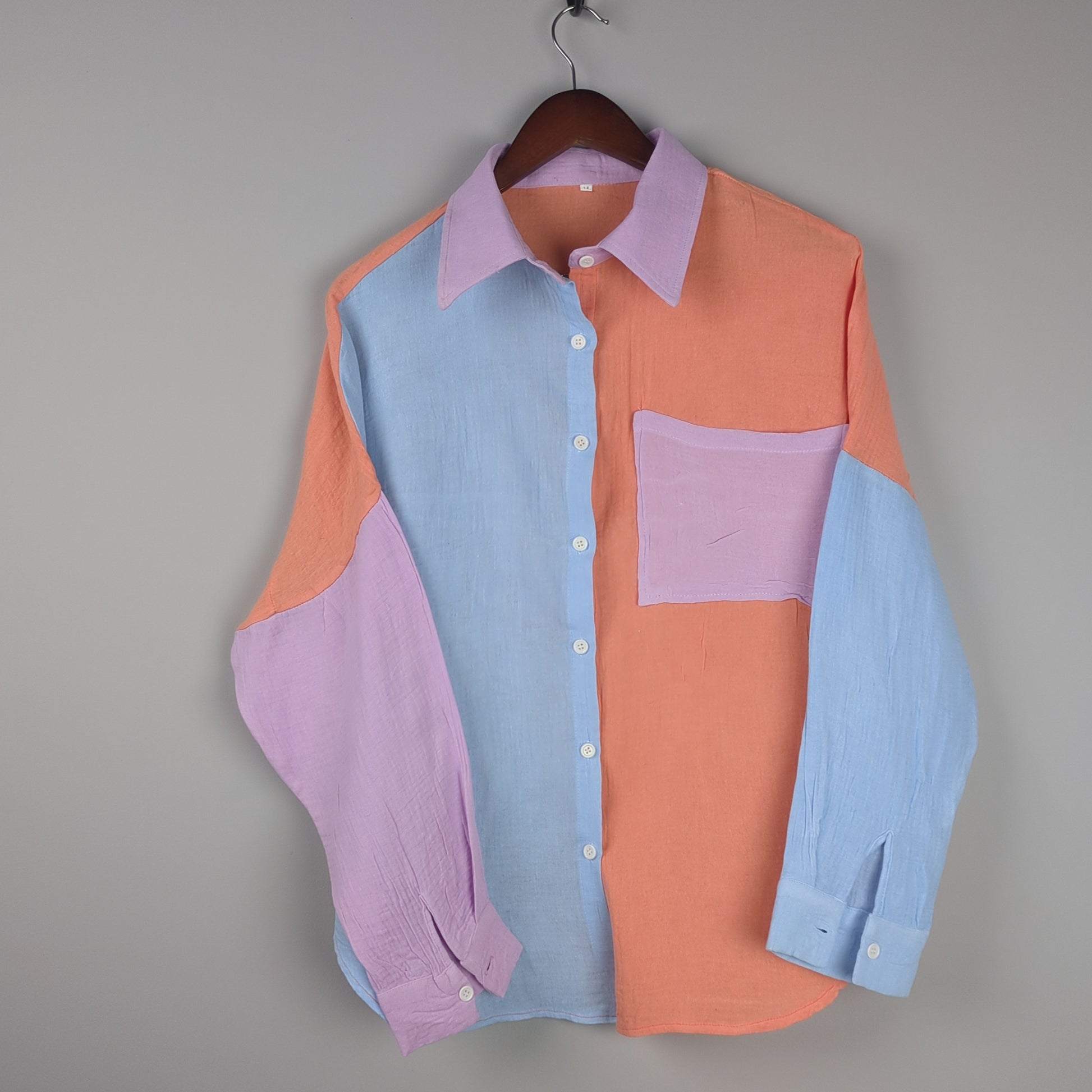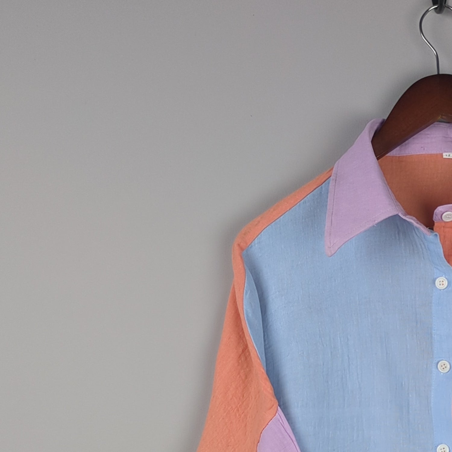 This colour-blocked shirt features pastel pink, blue, and orange panels for a unique and playful look.