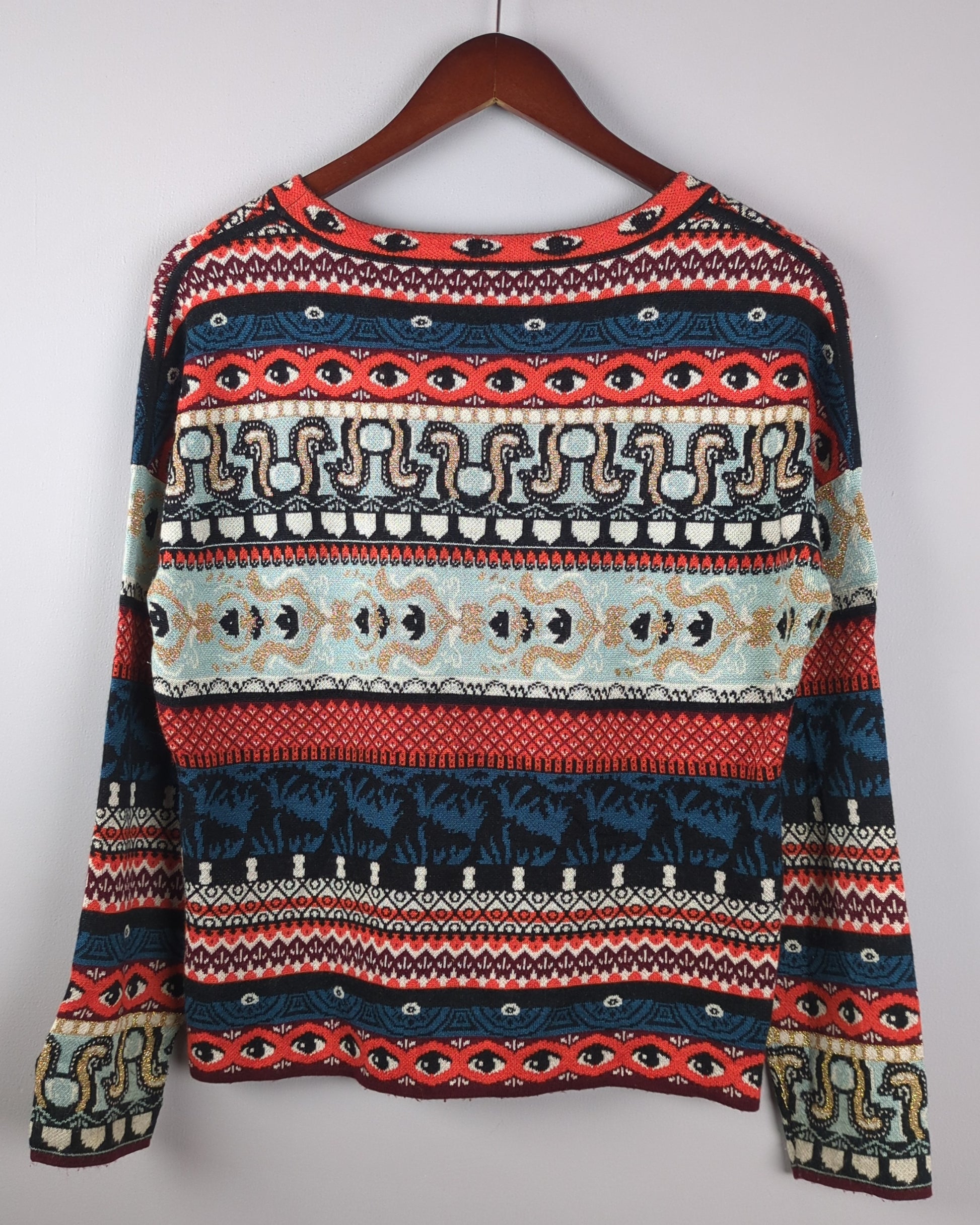 A colorful long-sleeve sweater featuring a vibrant tribal pattern with geometric shapes and eye motifs.