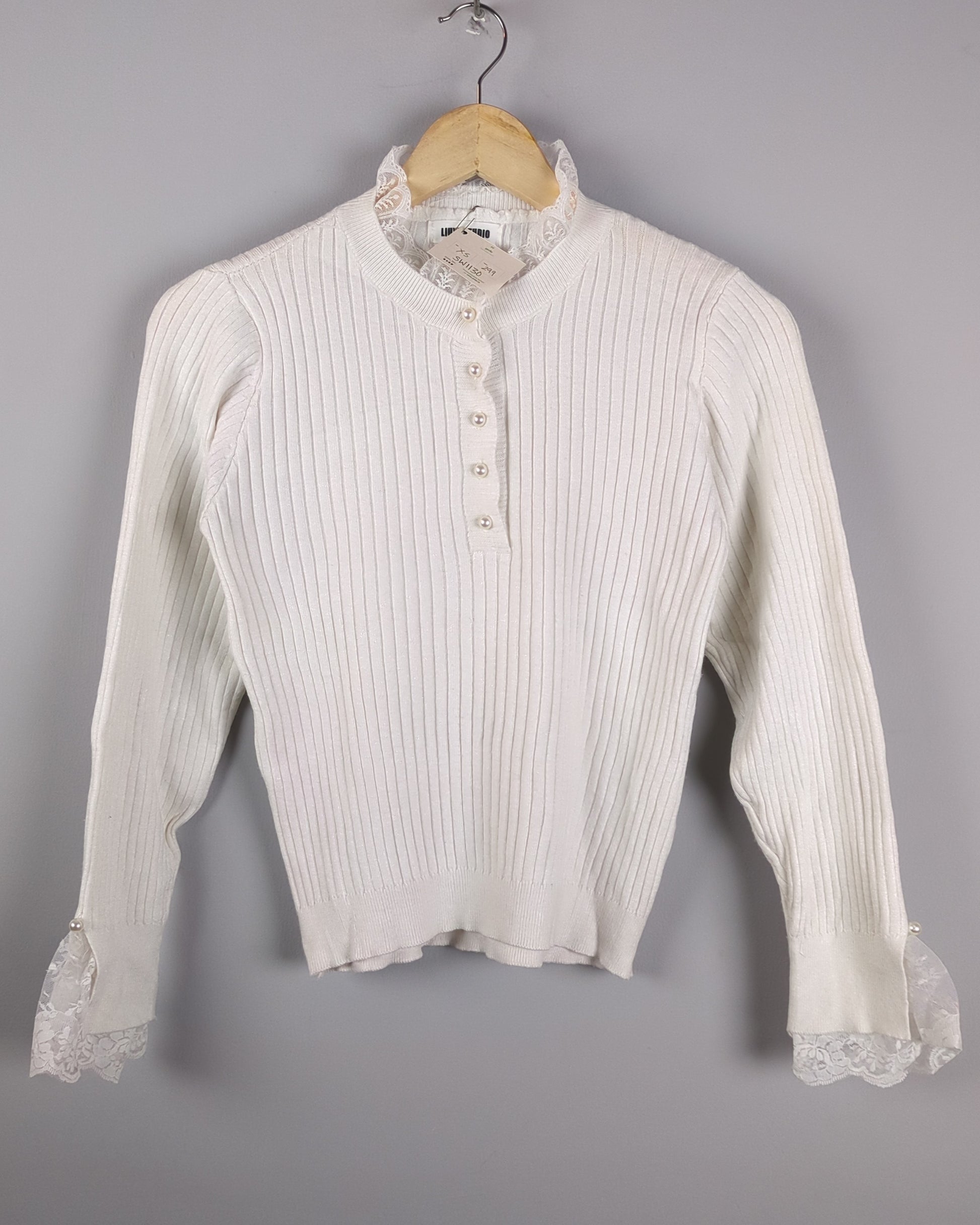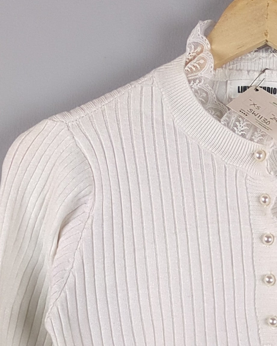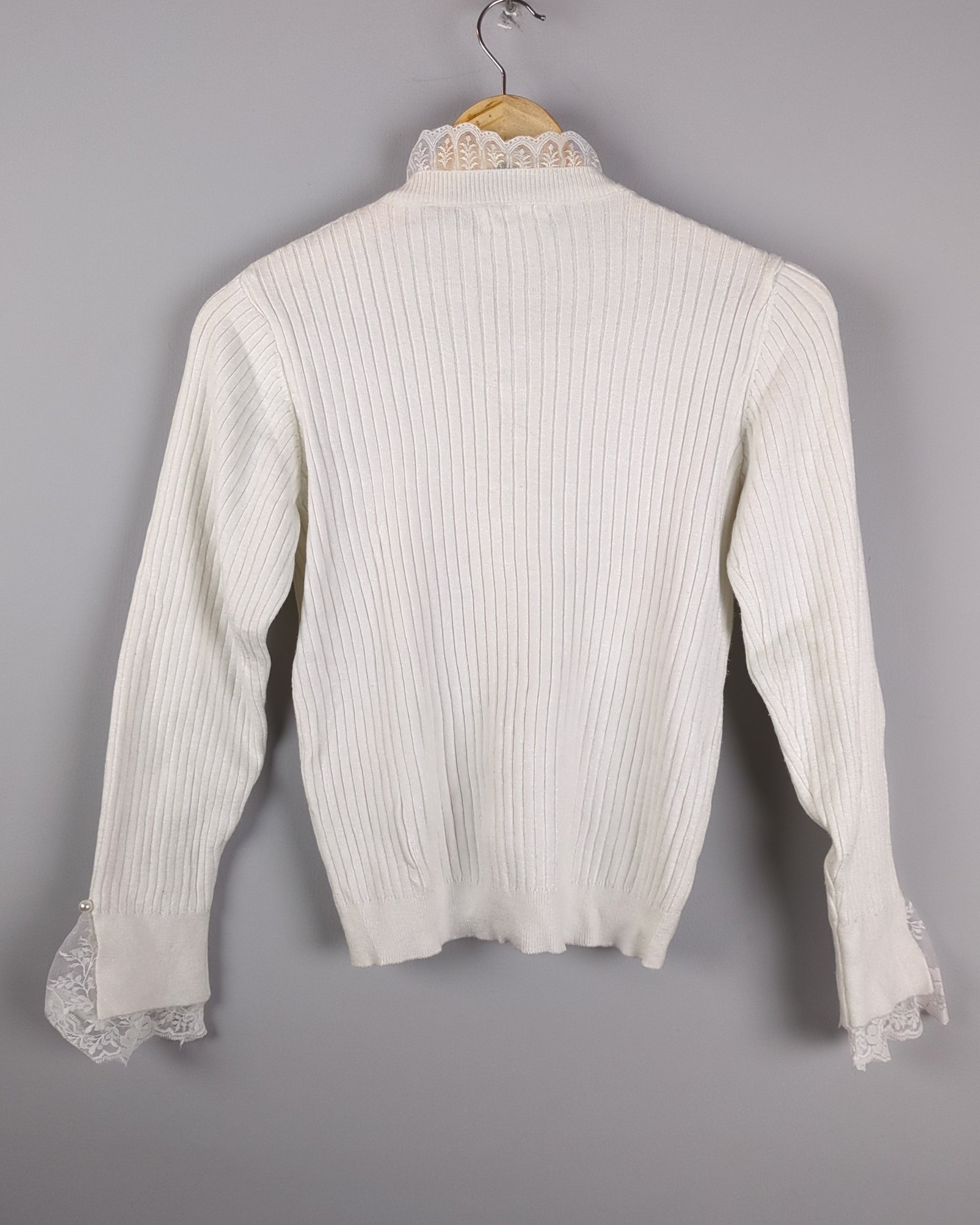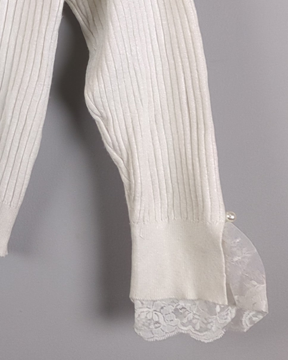An elegant white ribbed knit sweater accented with delicate lace trim at the collar and cuffs and pearl-style buttons.