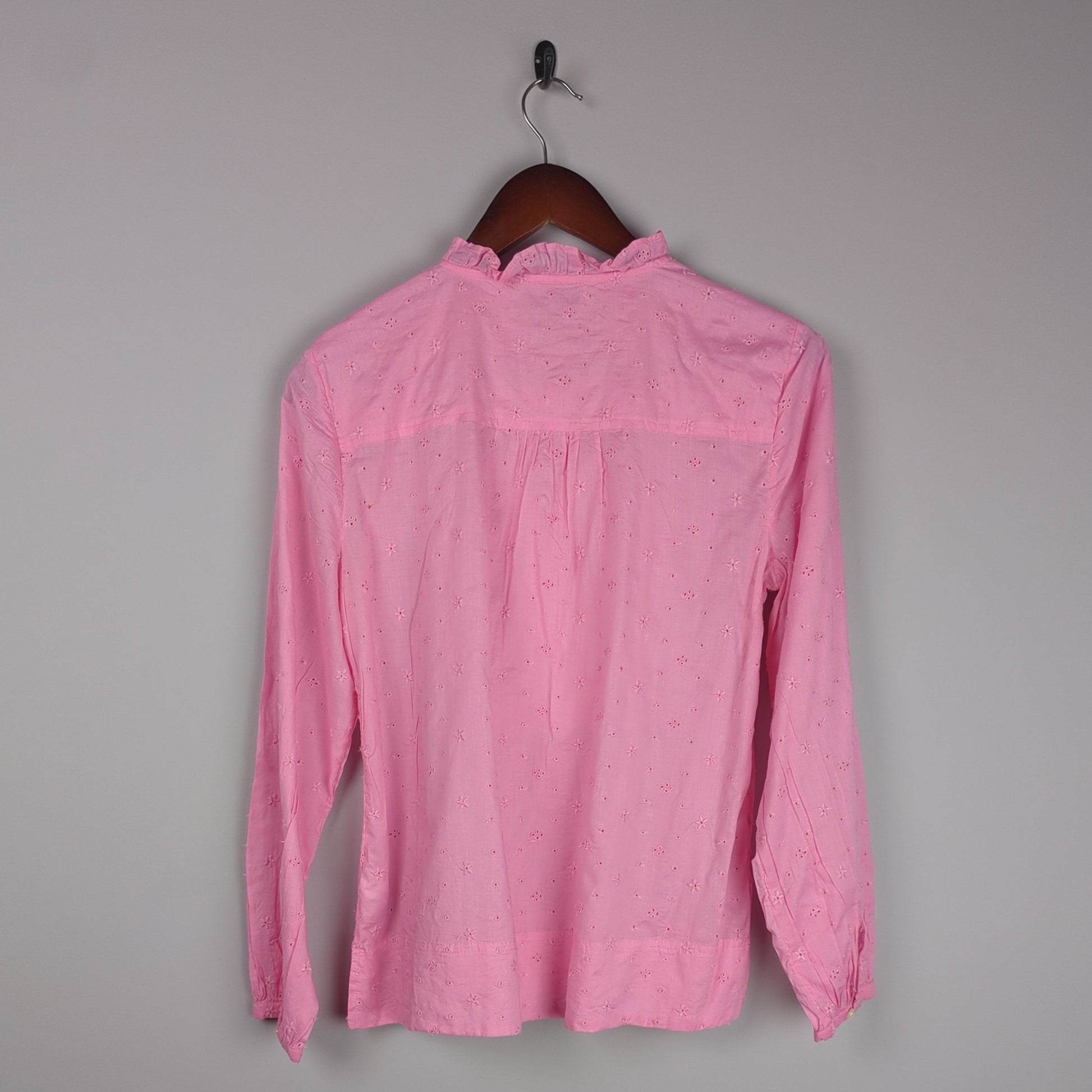 This long-sleeve pink blouse features delicate embroidery with frilled detailing on the placket and collar, adding a feminine touch to a classic silhouette.