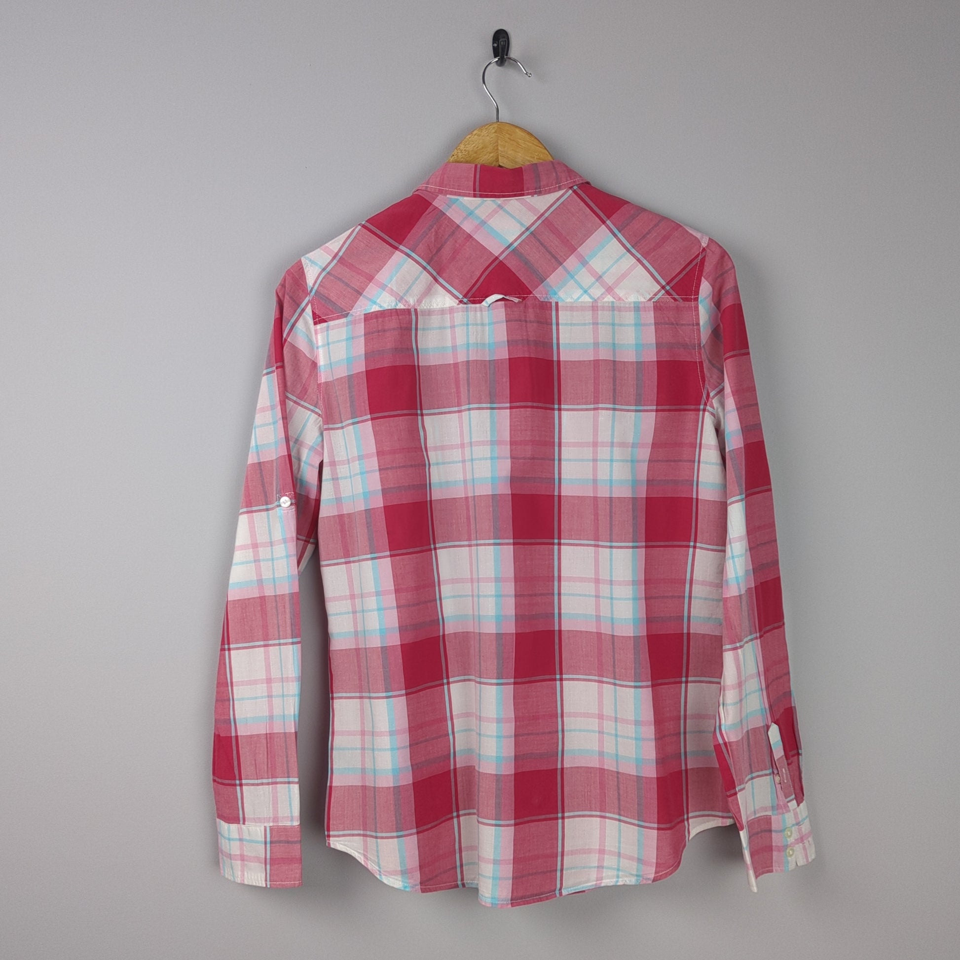 This pink and white plaid button-down shirt is a stylish and versatile piece.