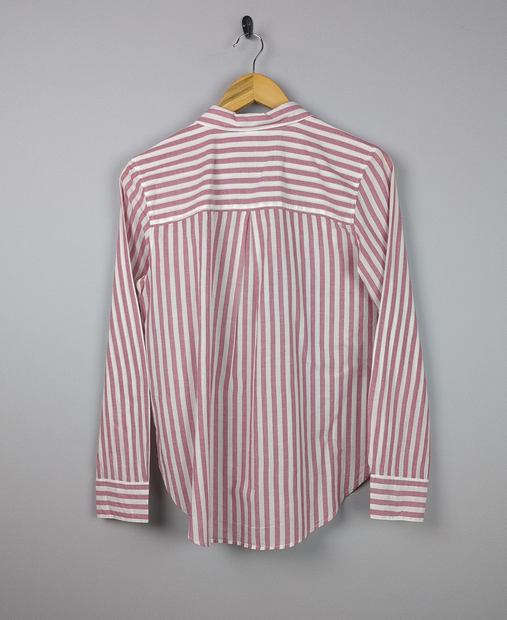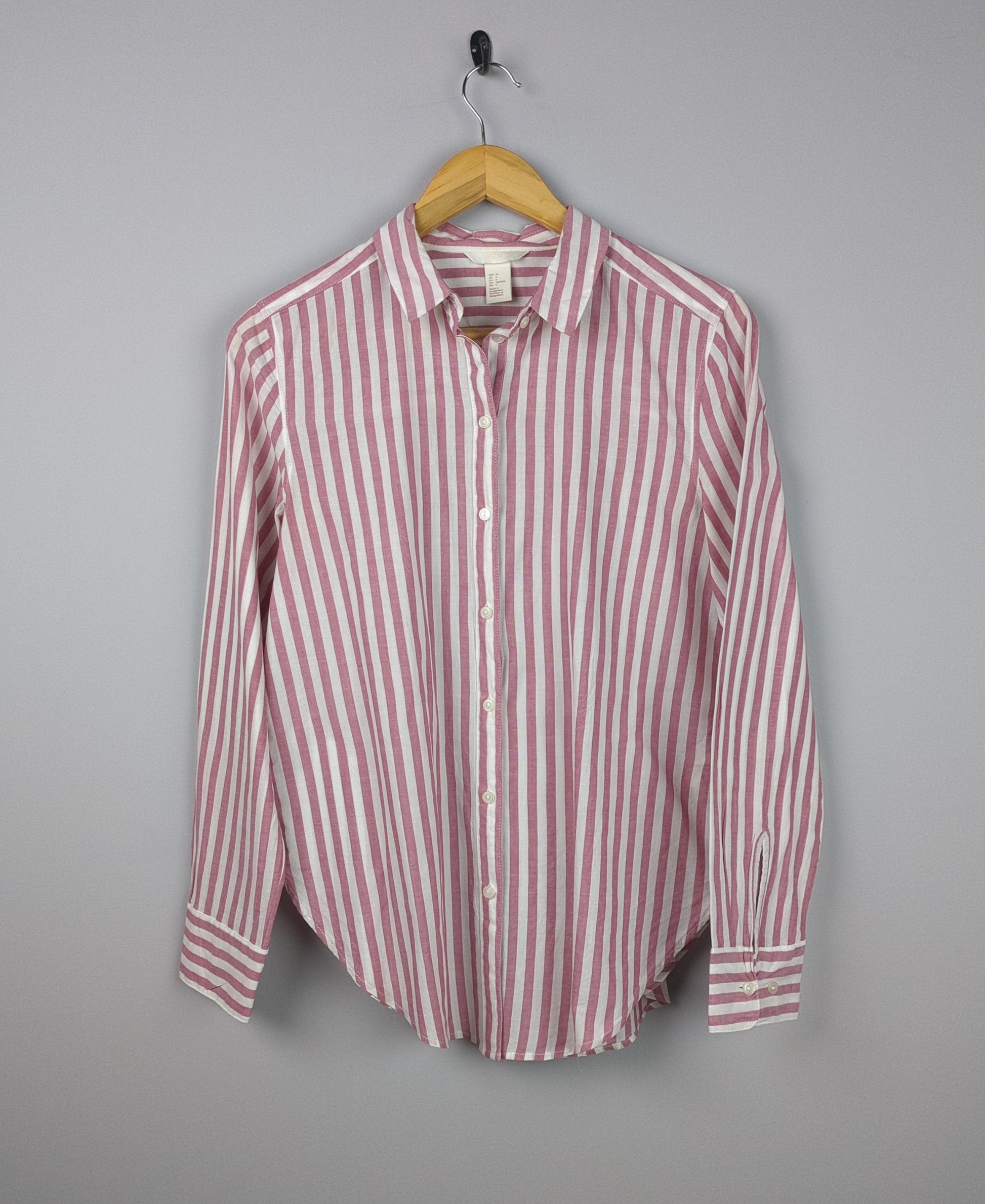 This pink and white striped button-down shirt is a perfect addition to your wardrobe.