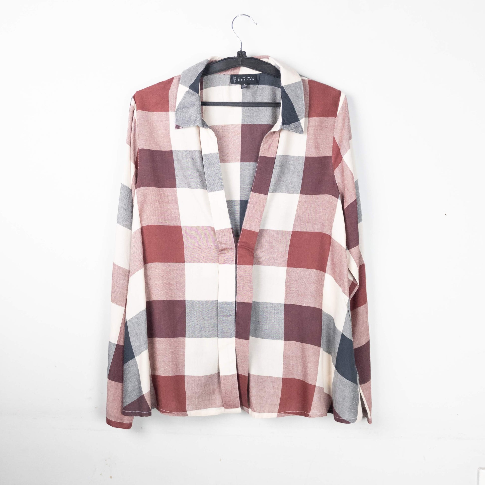 This long-sleeve blouse has a relaxed fit and features a muted red, grey, and white plaid pattern.