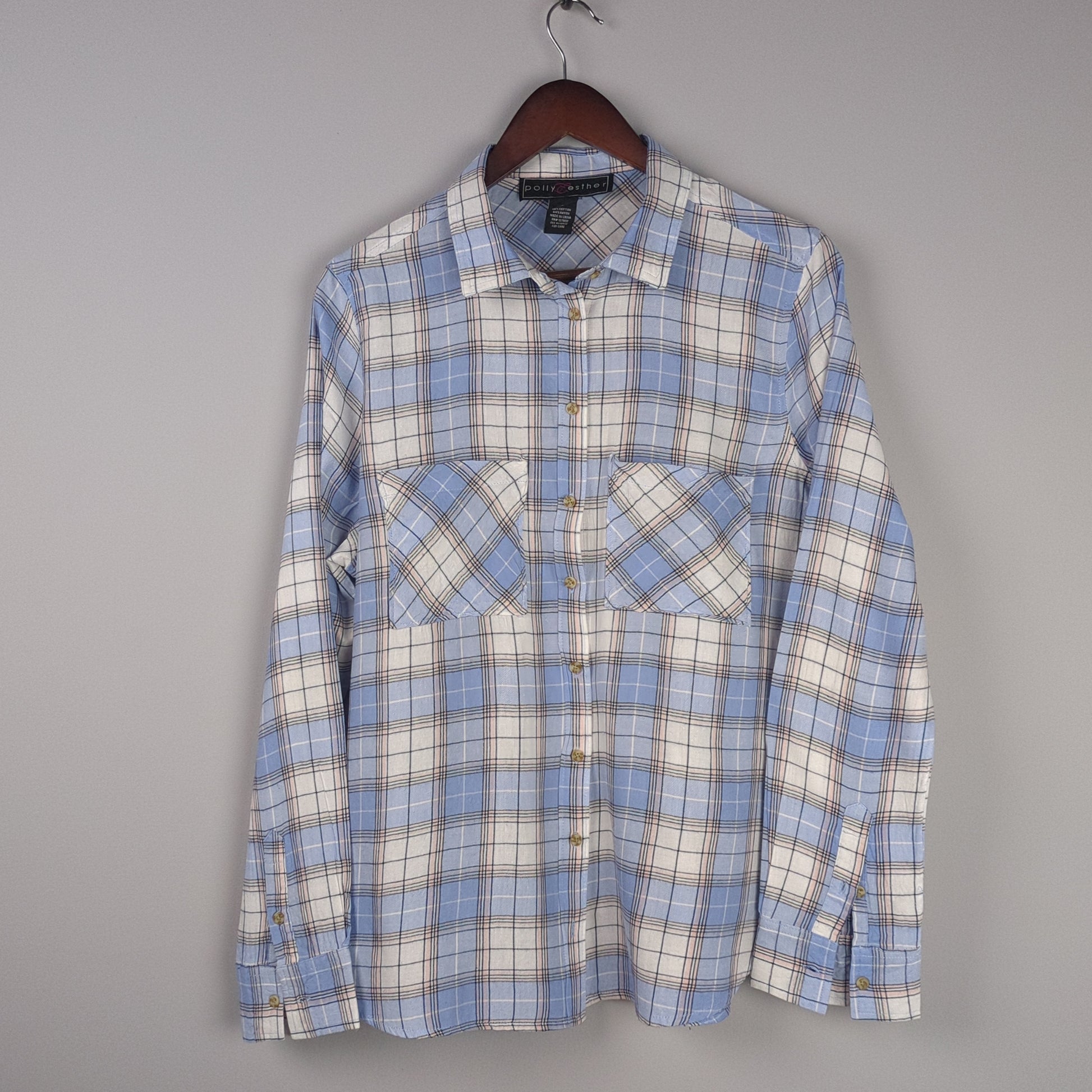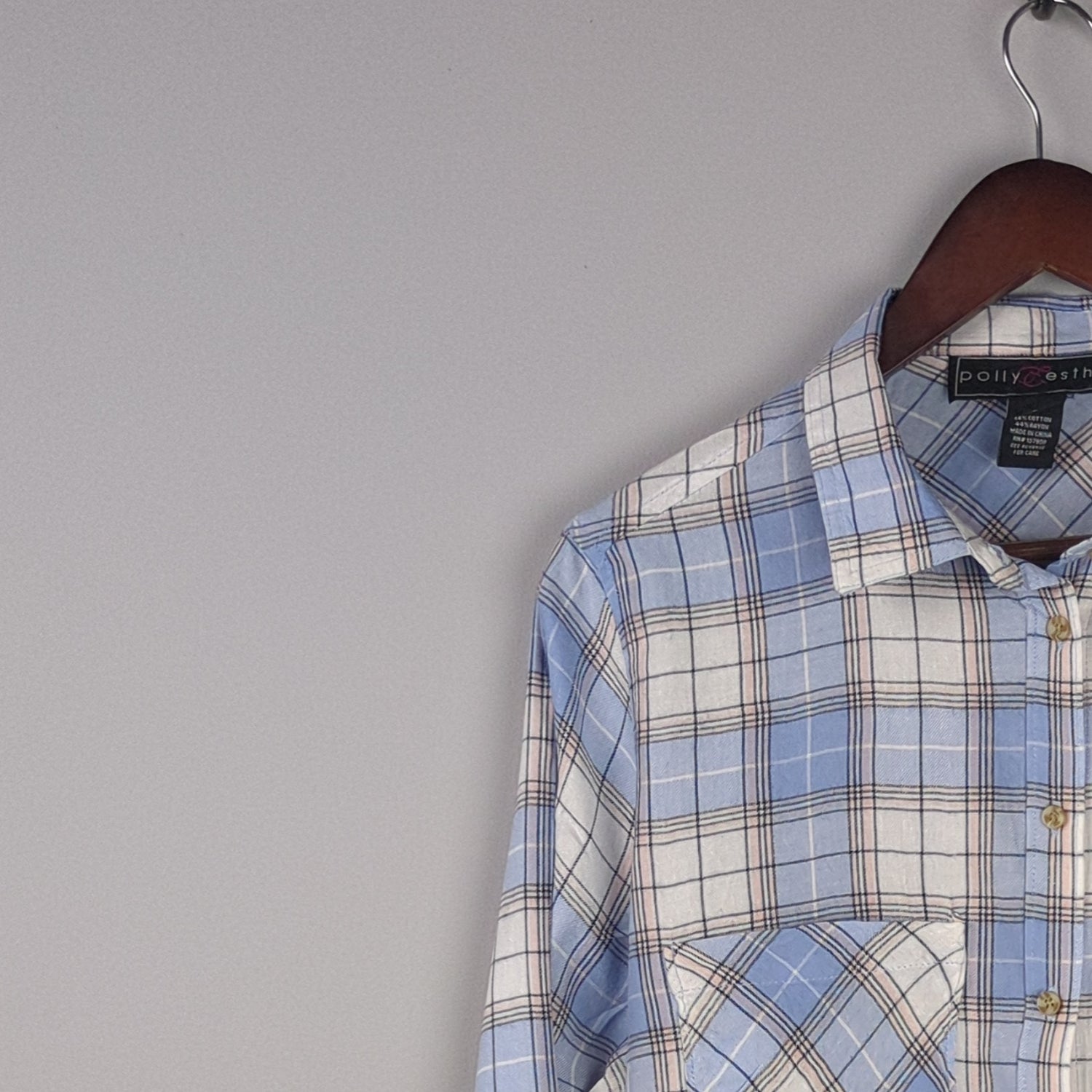 This light blue and white plaid button-down shirt is a versatile piece for any wardrobe.