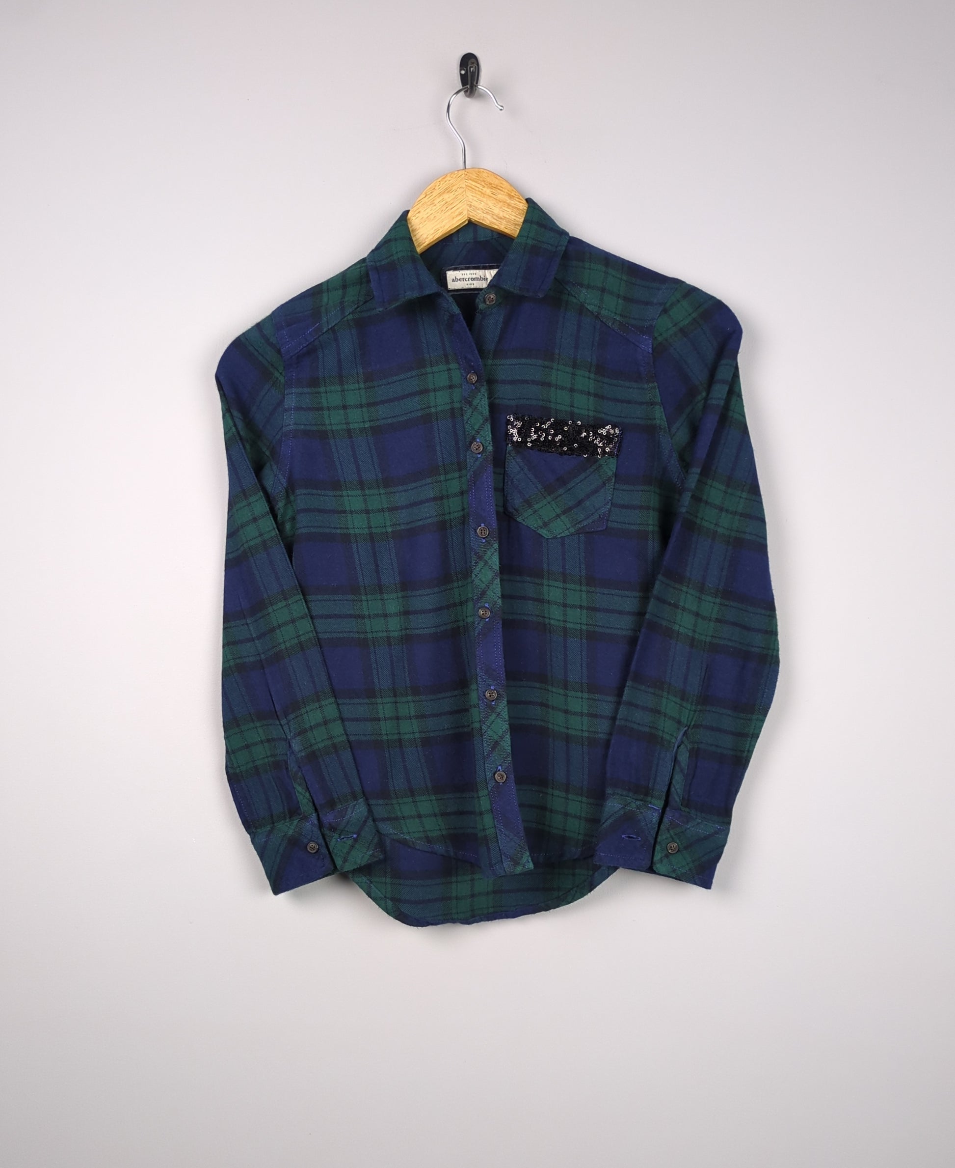 This blue and green plaid button-down shirt features a sequined pocket detail for a touch of sparkle.