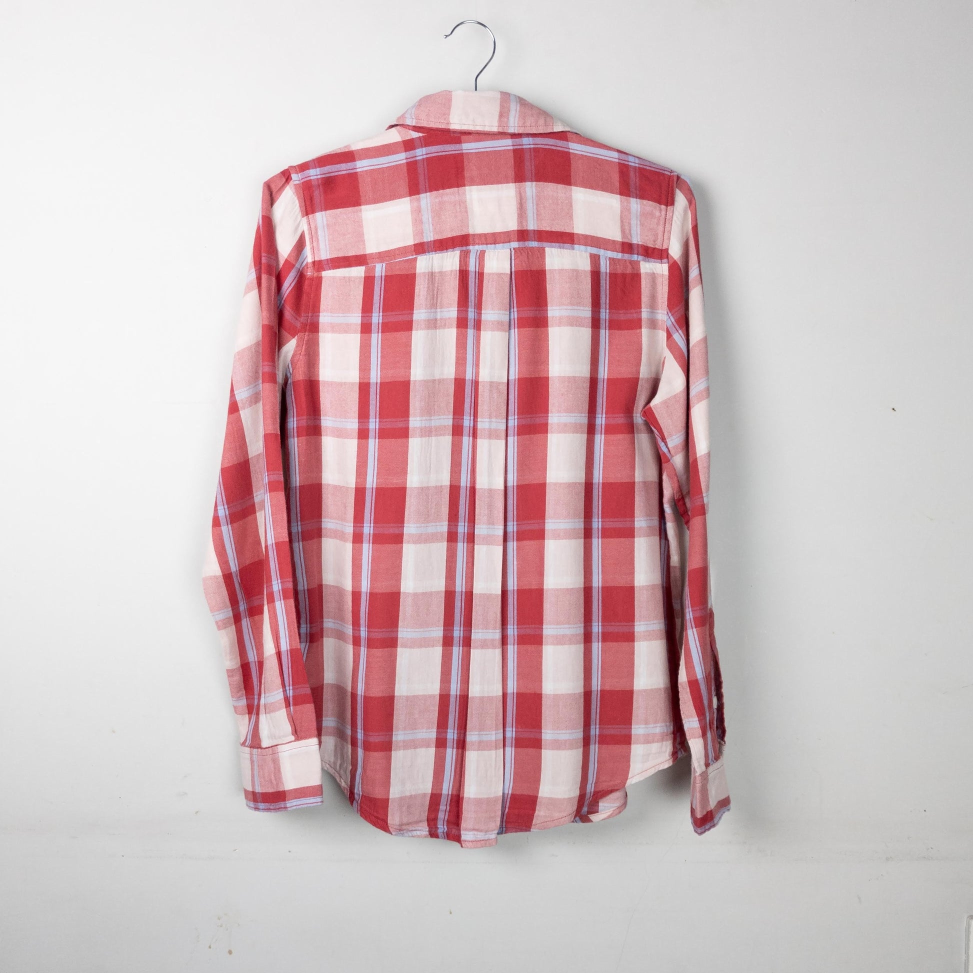 This long-sleeved shirt features a red, white, and light blue plaid pattern and classic button-down style.