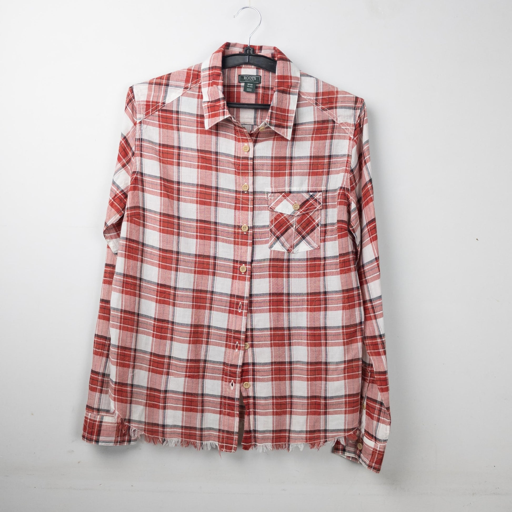 A classic long-sleeve flannel shirt featuring a red and white plaid pattern with styled frayed hems, perfect for casual outings.