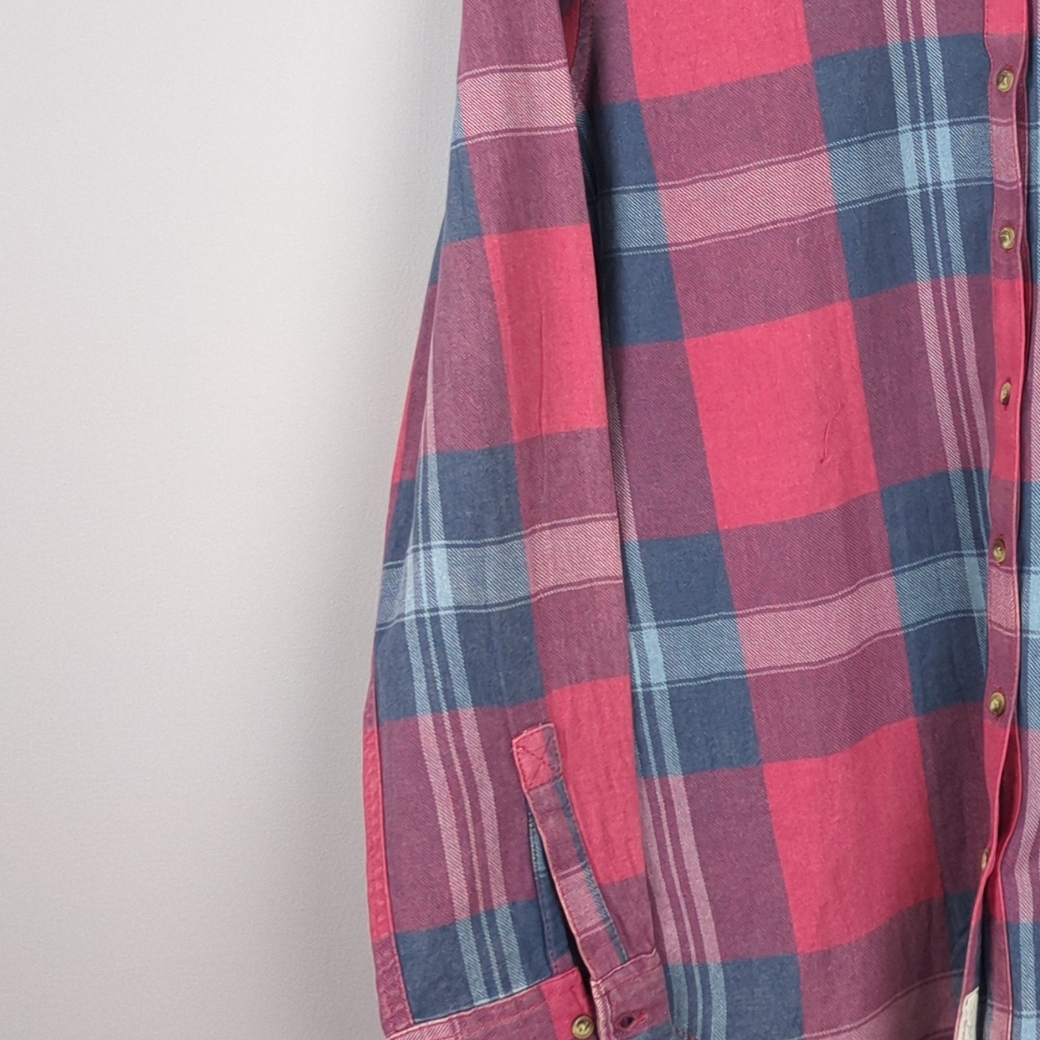 This pink and blue plaid button-down shirt is a versatile piece that can be dressed up or down.
