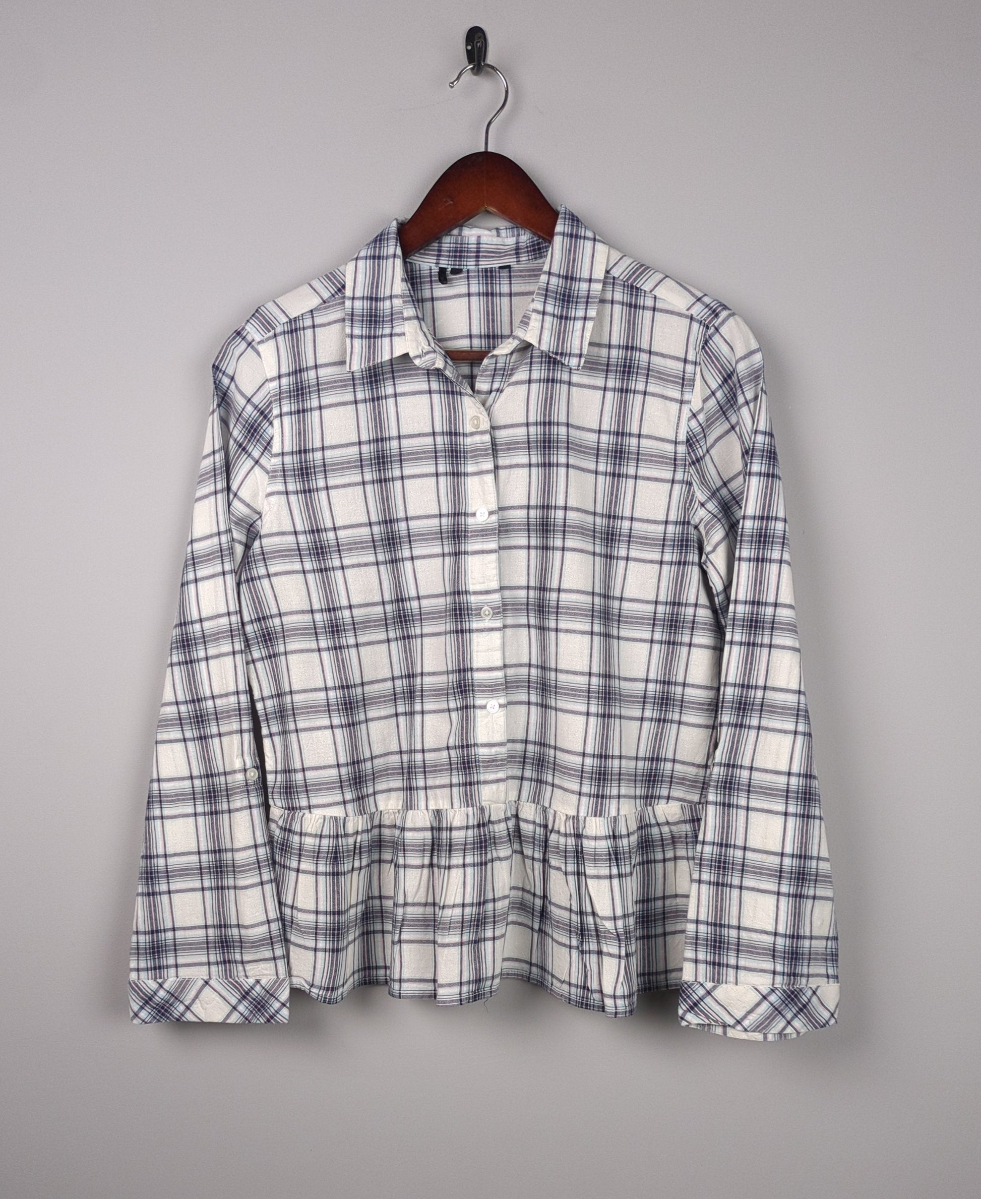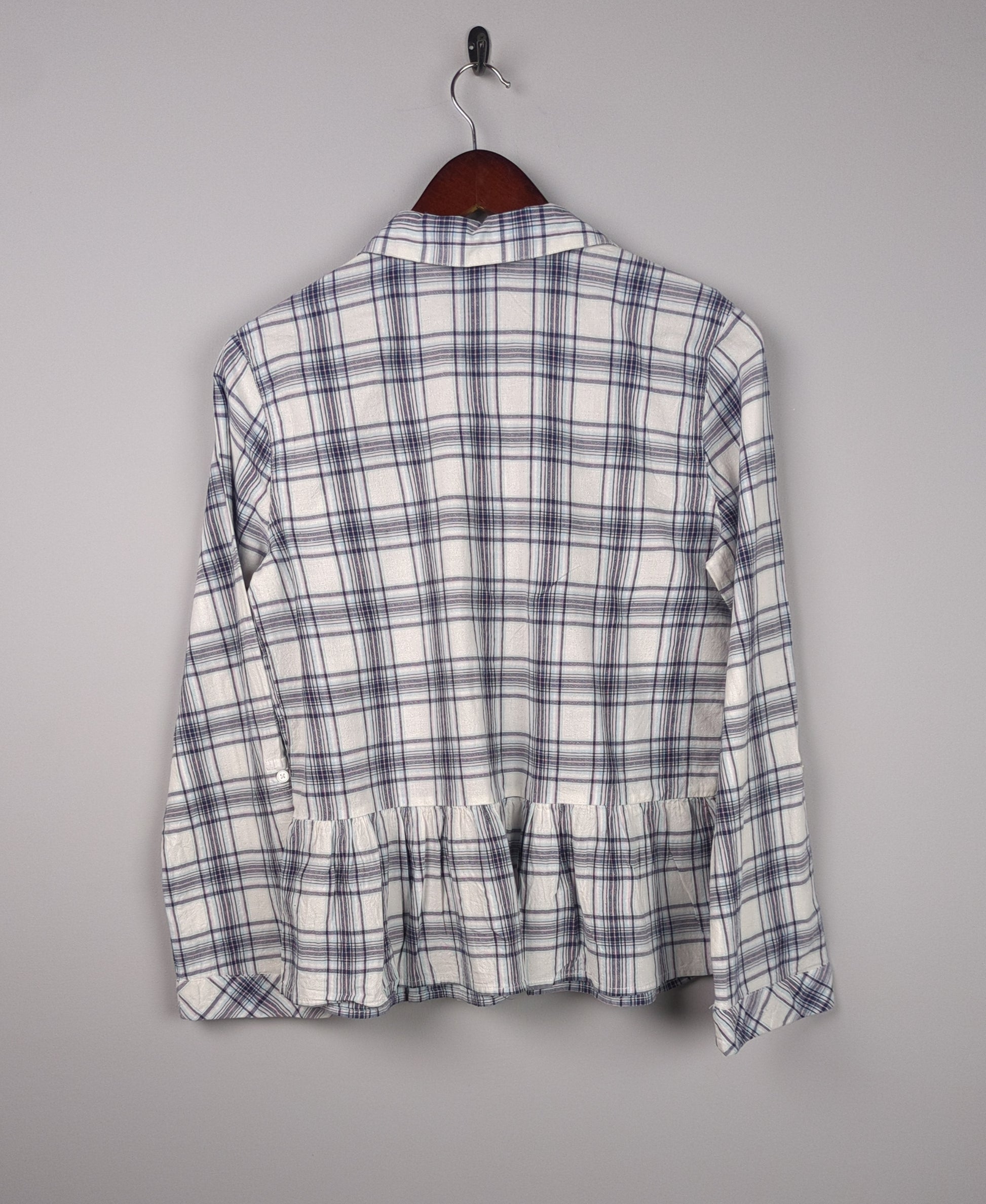 This white and blue plaid peplum top features a button-down collar and long sleeves.