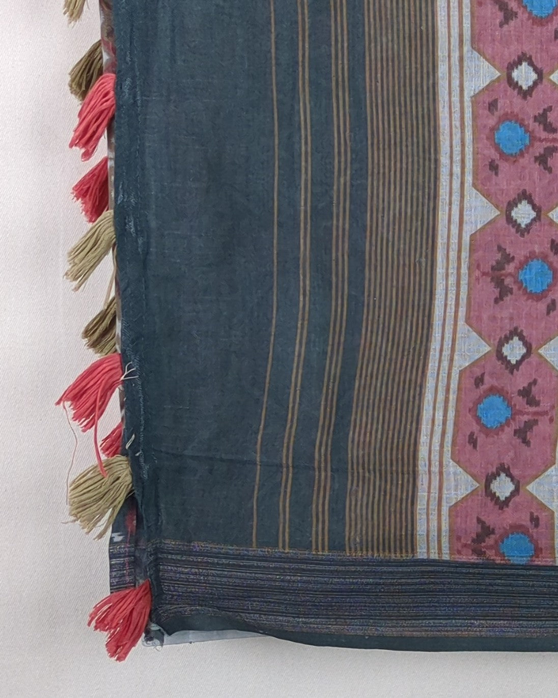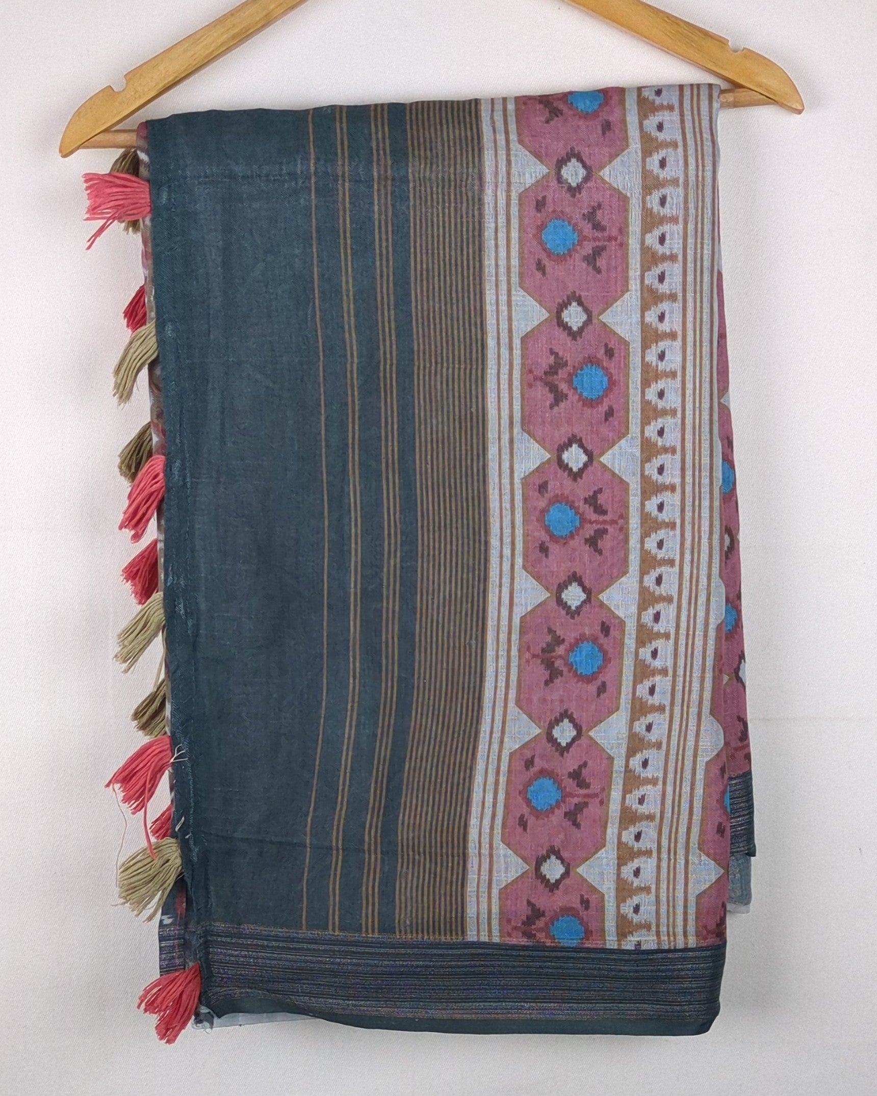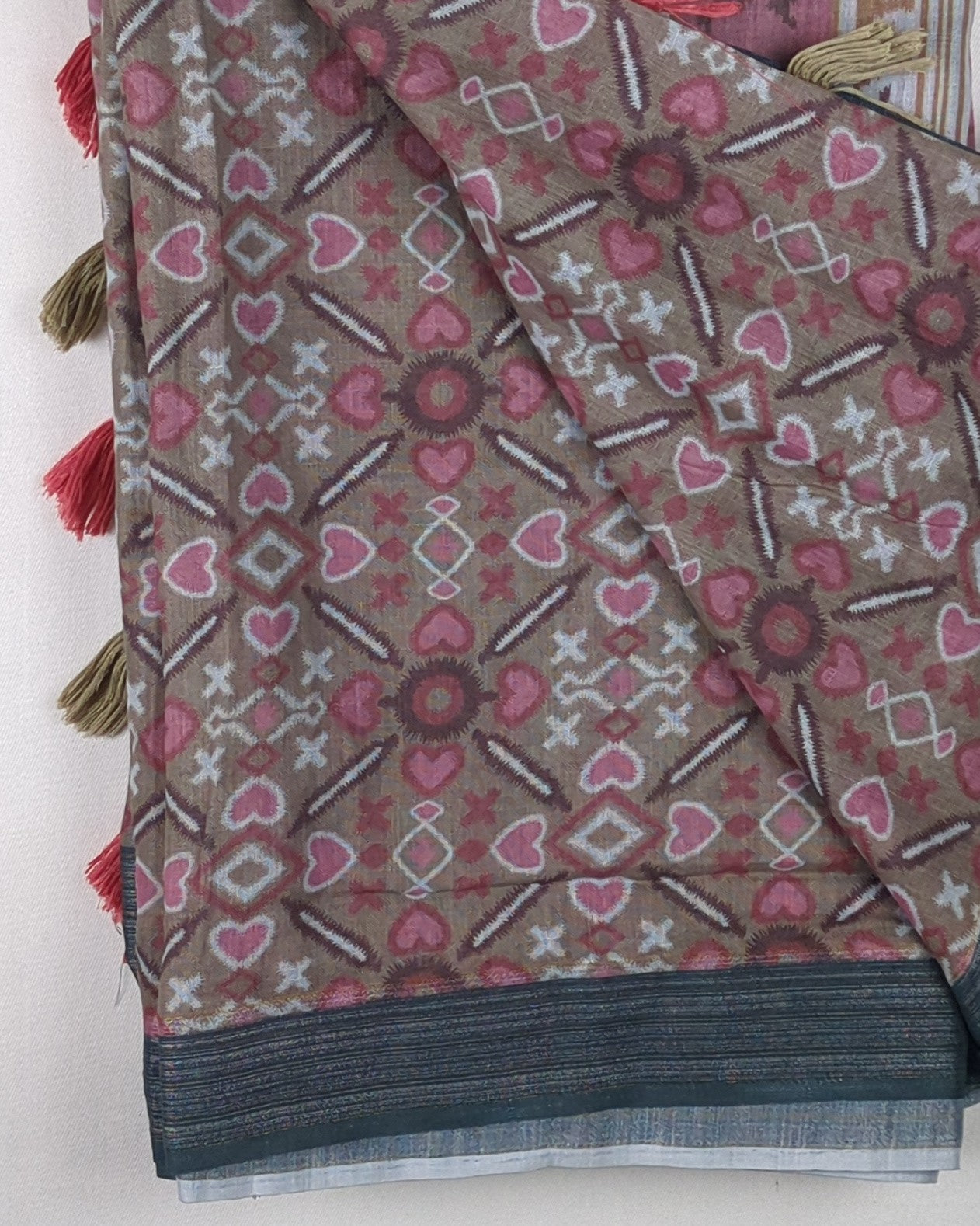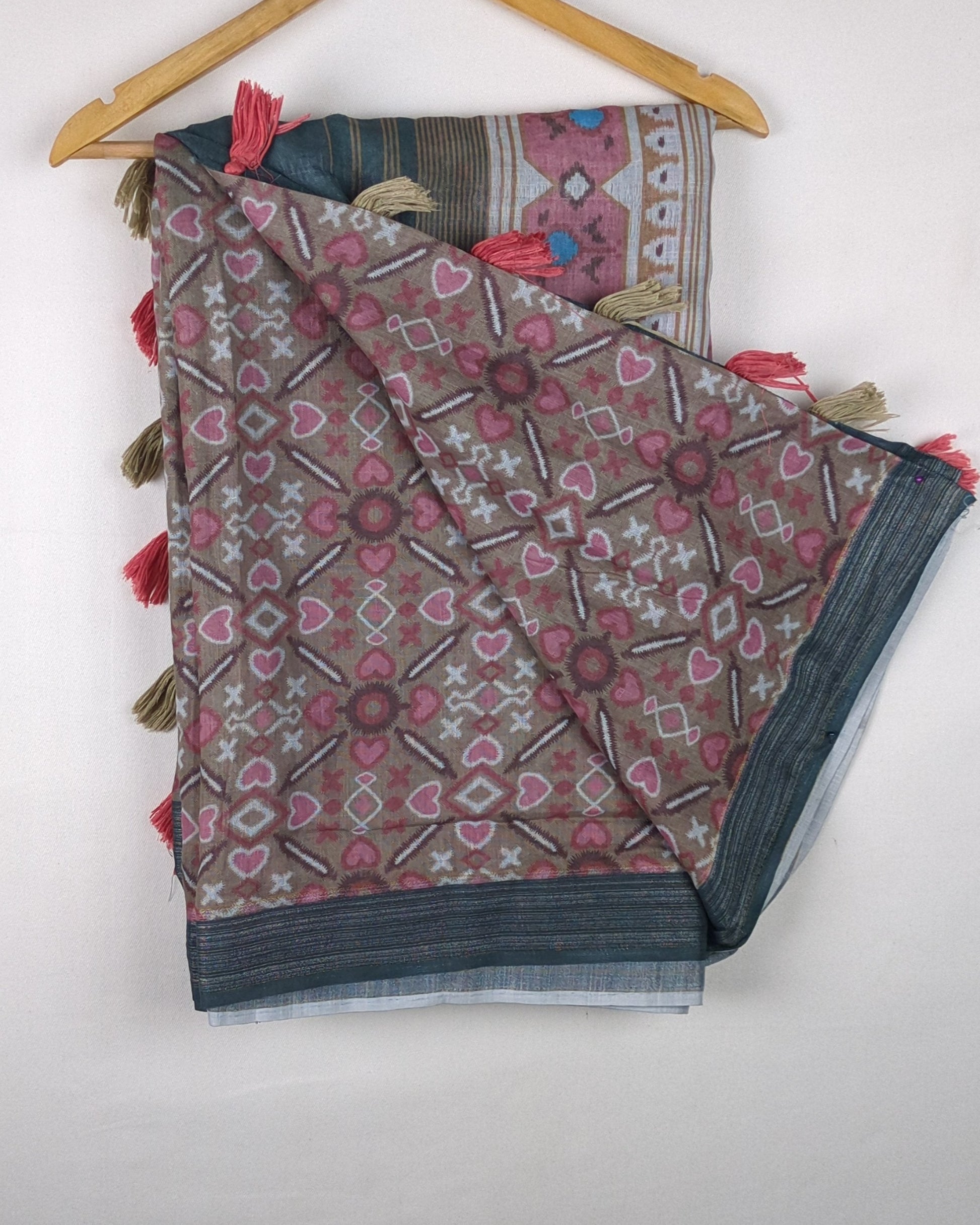 Grey and pink geometric print saree featuring distinct tribal motifs and colorful tassel details on the pallu.