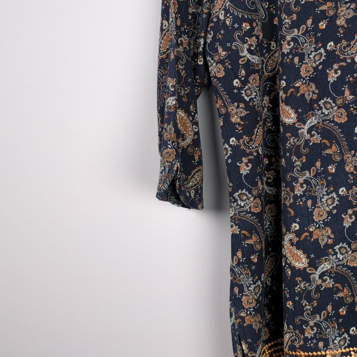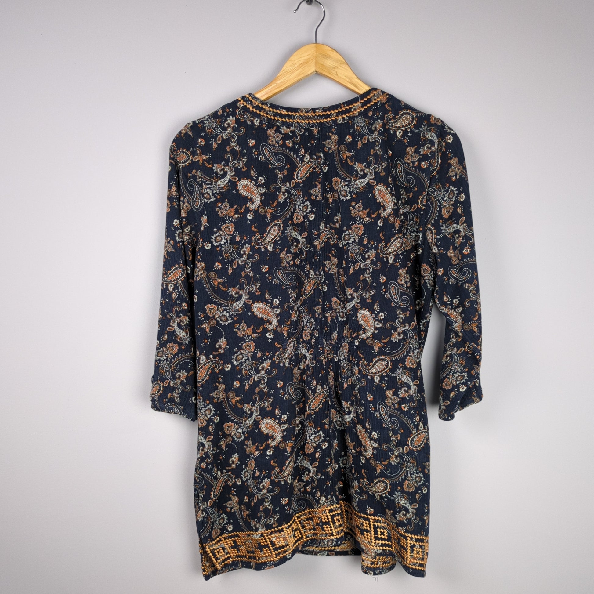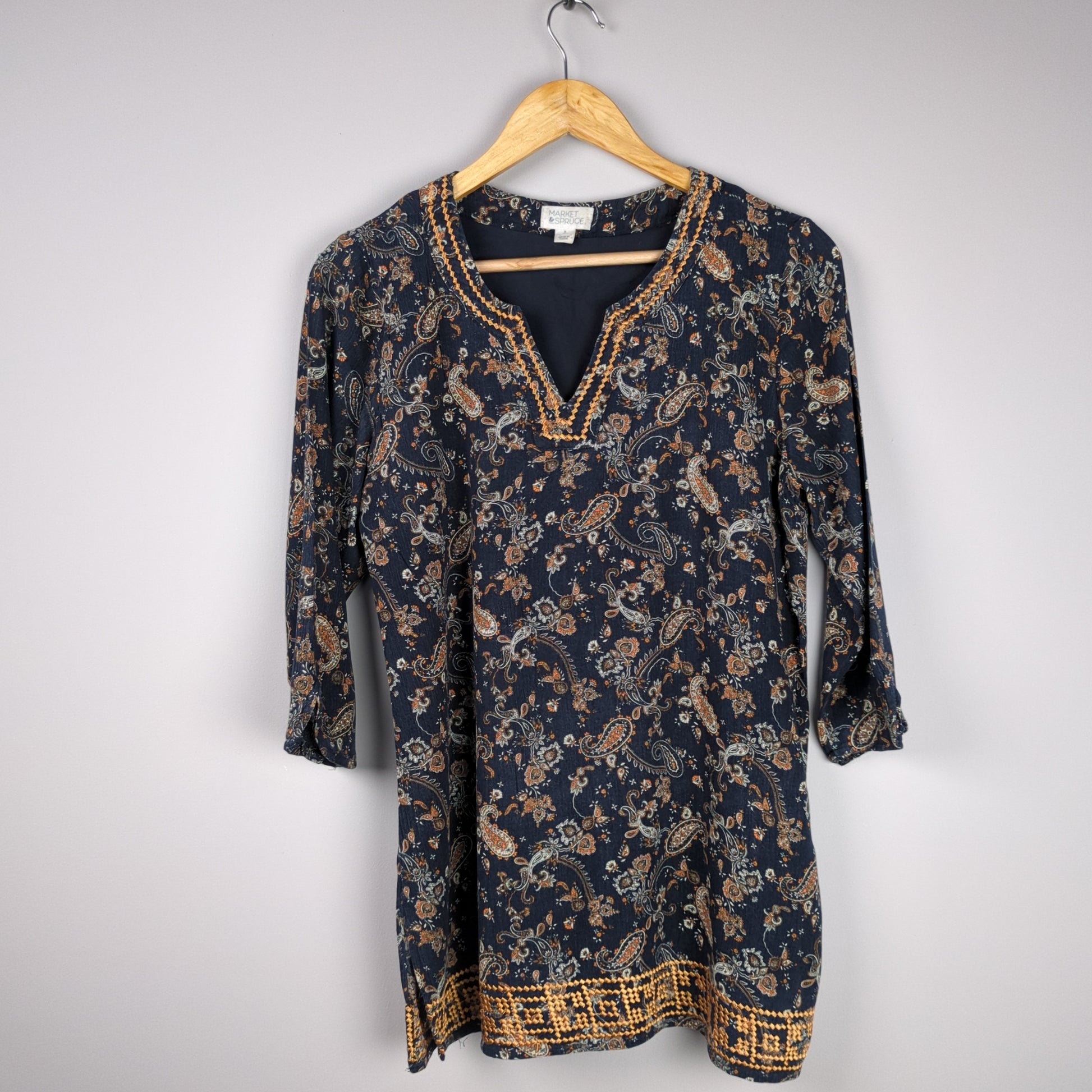 This navy blue tunic features a paisley print and orange embroidered neckline and hem.