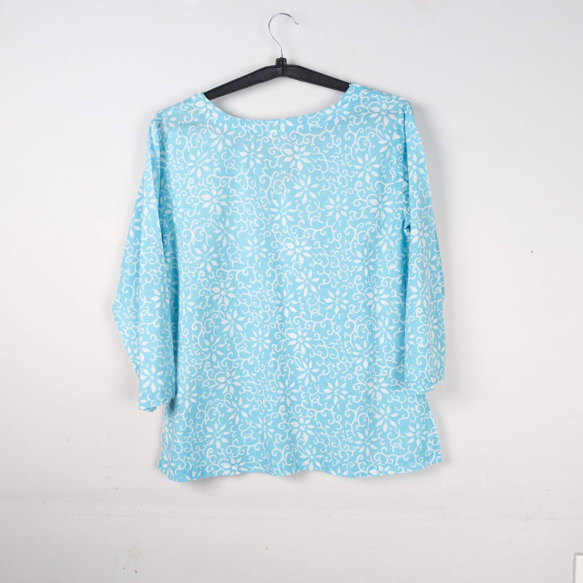 This is a charming, light blue short kurti with an all-over white floral print and a flattering V-neck.