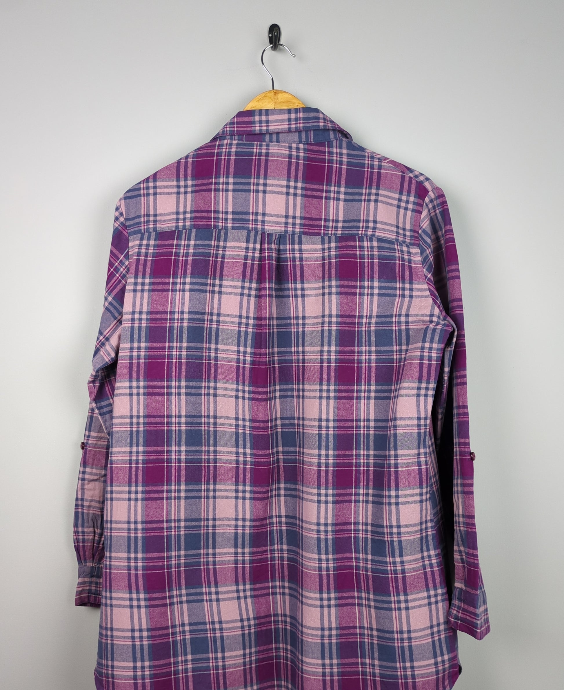 This purple and blue plaid button-down shirt is perfect for a casual everyday look.