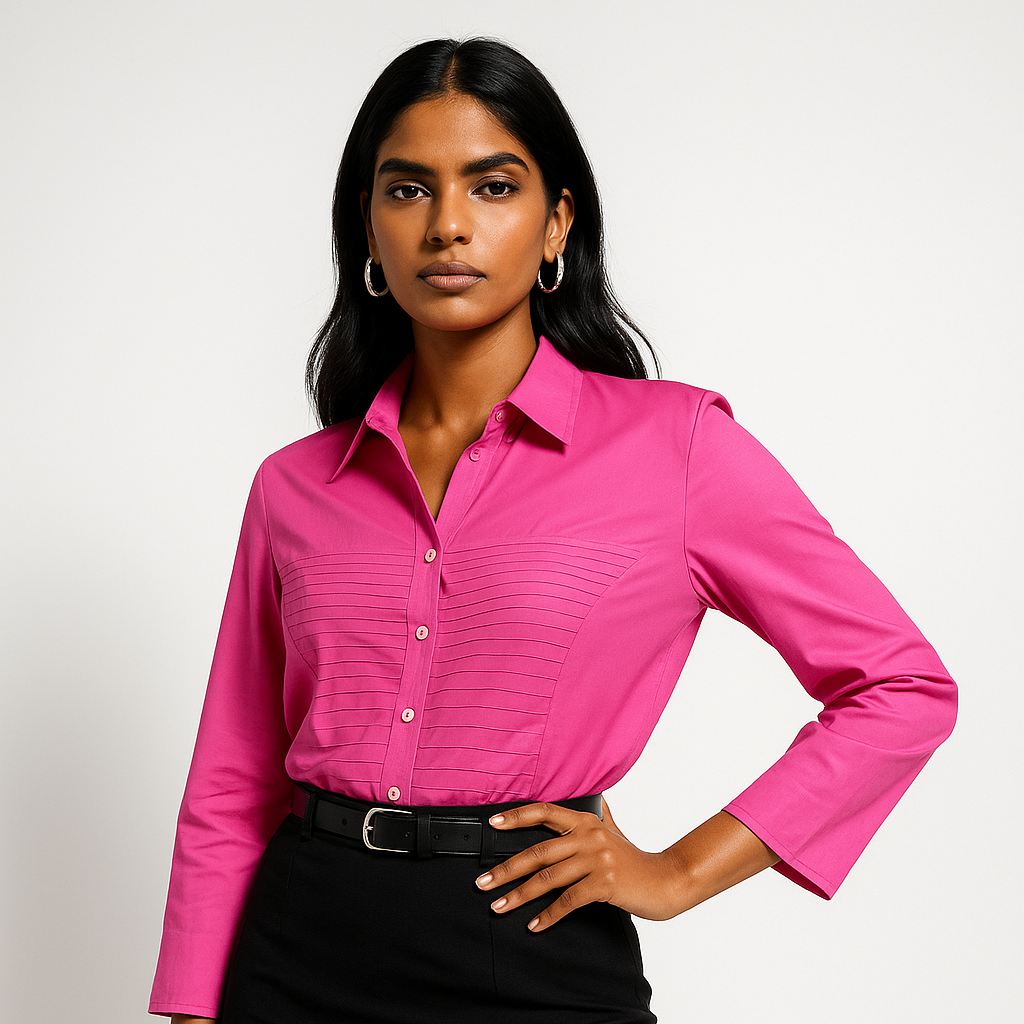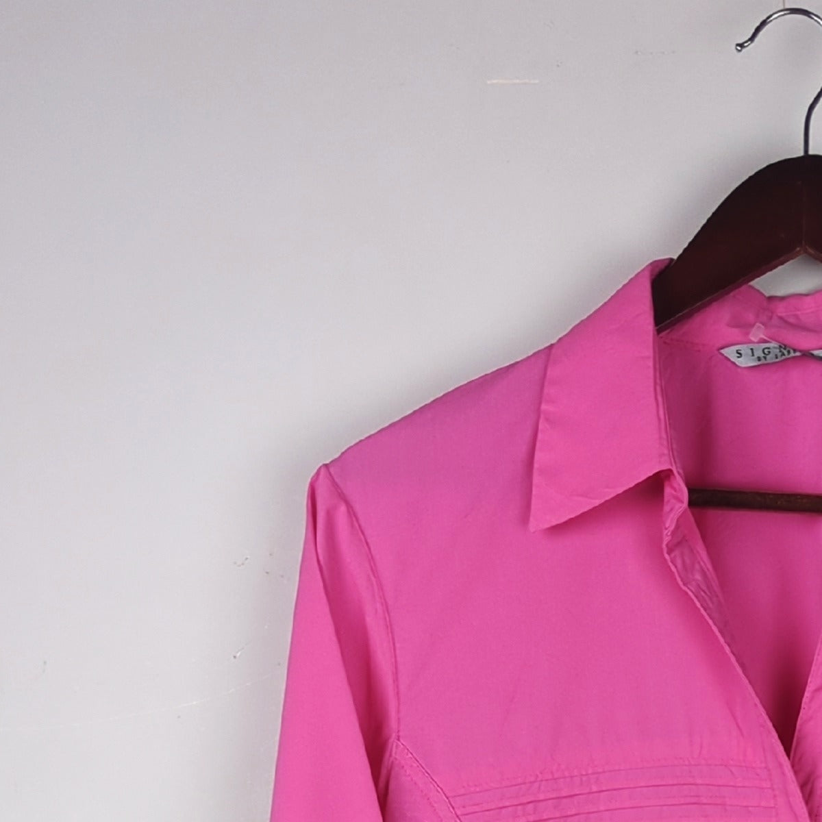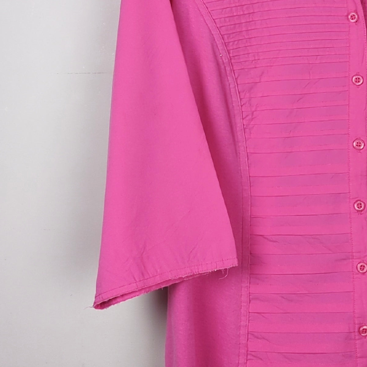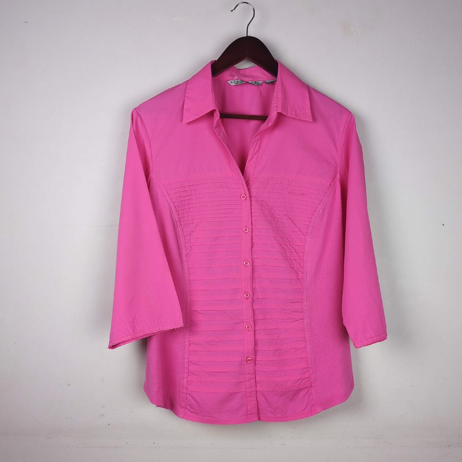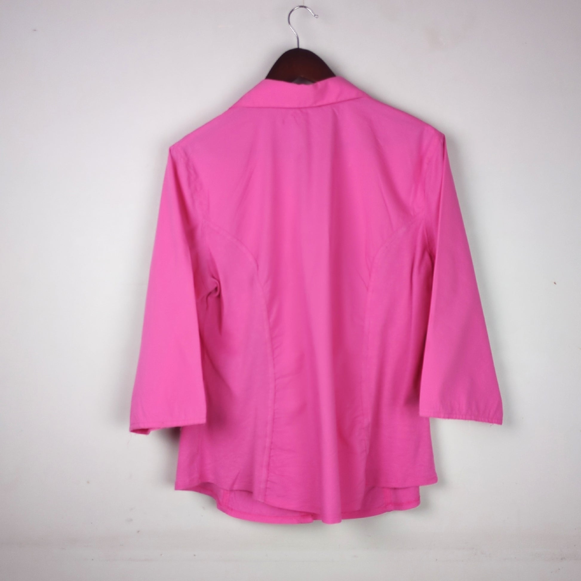 This is a stylish pink blouse with a button-down front, perfect for a casual yet polished look.