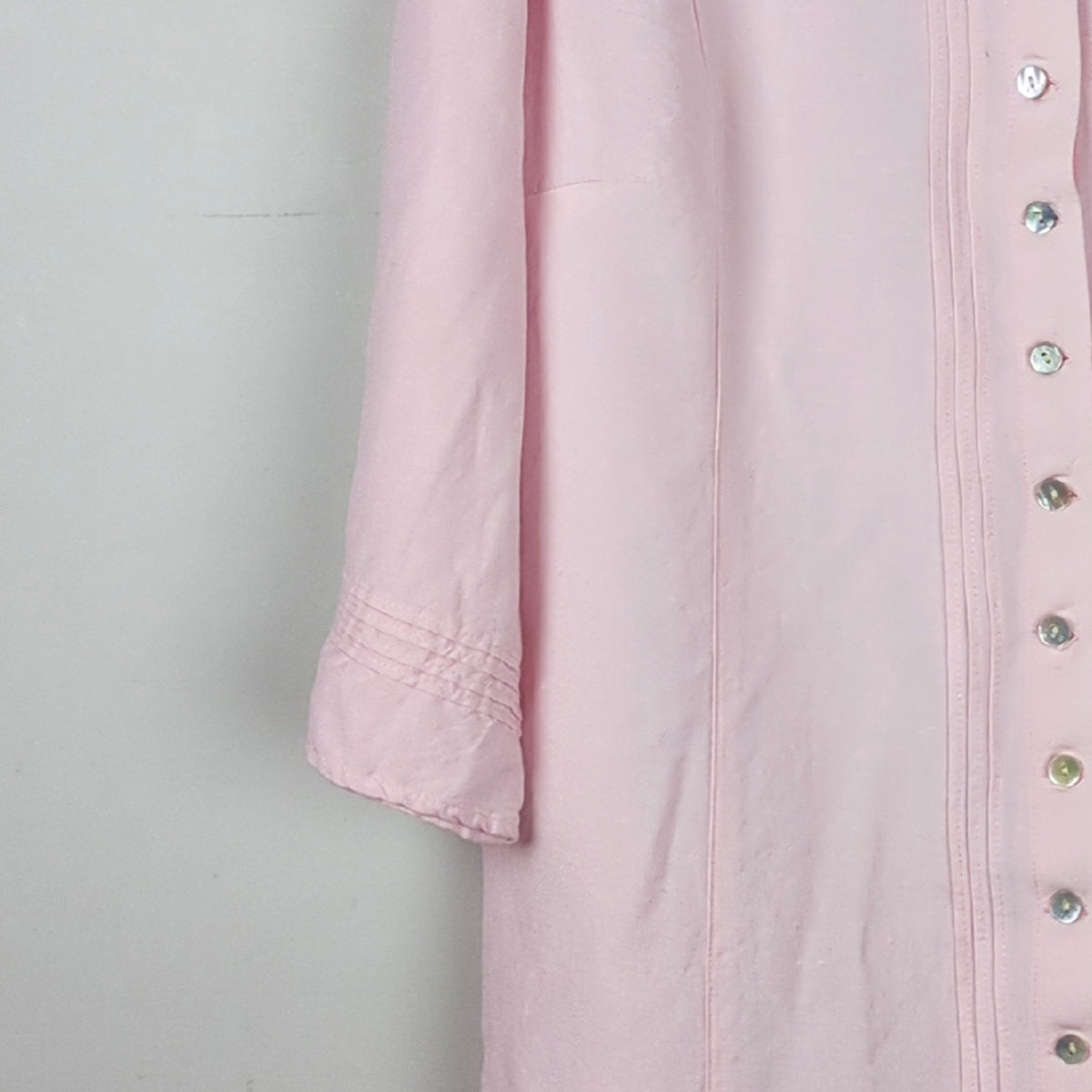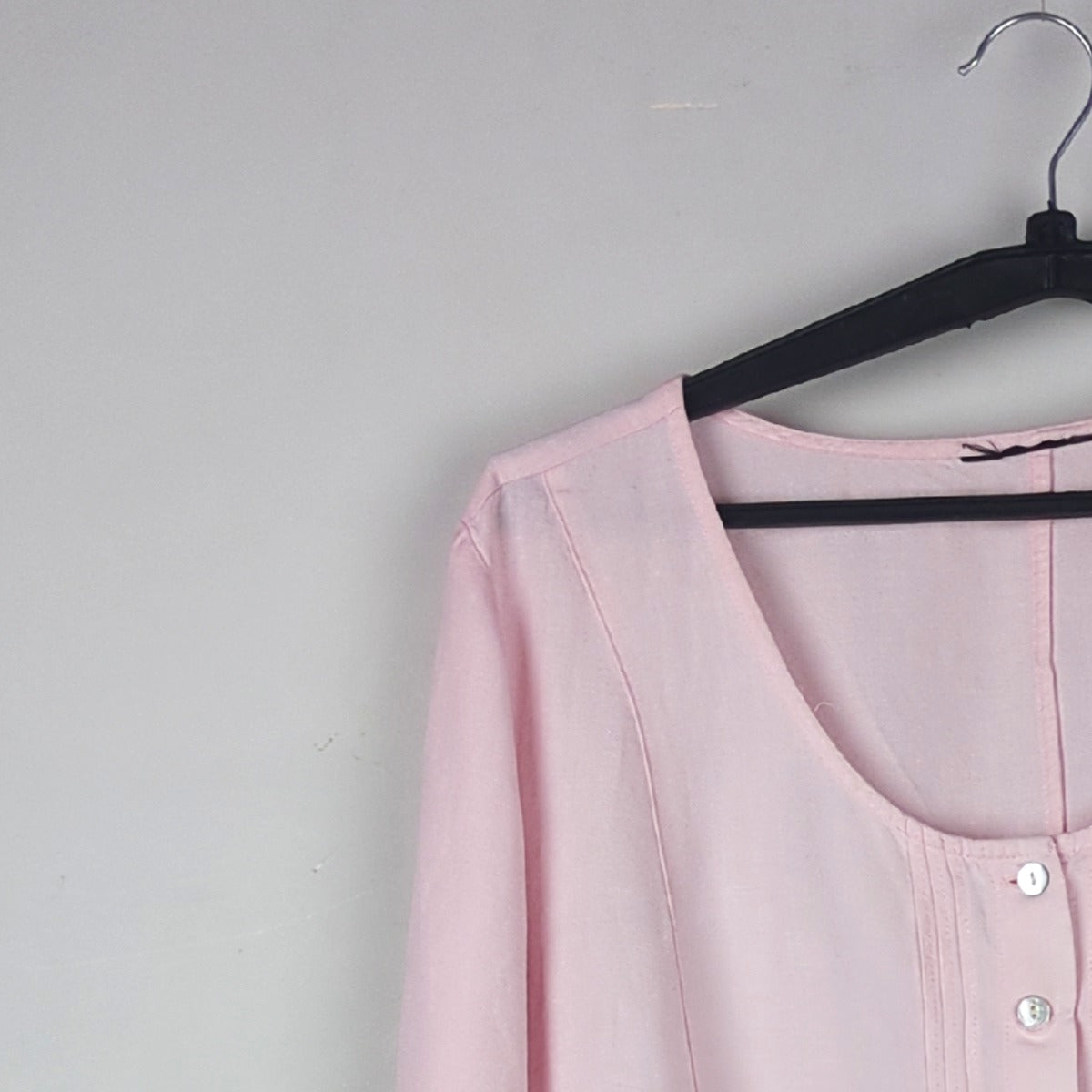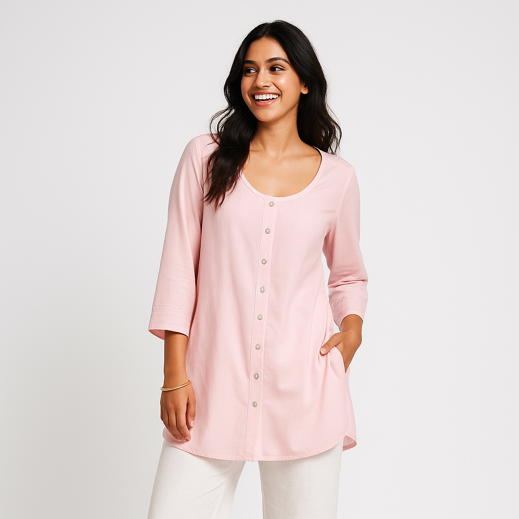This charming long-sleeve top features a button-down design in a lovely pink hue.