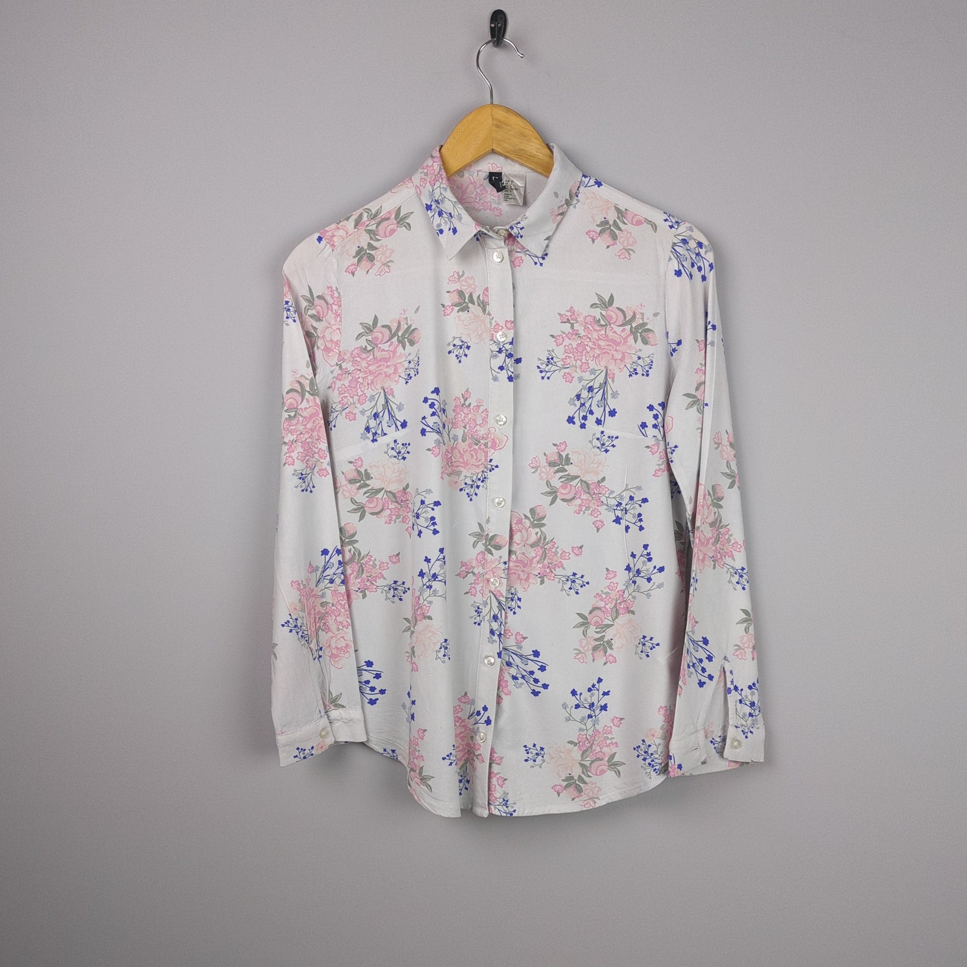 This white button-down shirt features a delicate pink and blue floral print, perfect for adding a touch of femininity to any outfit.