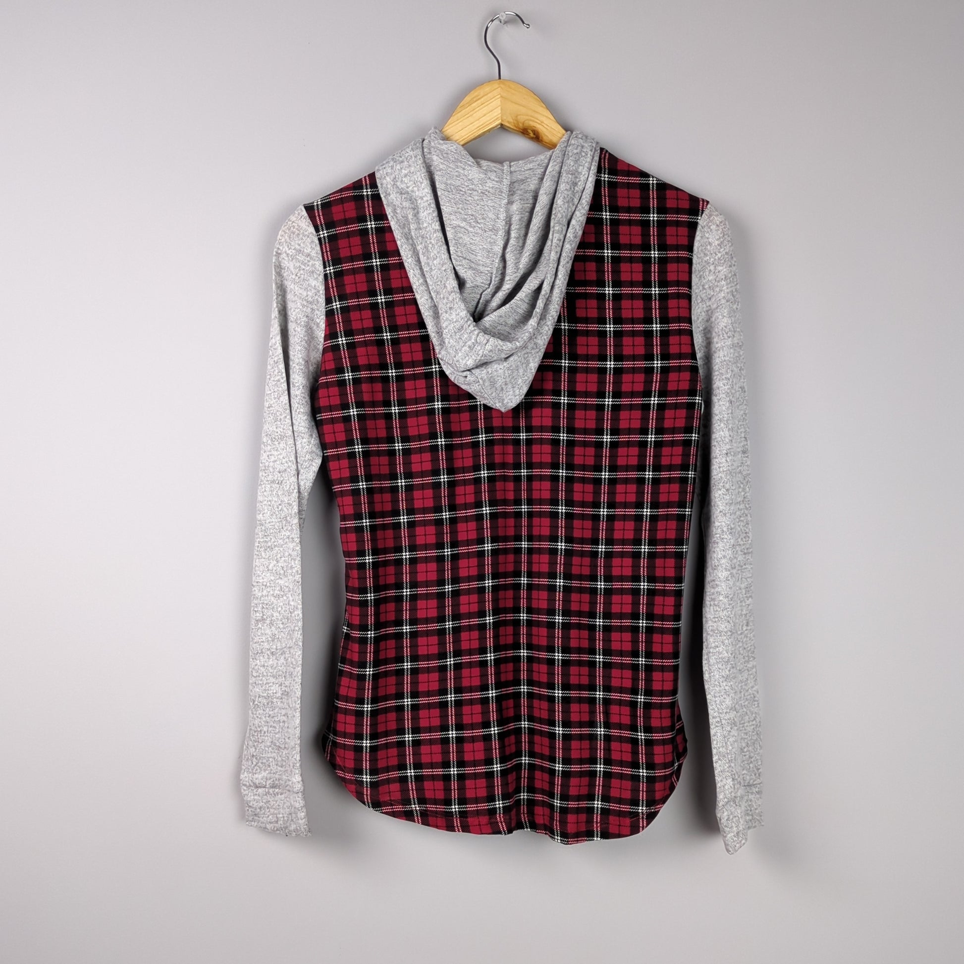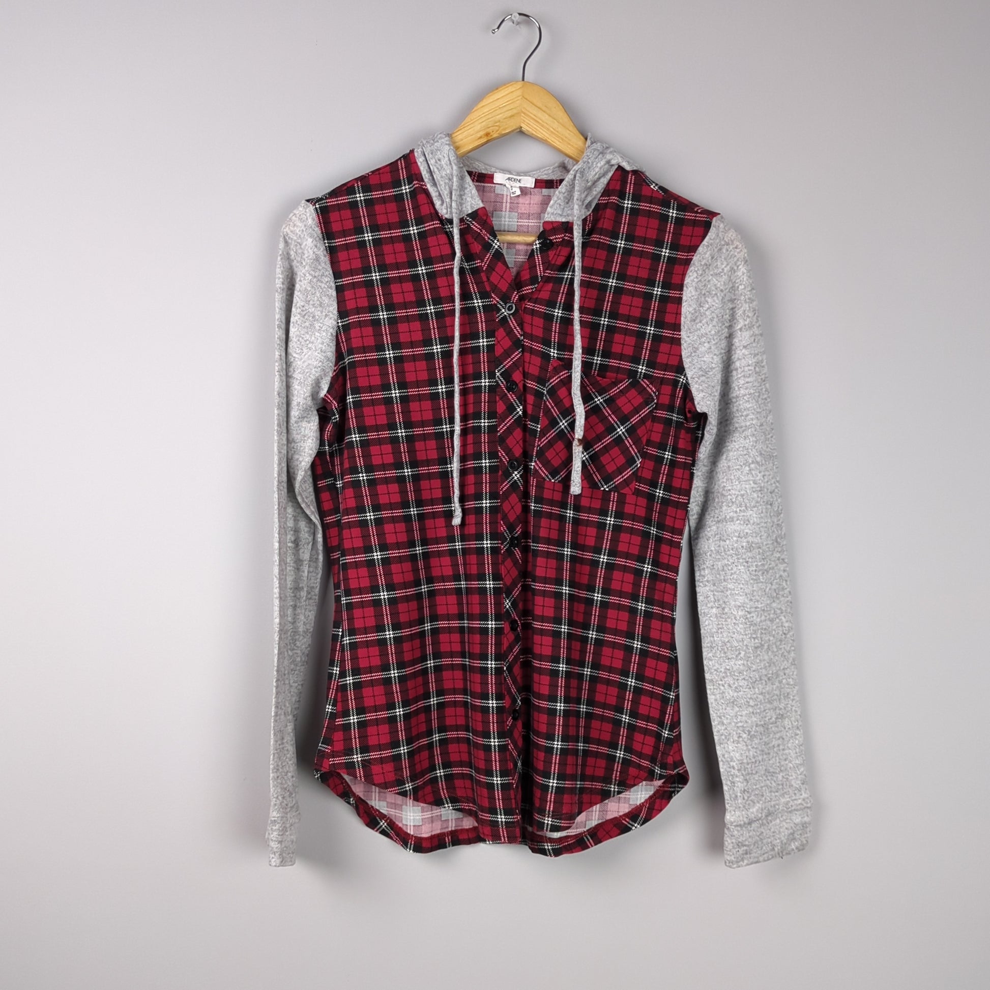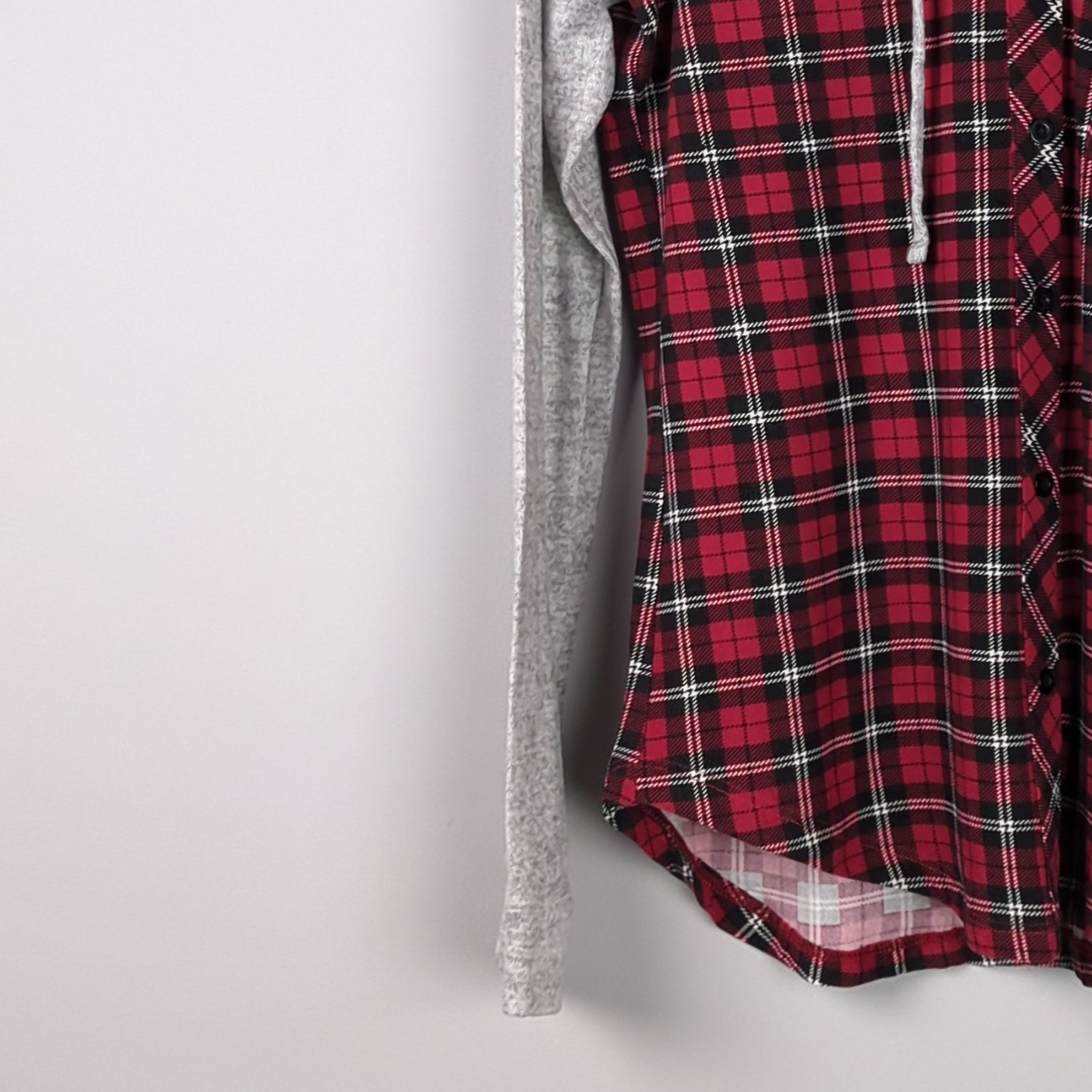 This charming button-up features a plaid design with contrasting grey heather long sleeves and a comfortable hood.